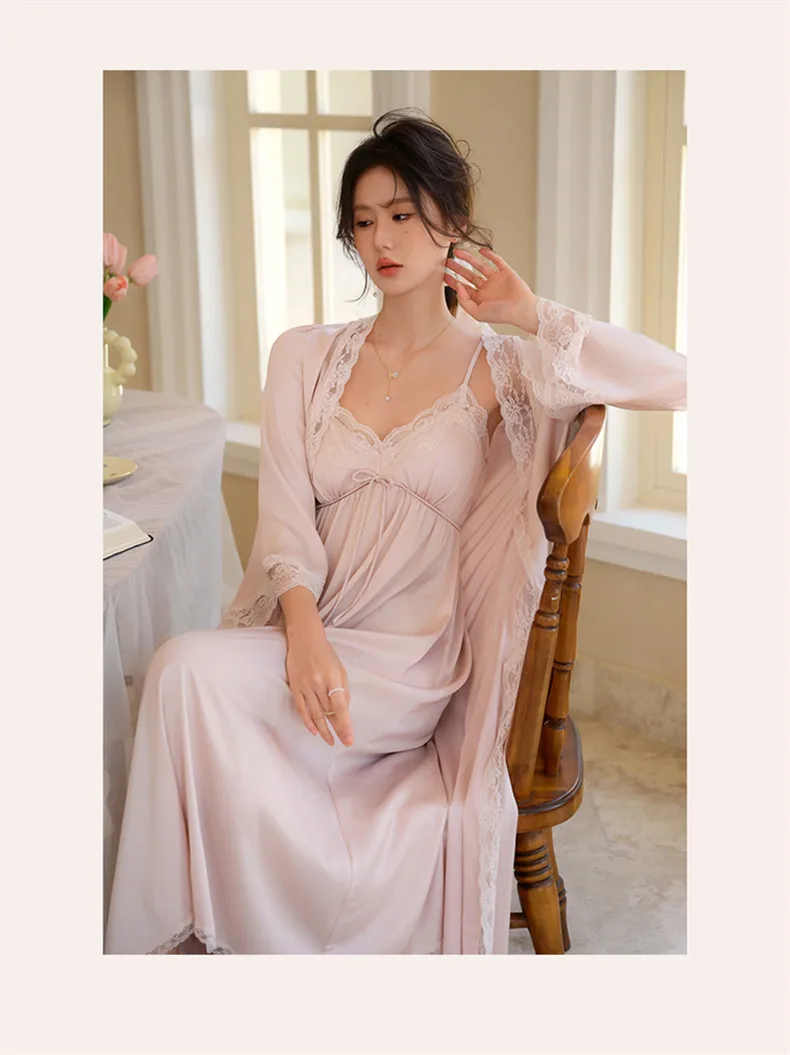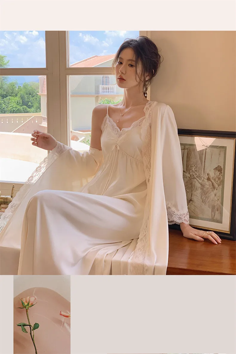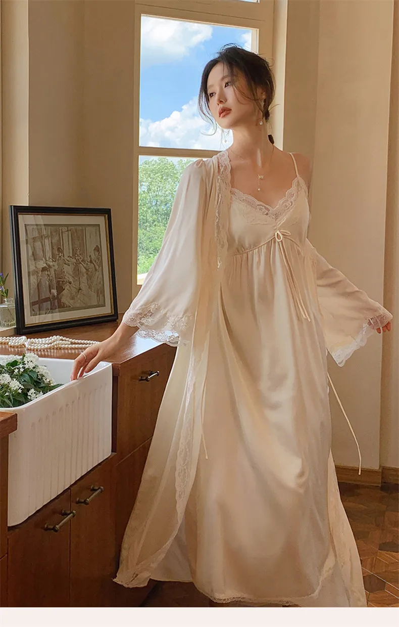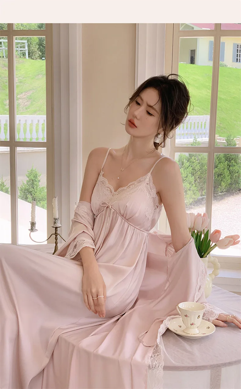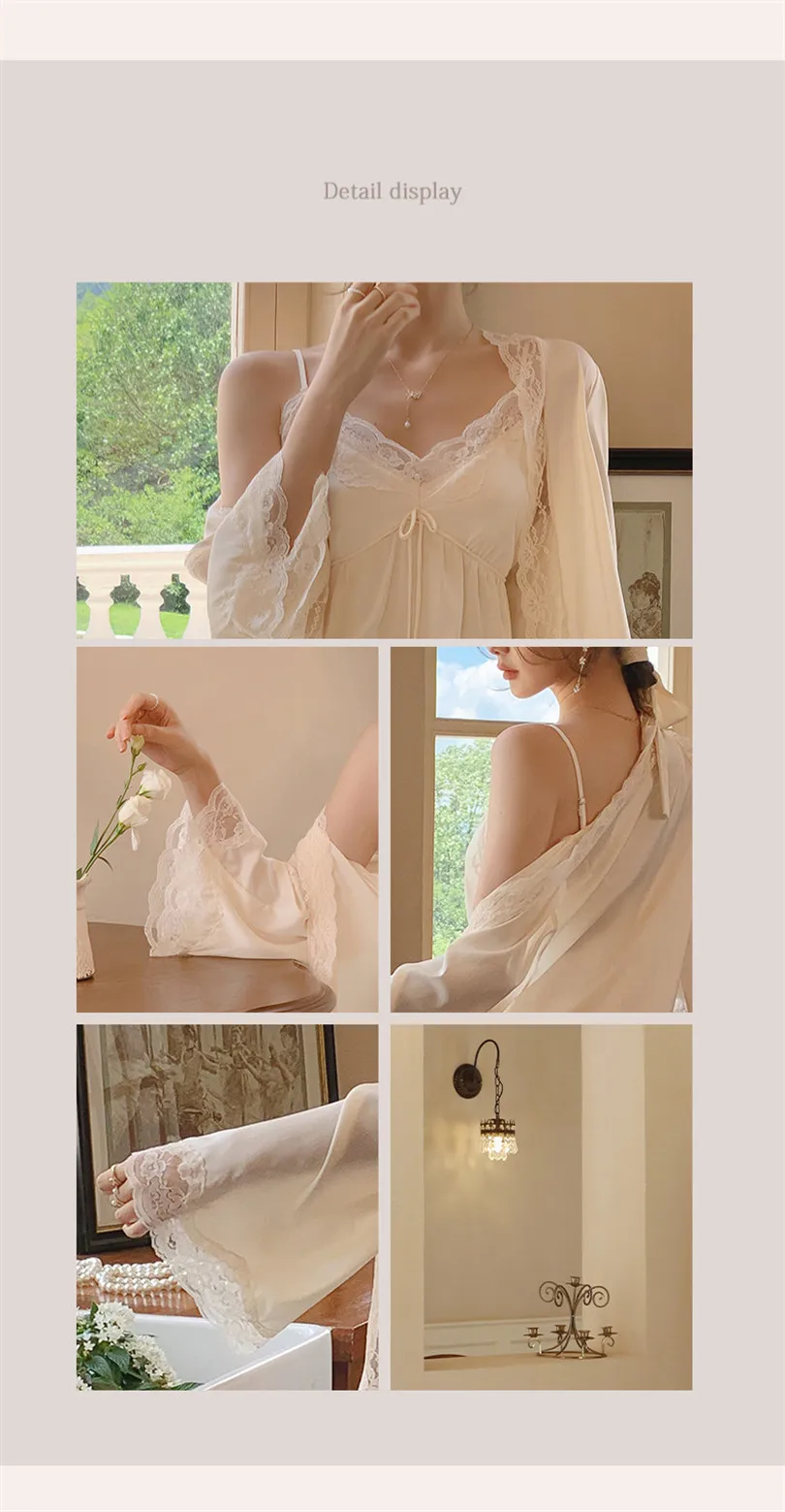Cyflymder Women French Thin Style Sexy Two-Pieces Night Robe Lace V-Neck Spaghetti Strap Nightie Full Sleeves Loose Ice Silk Morning Robe