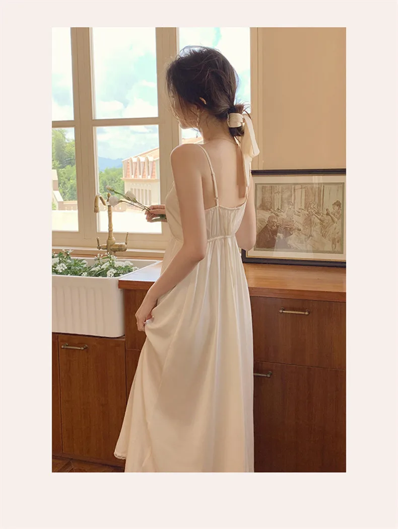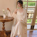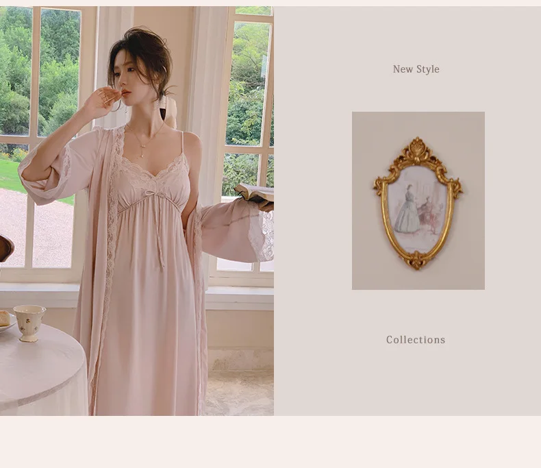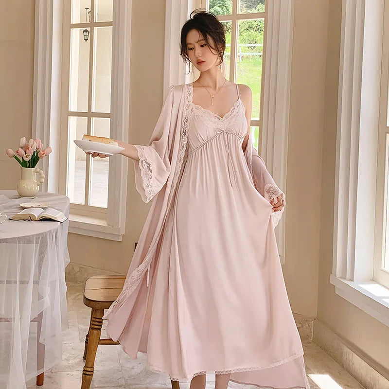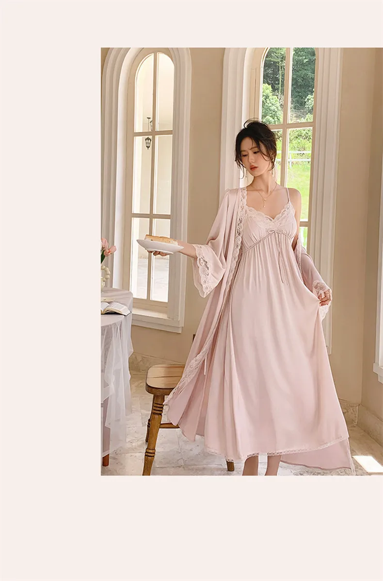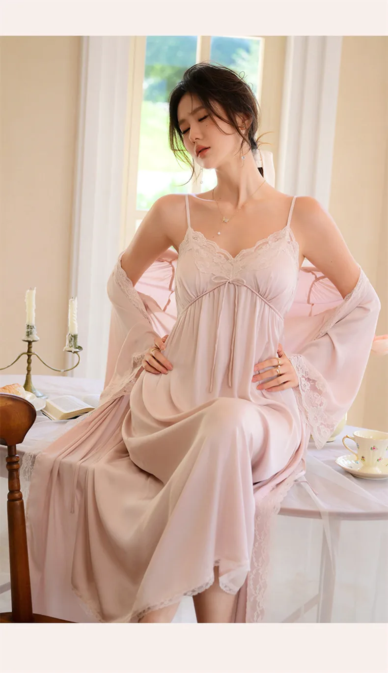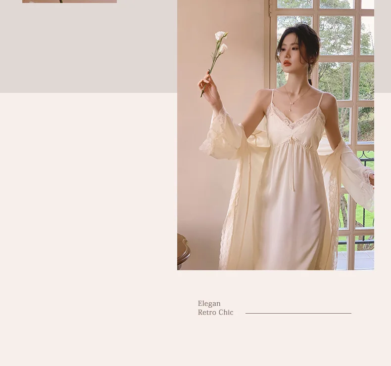 Cyflymder Women French Thin Style Sexy Two-Pieces Night Robe Lace V-Neck Spaghetti Strap Nightie Full Sleeves Loose Ice Silk Morning Robe