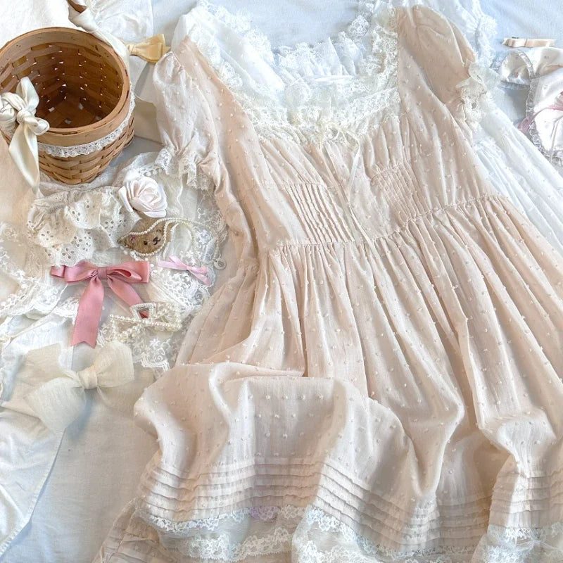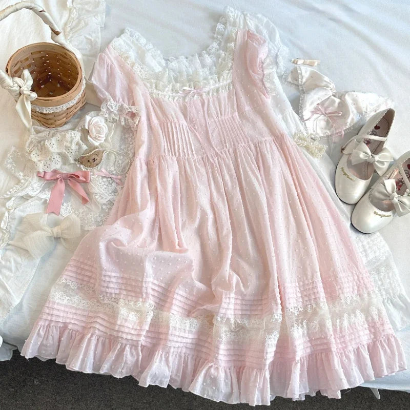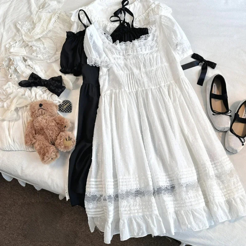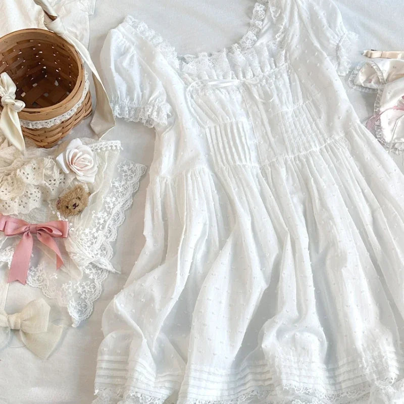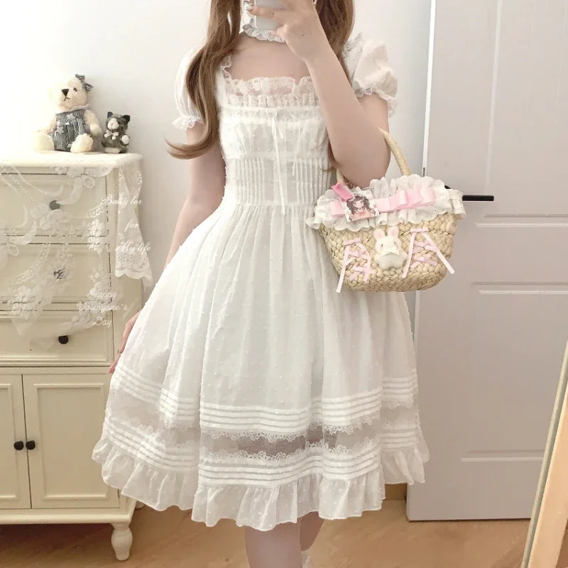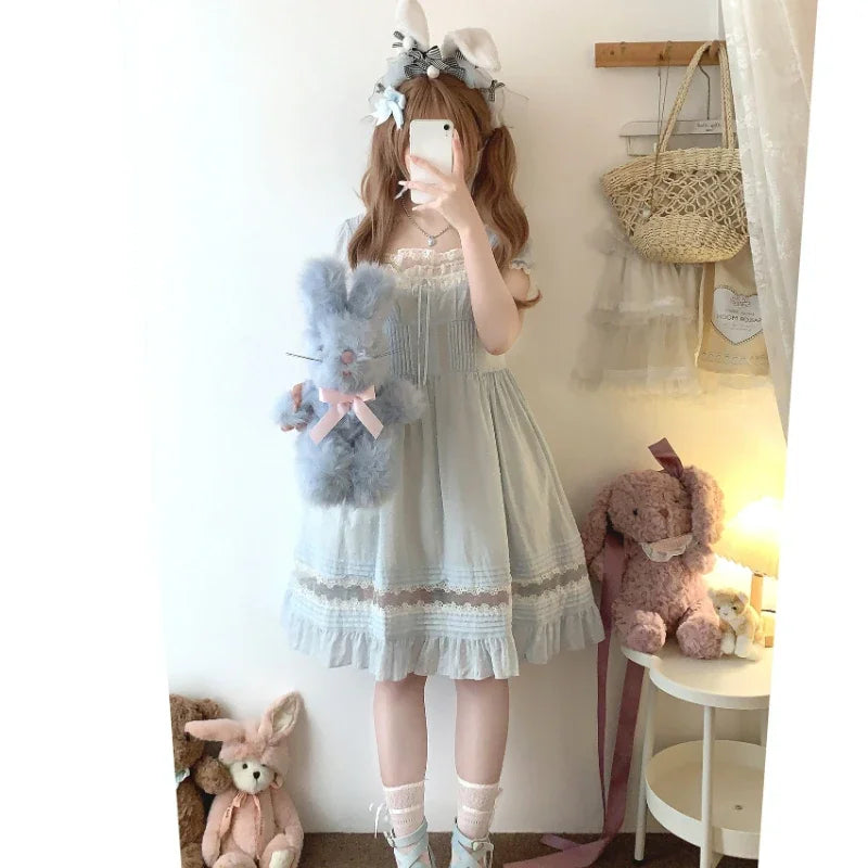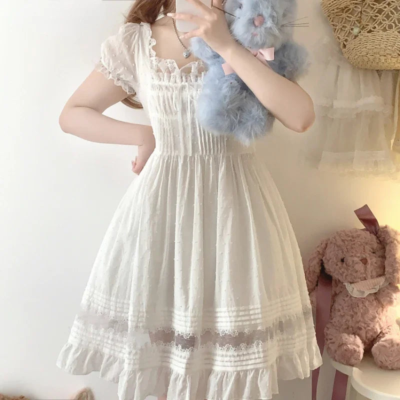 Cyflymder Women Japanese Kawaii Cute Lace Dress Square Neck Sweet Elegant Lolita Mini Fairy Dresses Korean Summer Party Princess Dress