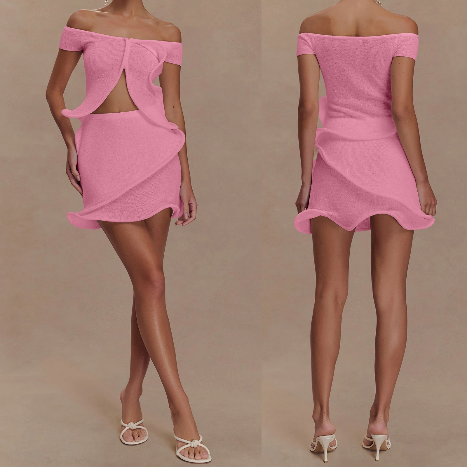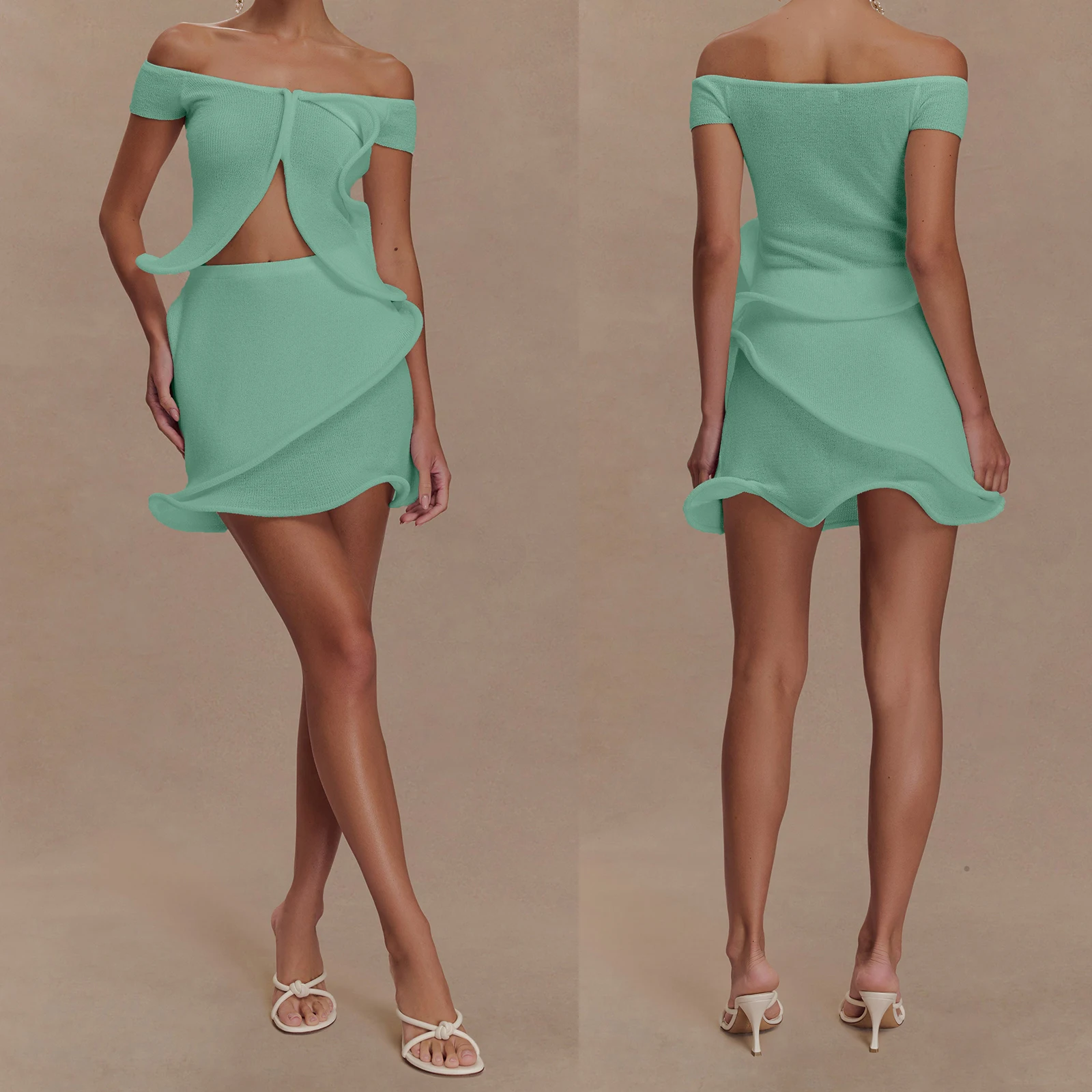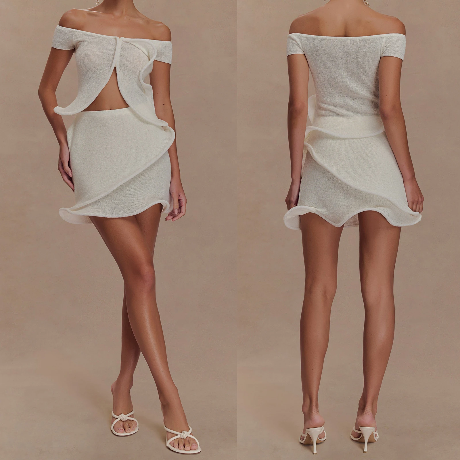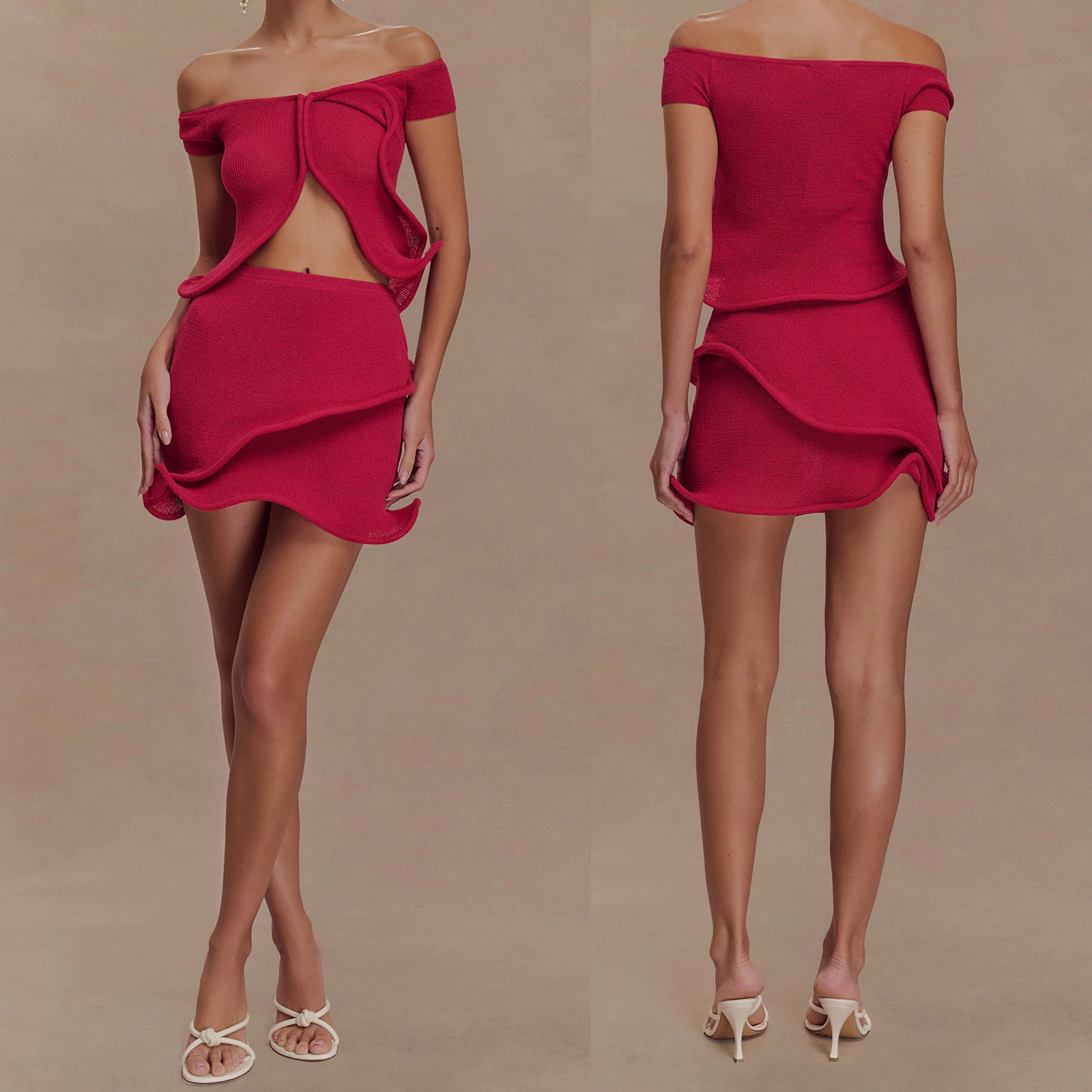 Cyflymder Women Knit Set y2k Clothes Off Shoulder Short Sleeve Slit Crop Top with High Waist Skirt Beach Party Clothing Clubwear