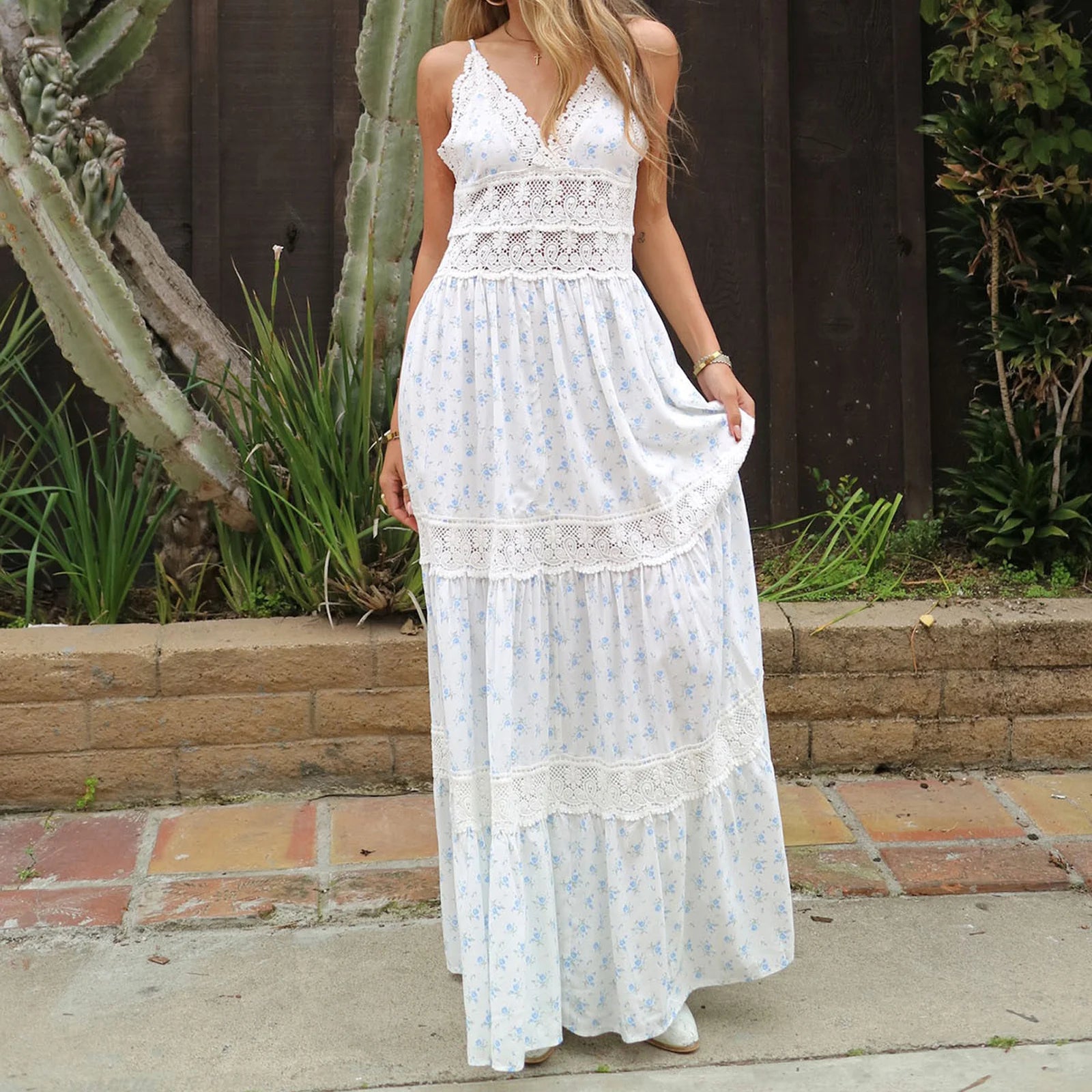 Cyflymder Women Lace Patchwork Maxi Dress Backless Boho Floral Long Dress Spaghetti Strap V Neck Low Cut Flowy Sunderss