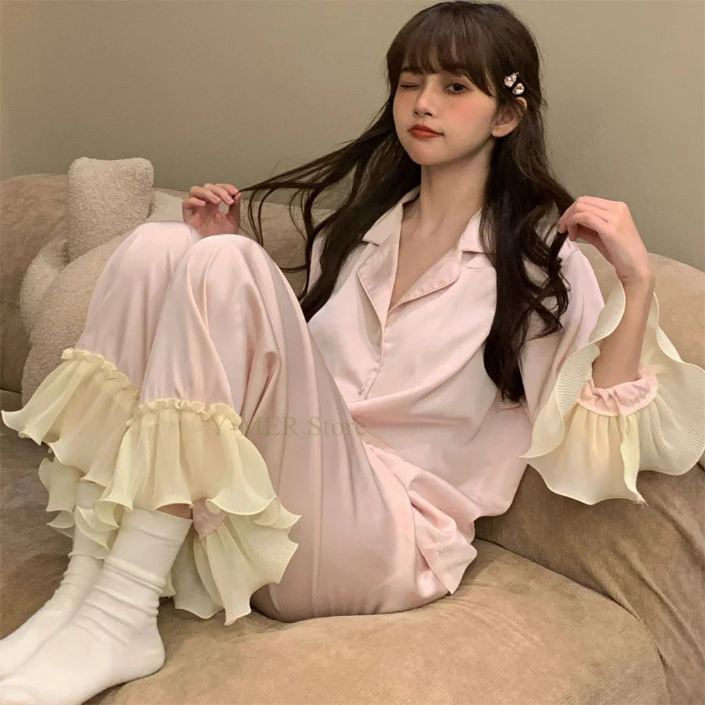 Cyflymder Women Pink Pajamas Set Sweet Lotus Leaf Sleeve Shirt&pants Rayon Homewear Girl Loose Nightwear Pyjamas 2Pcs Outfit Loungewear