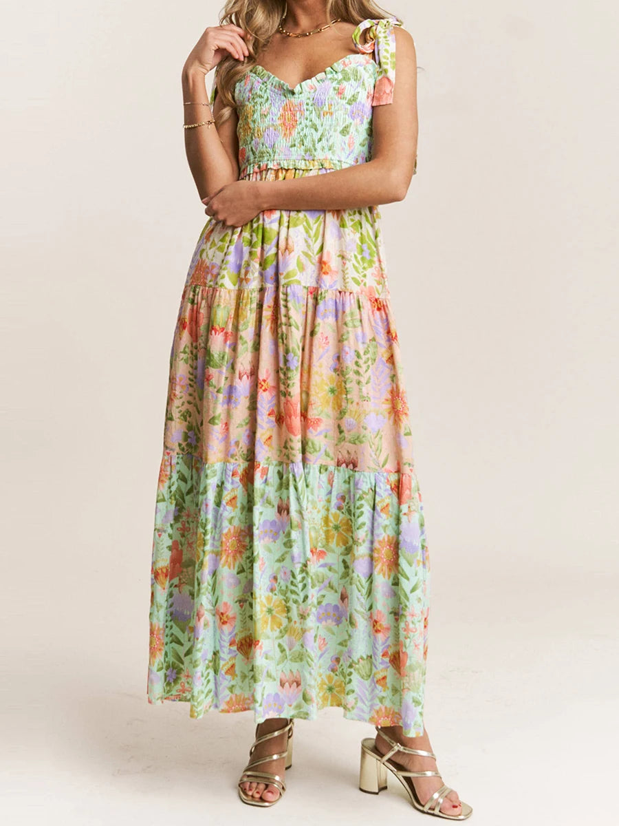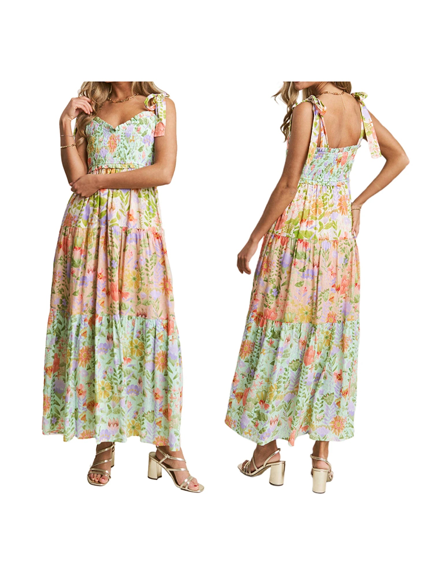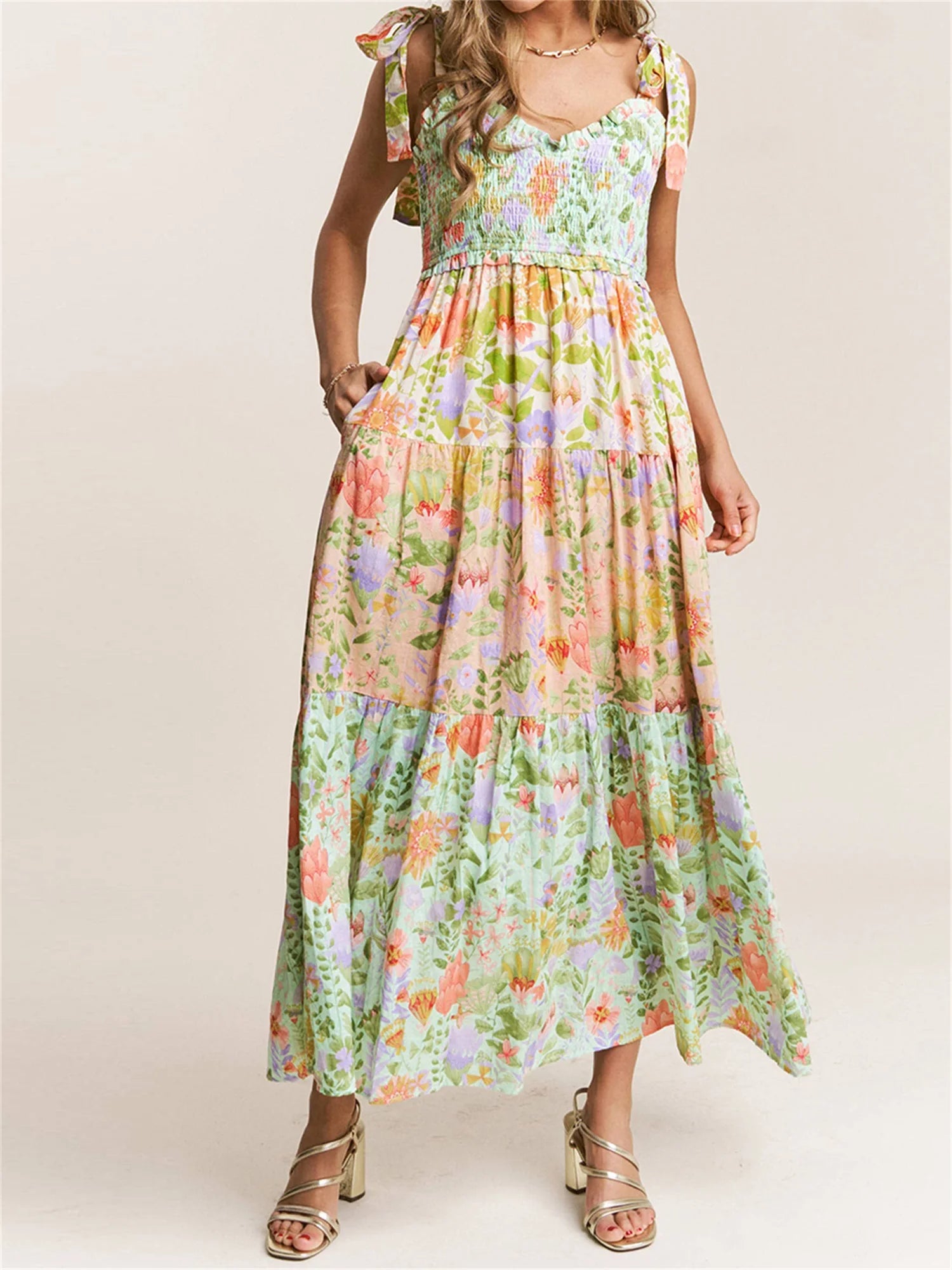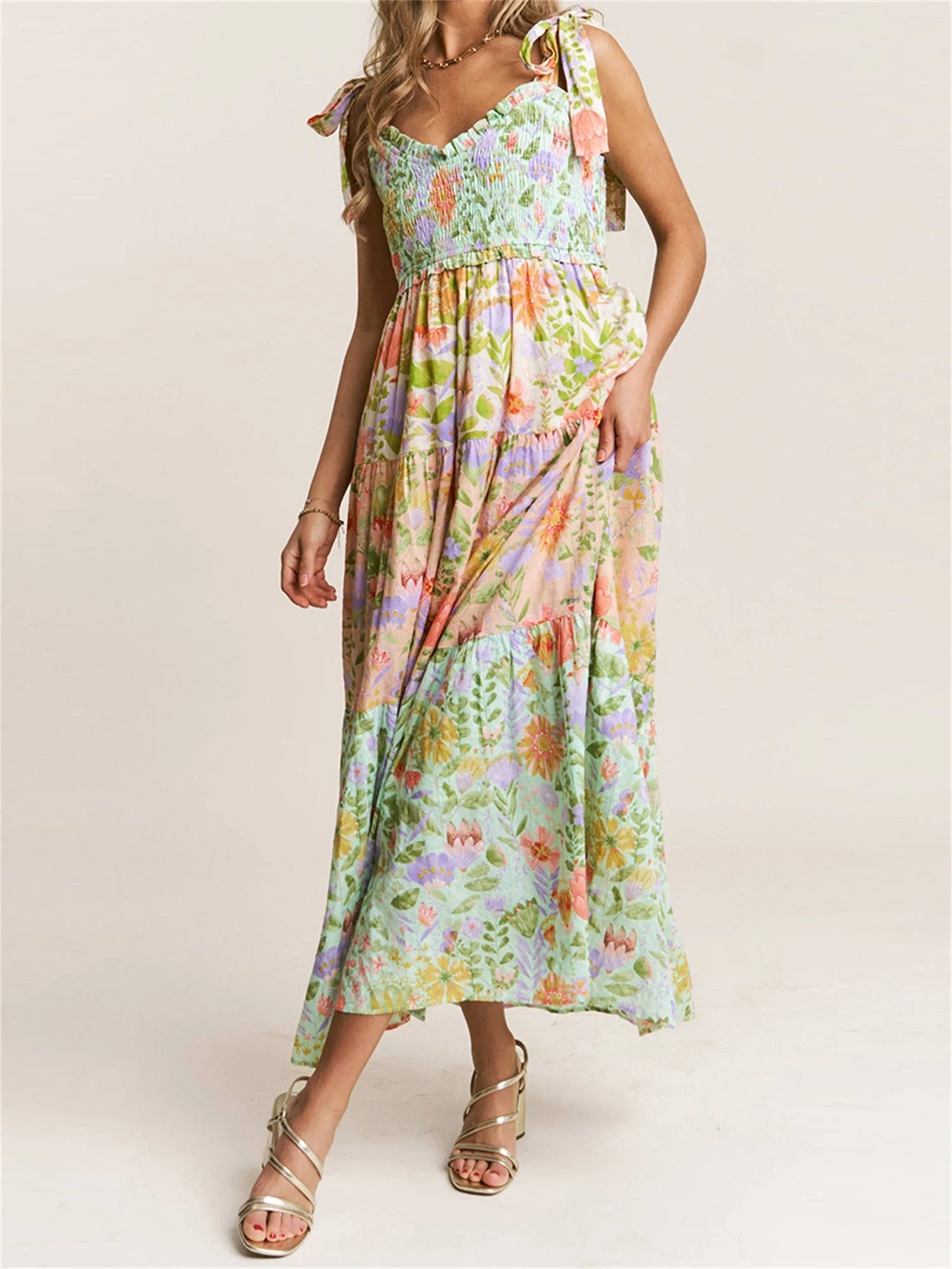 Cyflymder Women s Boho Floral Print Sleeveless Dress with Tie-Up Straps and Backless Design Perfect for Summer Beach Parties and