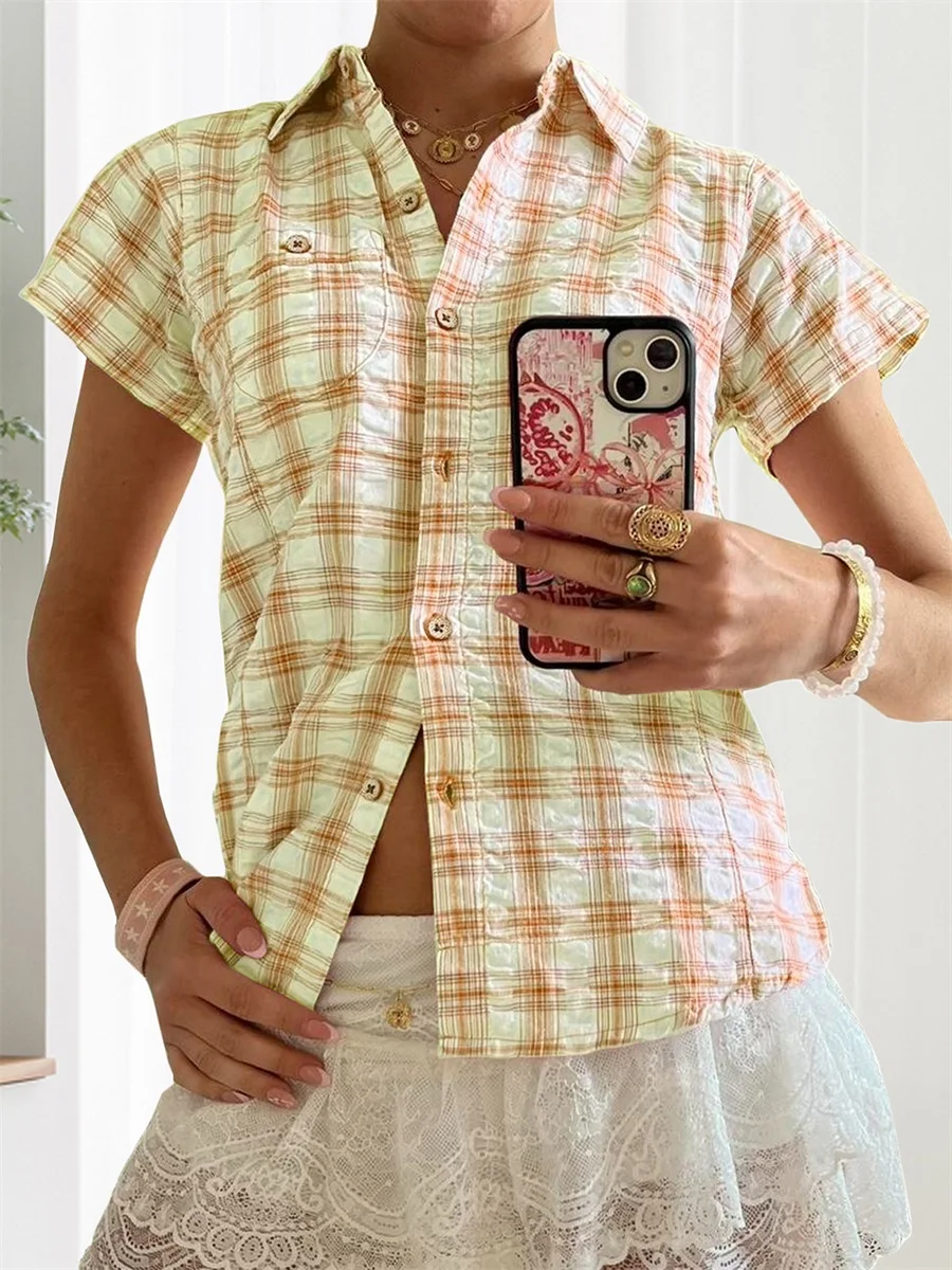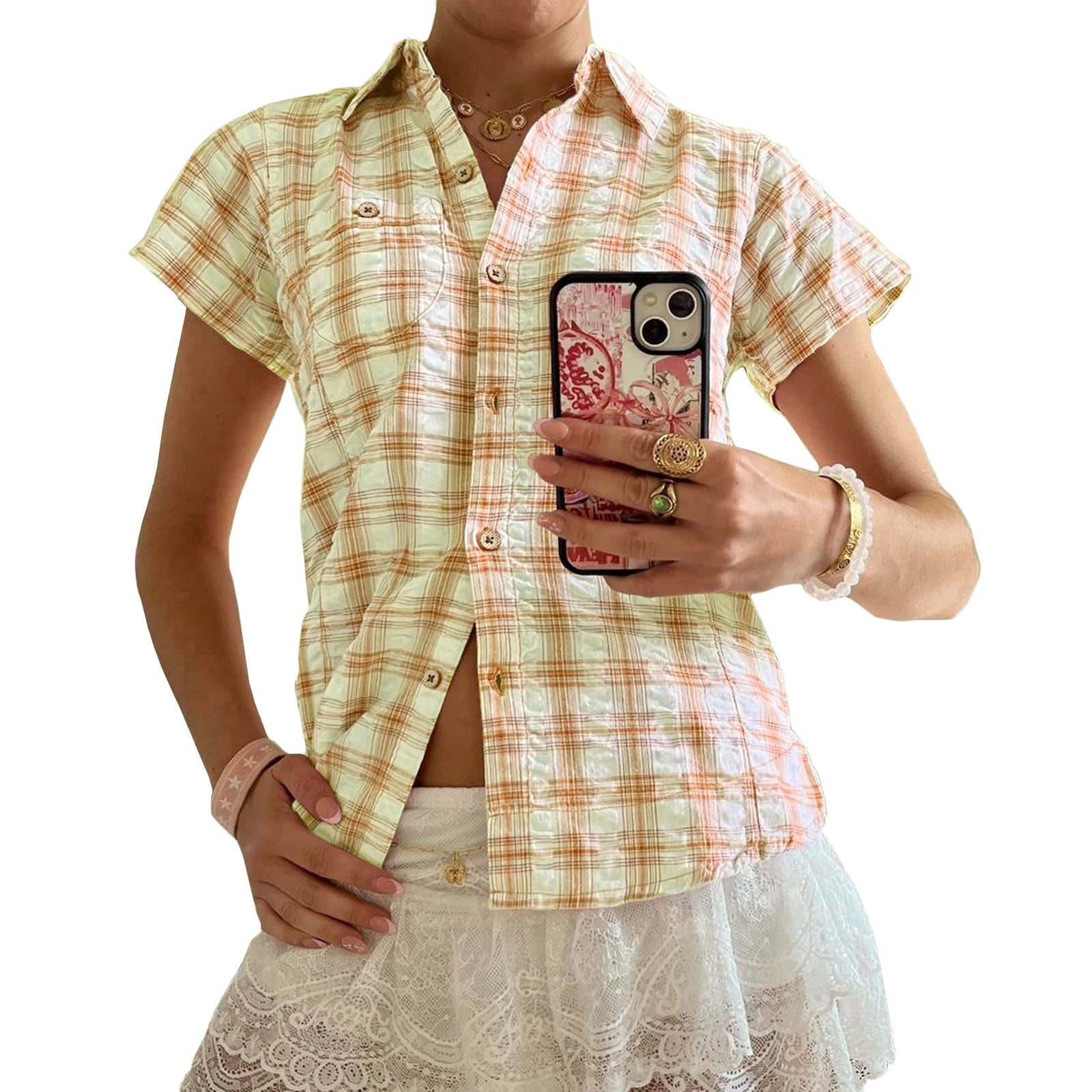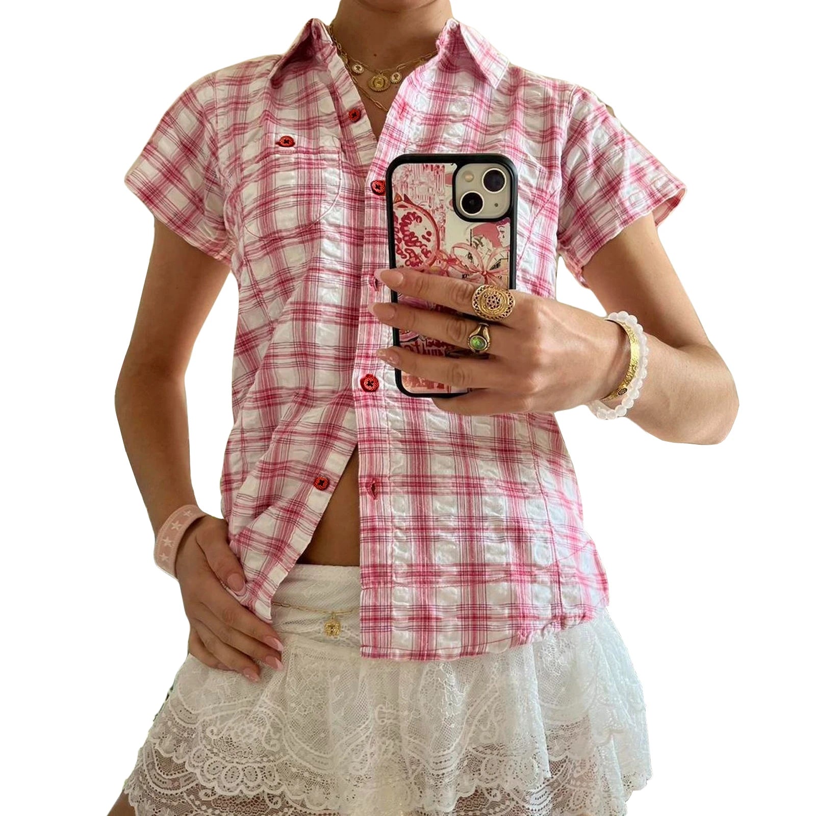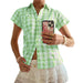 Cyflymder Women s Button Down Shirt Casual Contrast Color Plaid Lapel V Neck Short Sleeve Tops for Summer