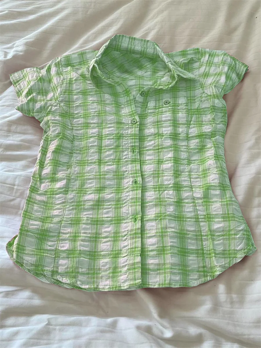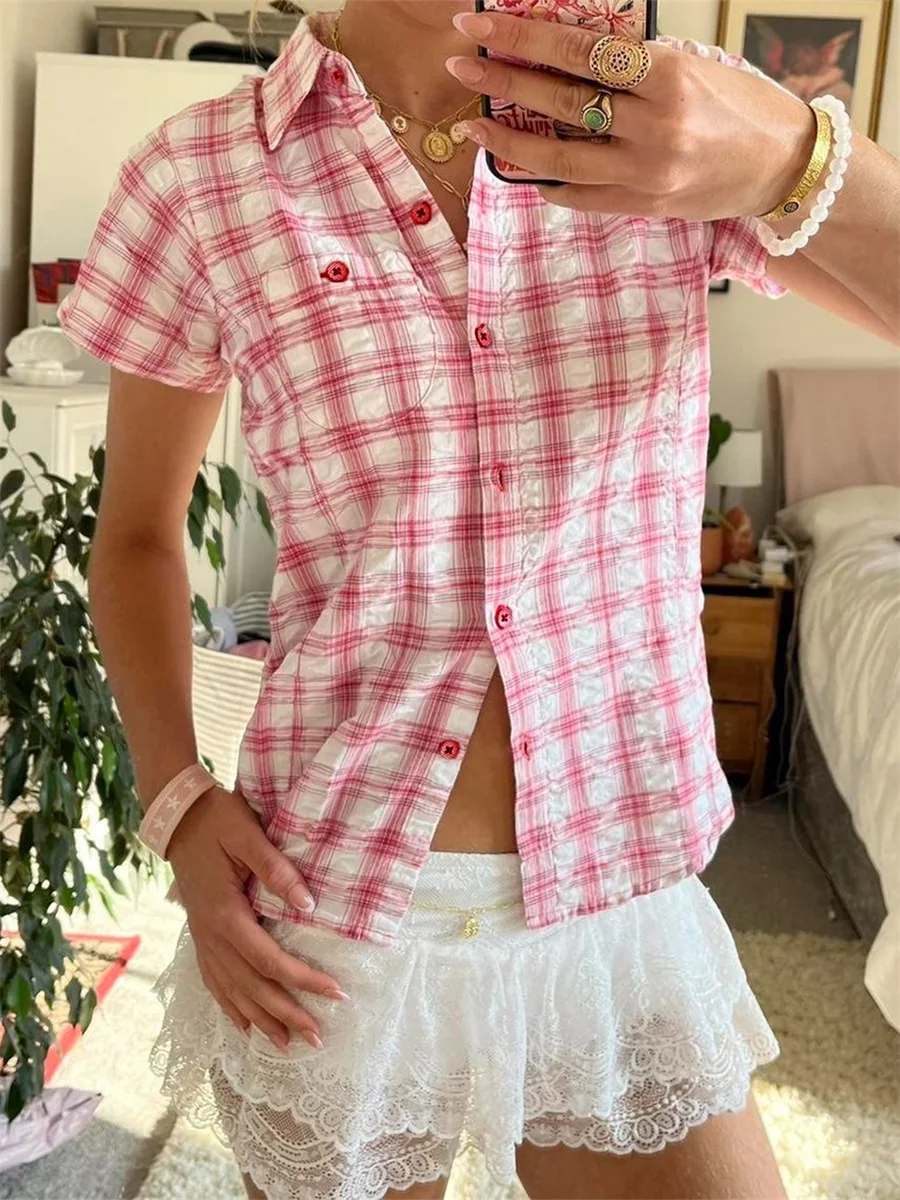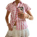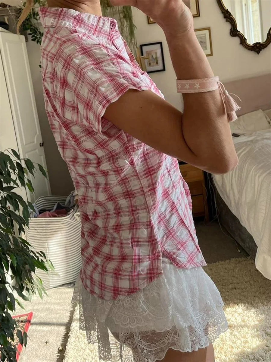 Cyflymder Women s Button Down Shirt Casual Contrast Color Plaid Lapel V Neck Short Sleeve Tops for Summer