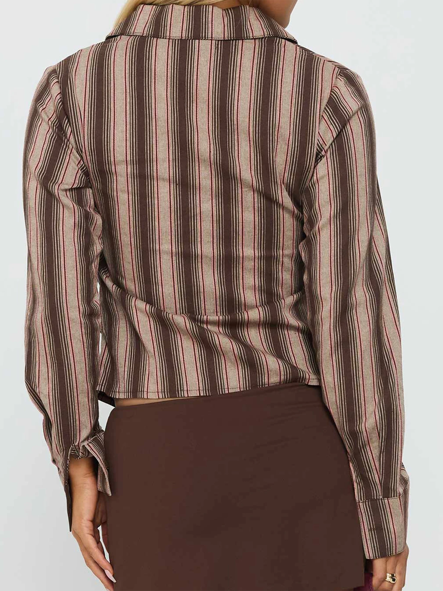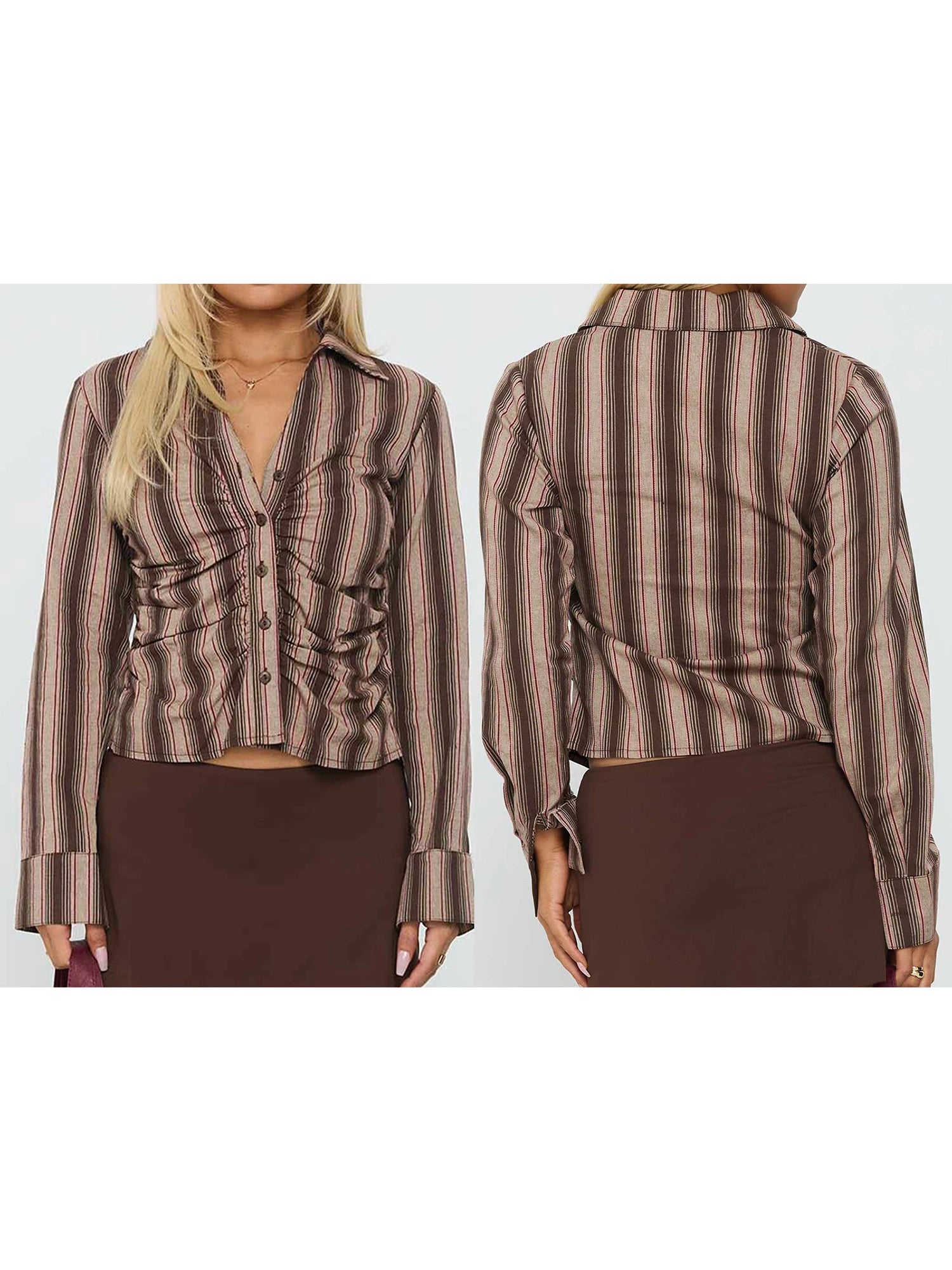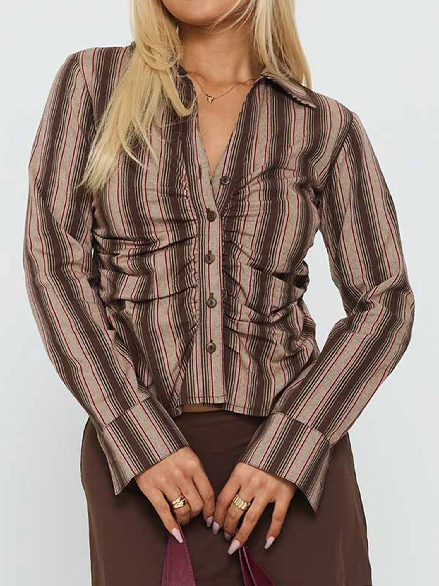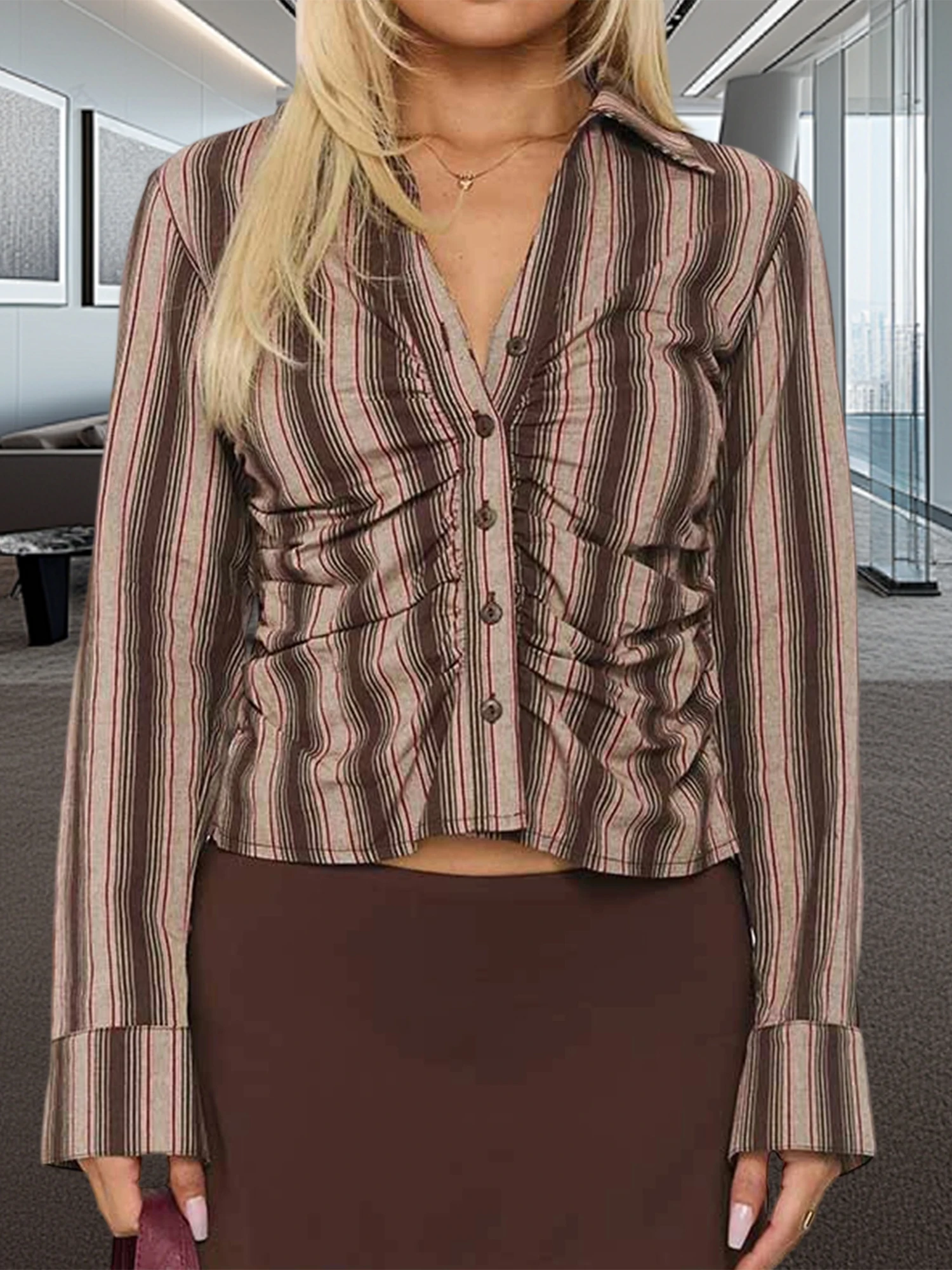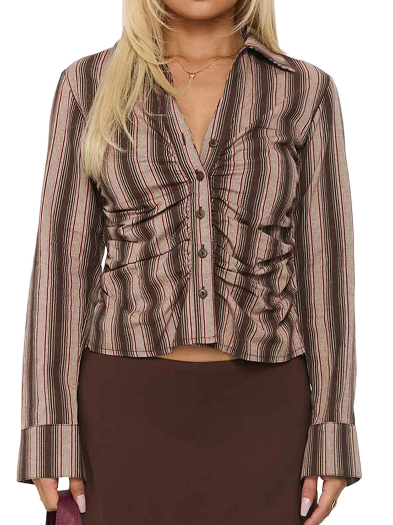 Cyflymder Women s Casual Fit Button Down Shirt with Stylish Striped Lapel and V Neck Design Perfect for Fall Season