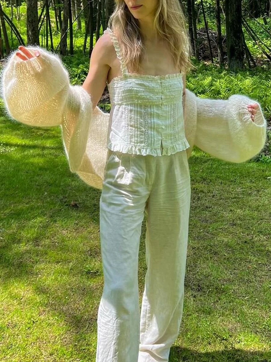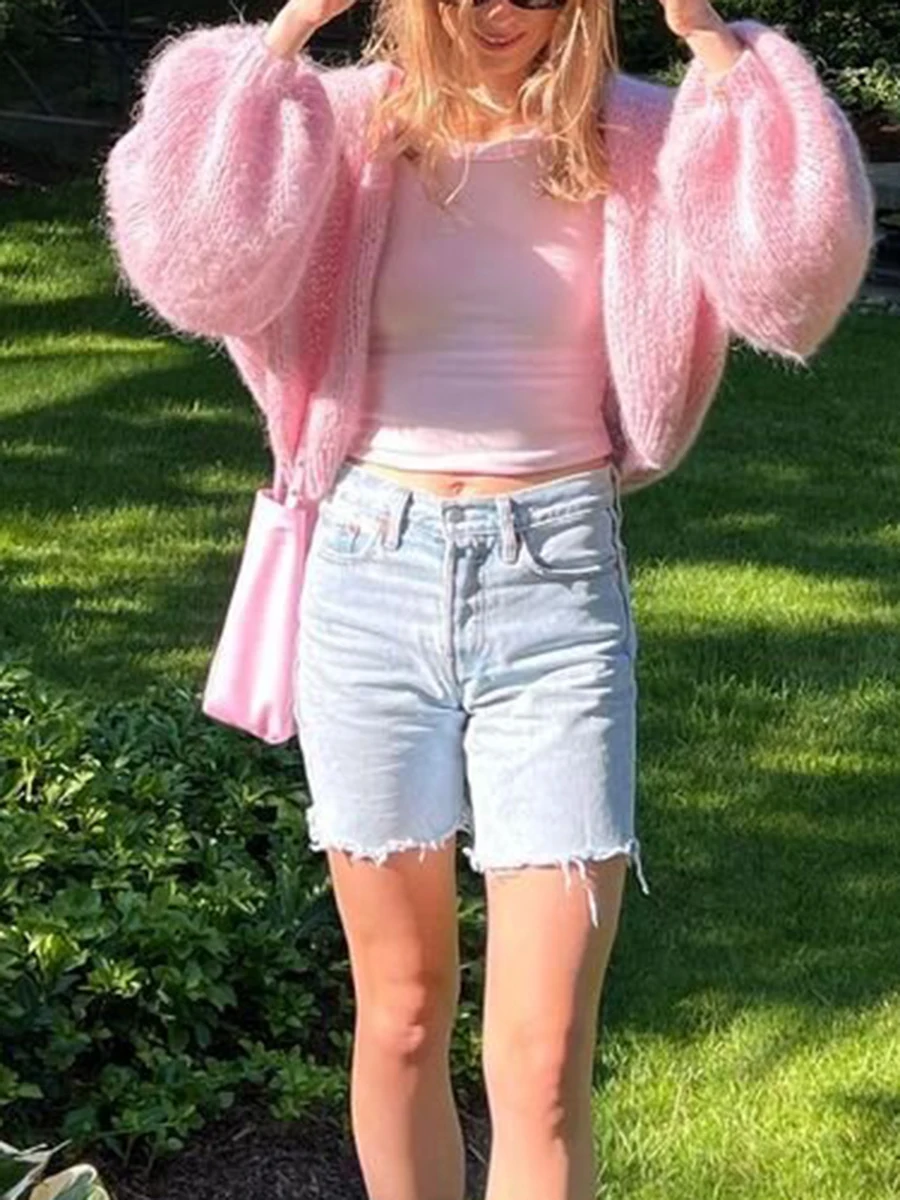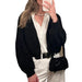 Cyflymder Women s Cozy Knit Sweater Long Puff Sleeve Open Front Solid Color Cardigan Winter Jacket with Faux Fur Trim