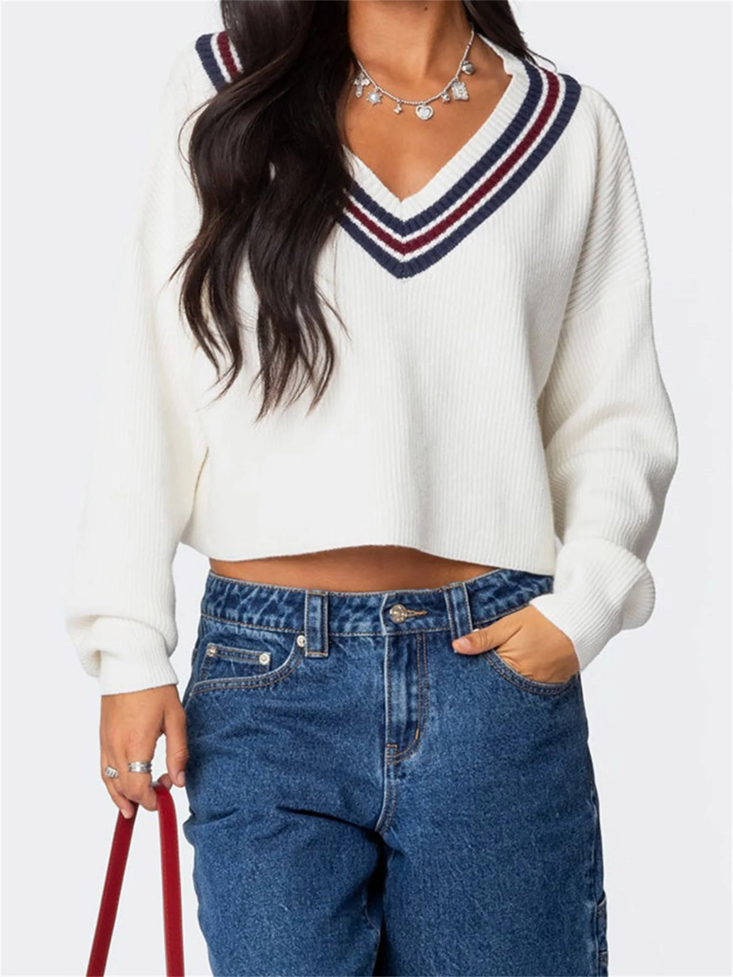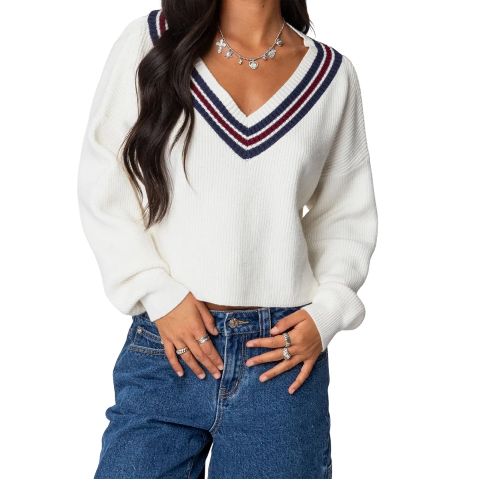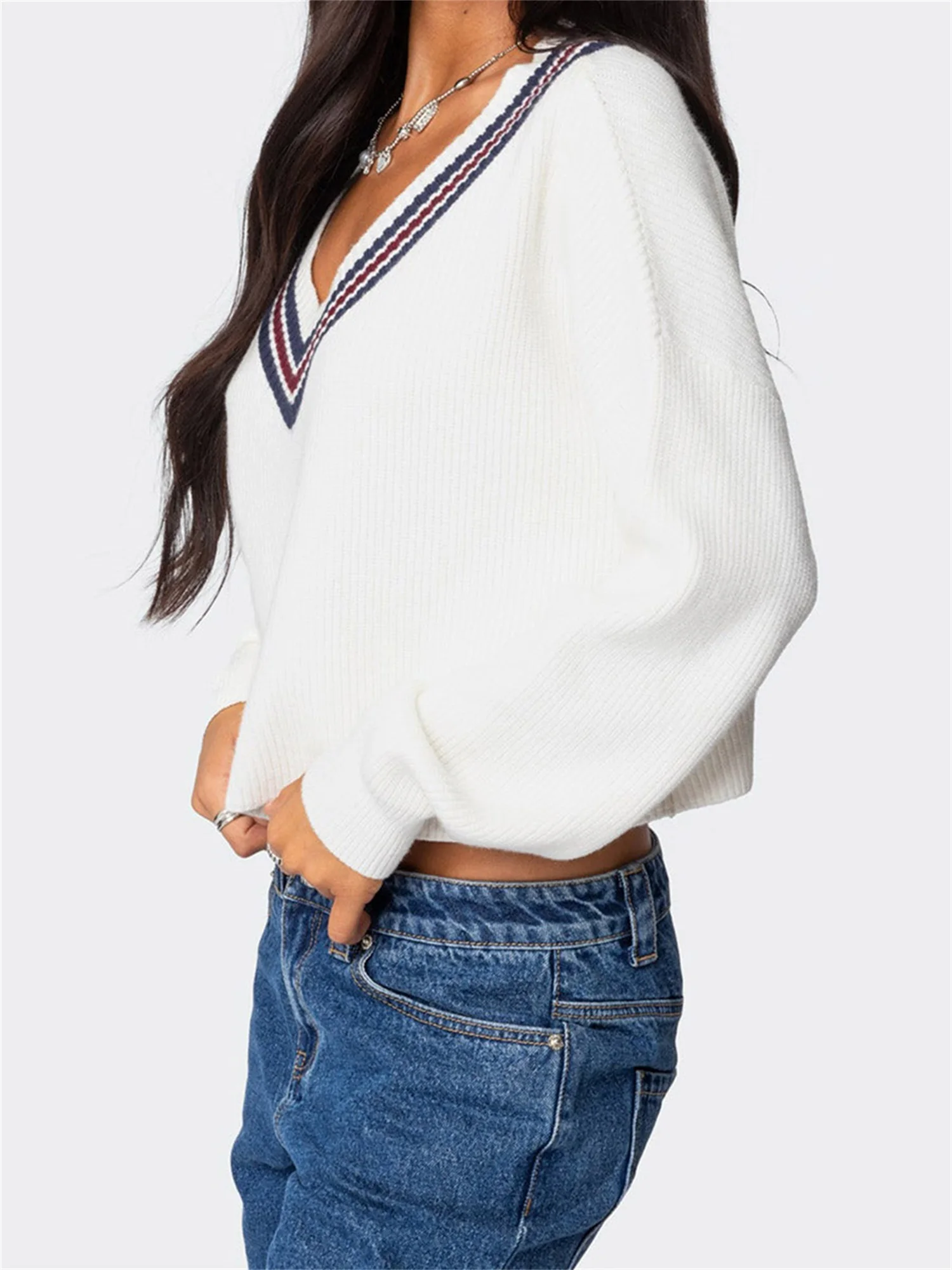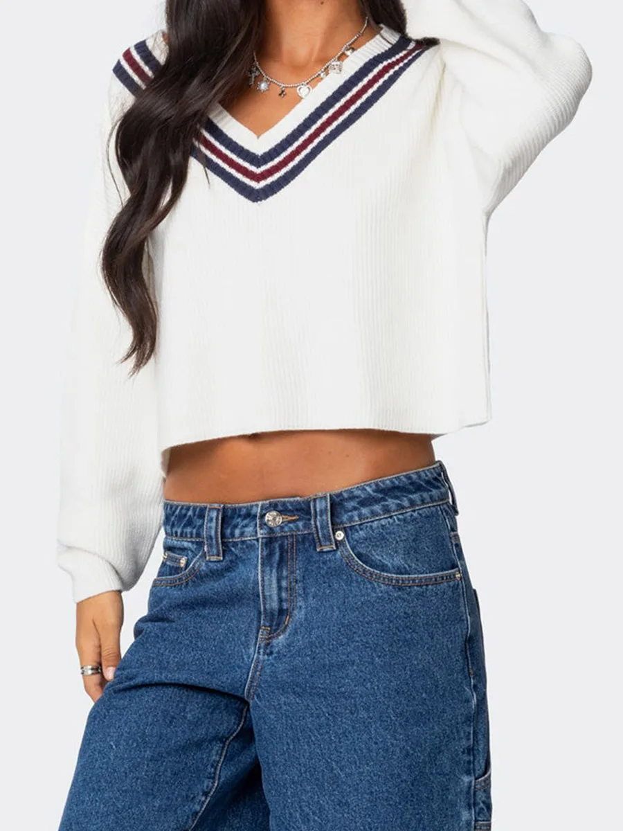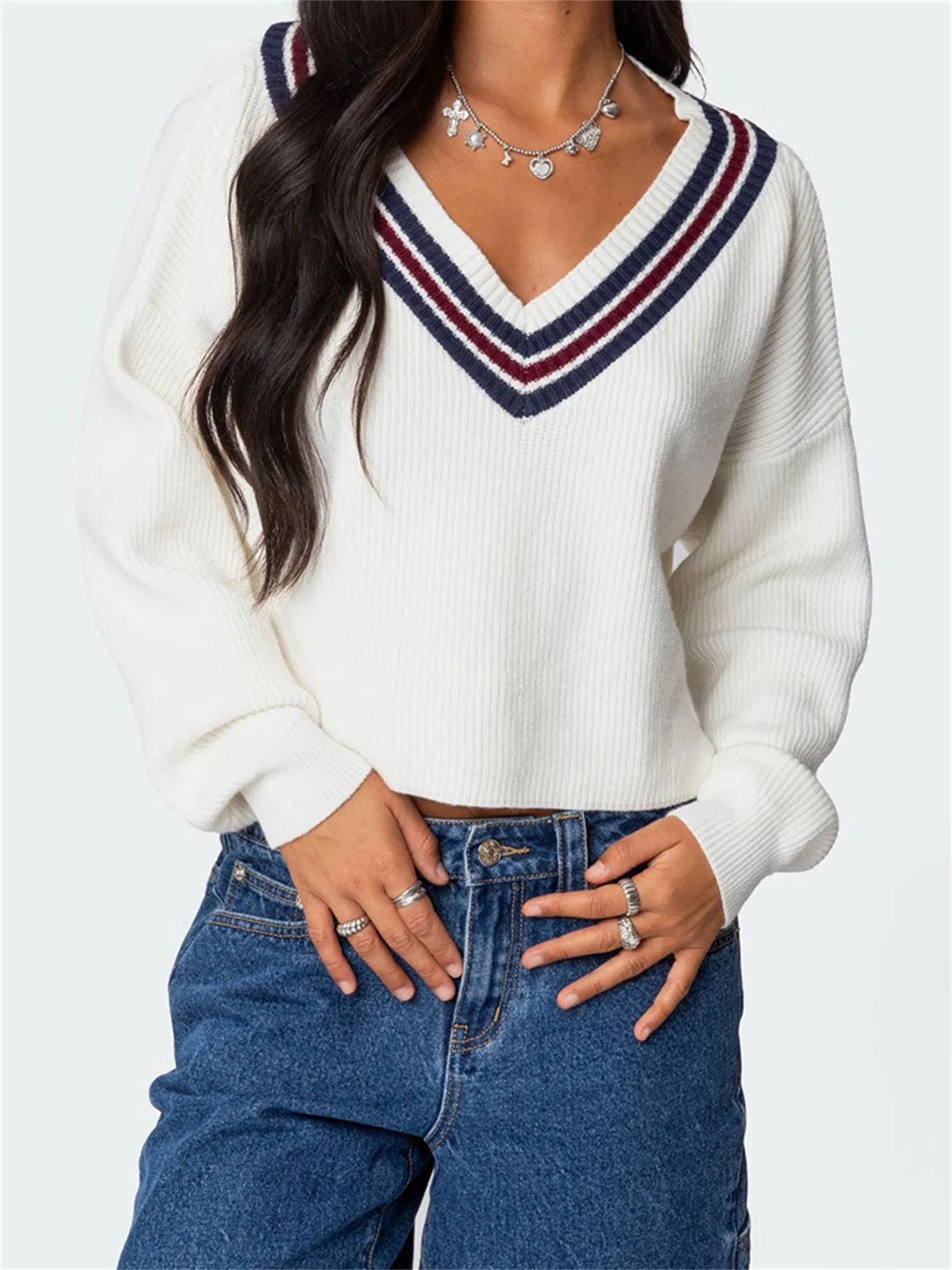 Cyflymder Women s Cozy Oversized Sweaters with V Neckline and Striped Detailing Perfect for Fall and Winter Fashion