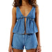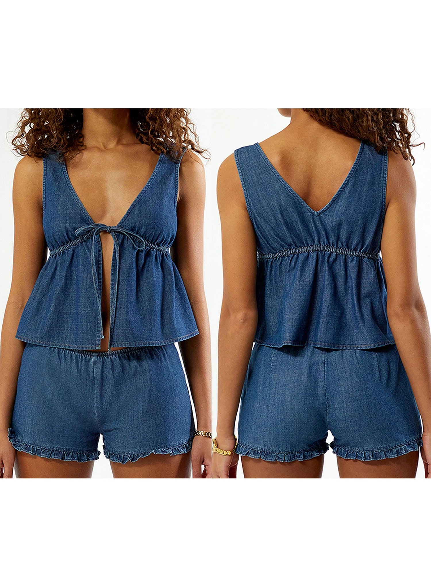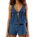 Cyflymder Women s Denim Ensemble Stylish Deep V Neck Tank Top with Tie Front Detail and Elastic Waist Ruffle Shorts - 2 Piece Set for