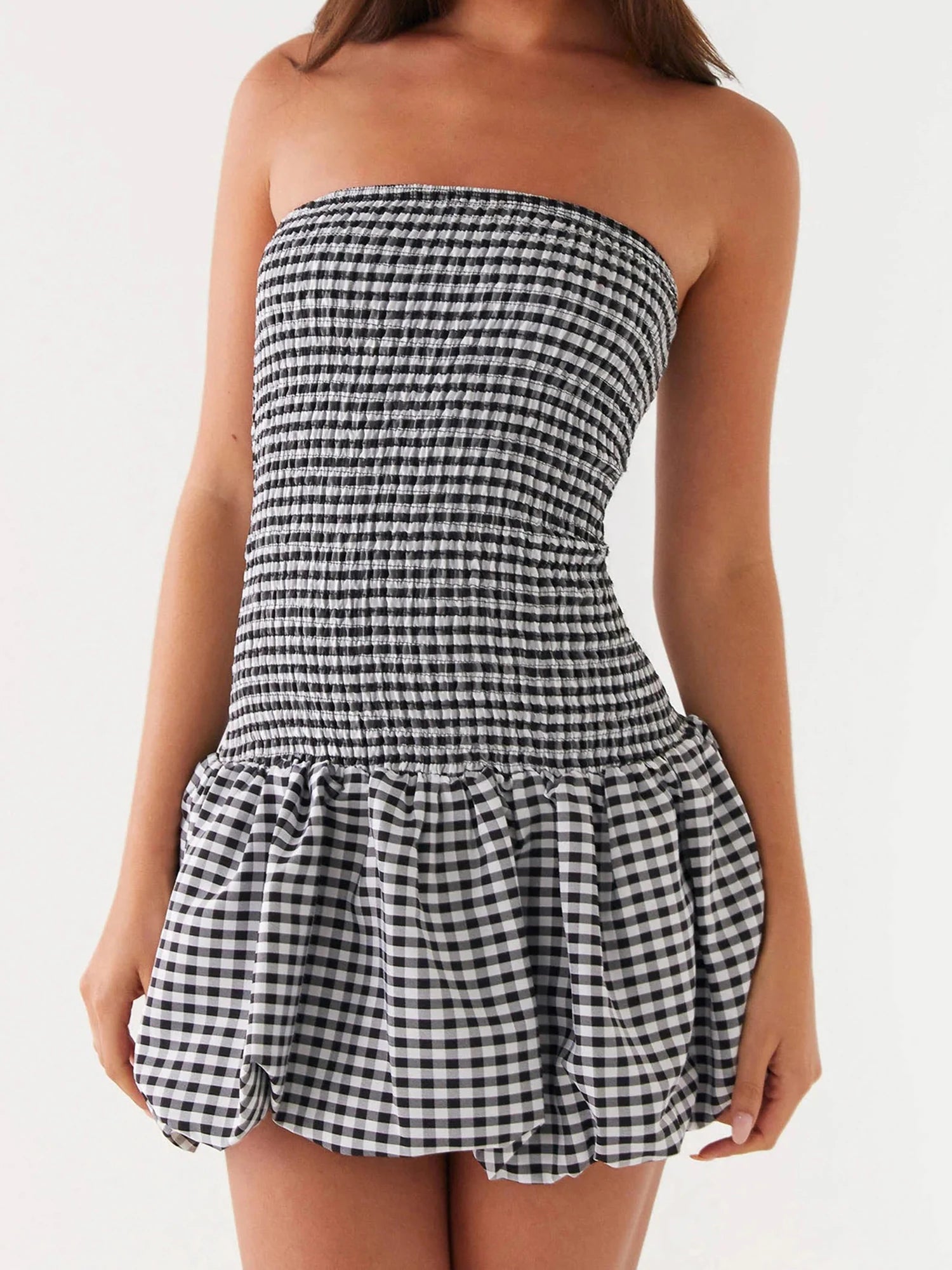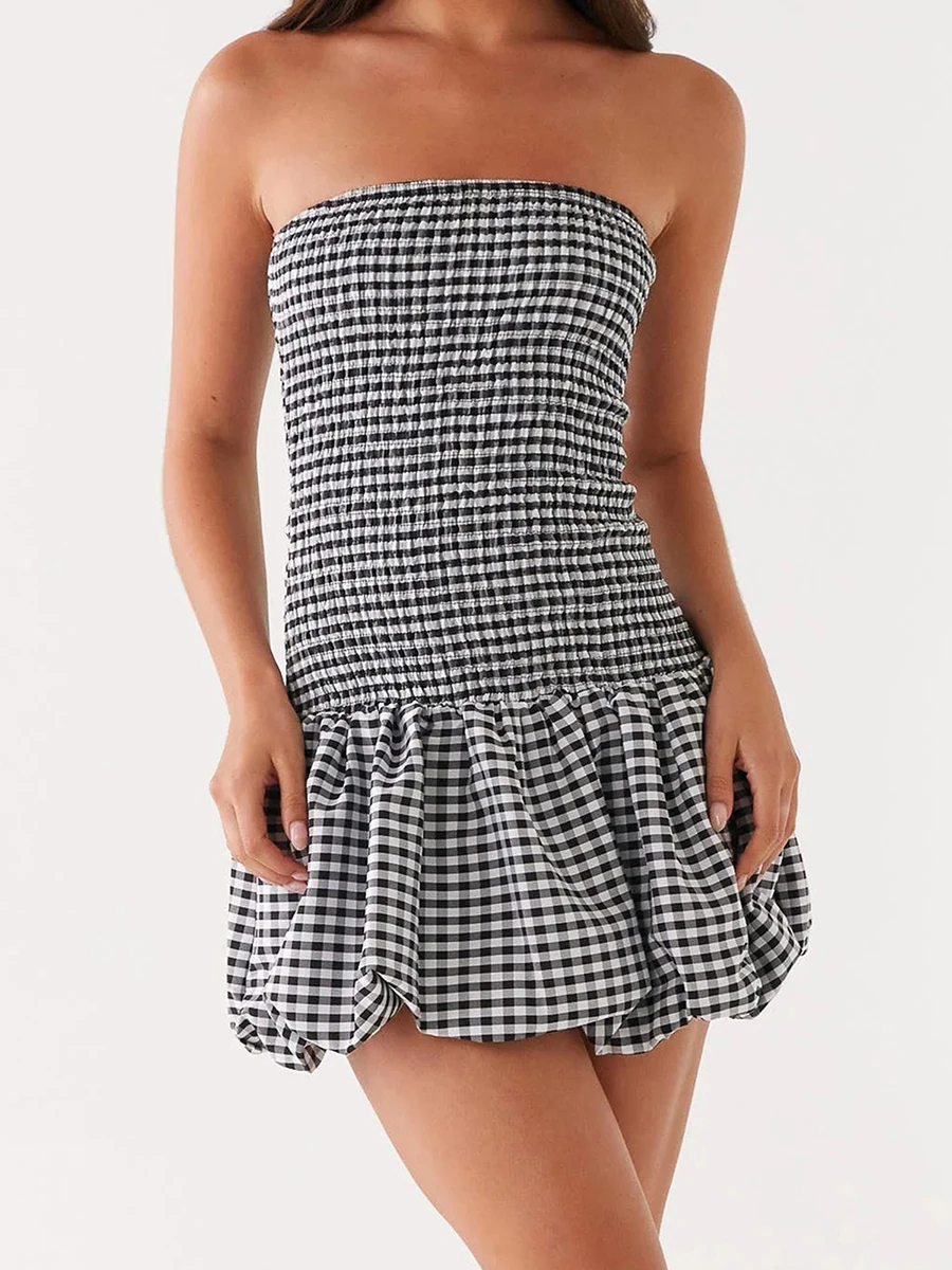 Cyflymder Women s Plaid Off Shoulder Mini Dress with Puffball Sleeves and Tube Top Design for a Stylish Look