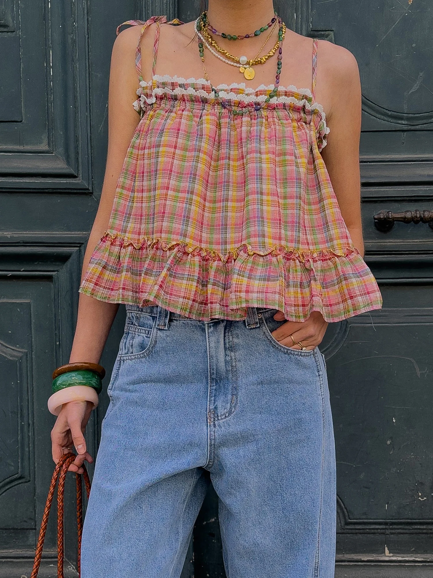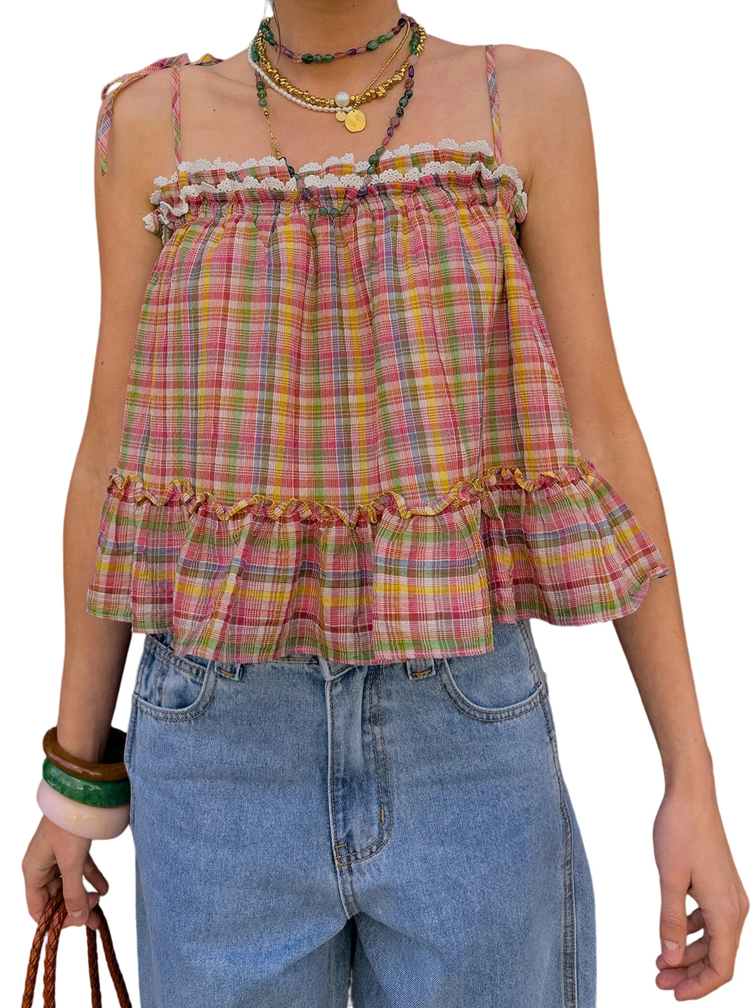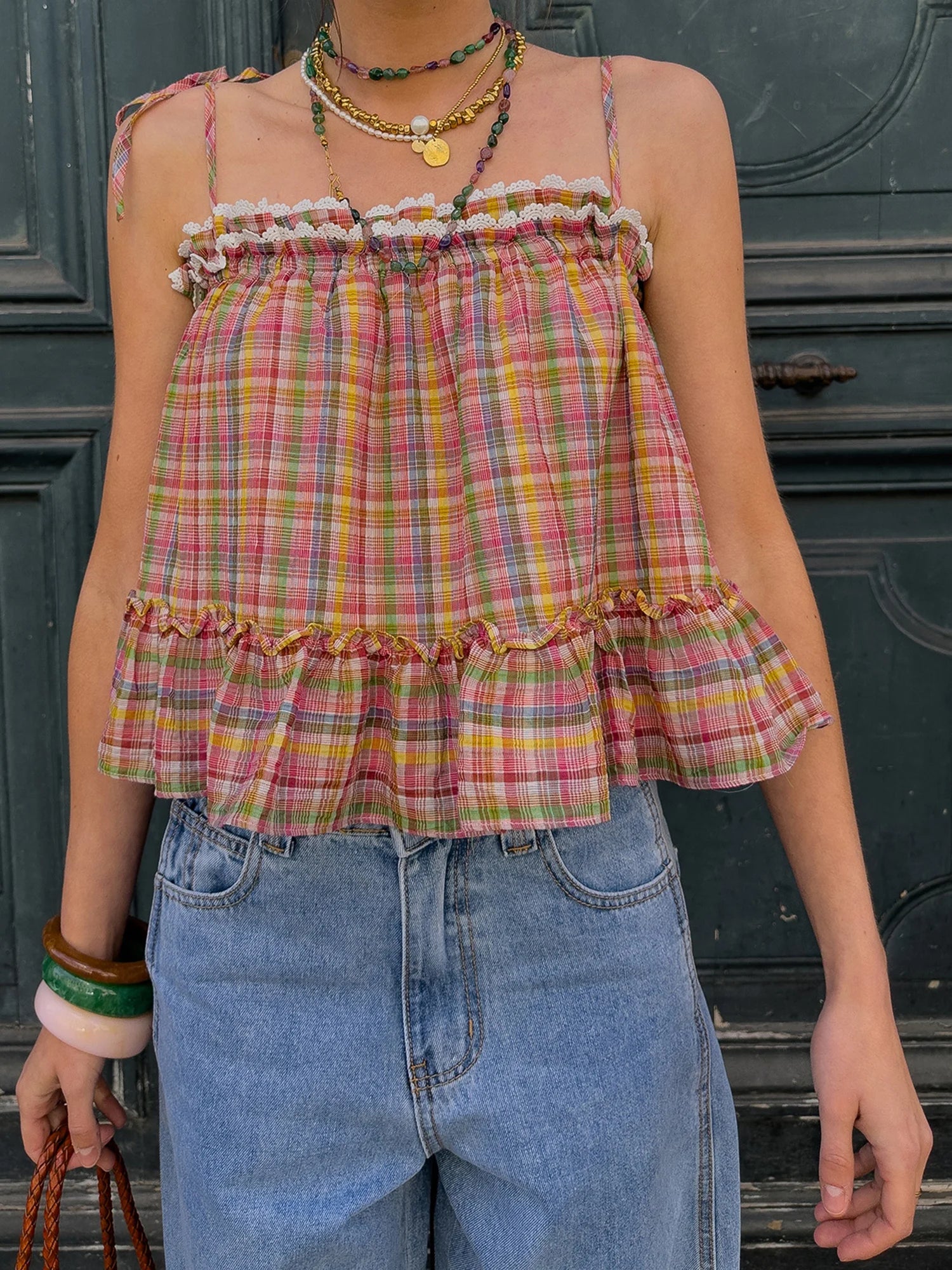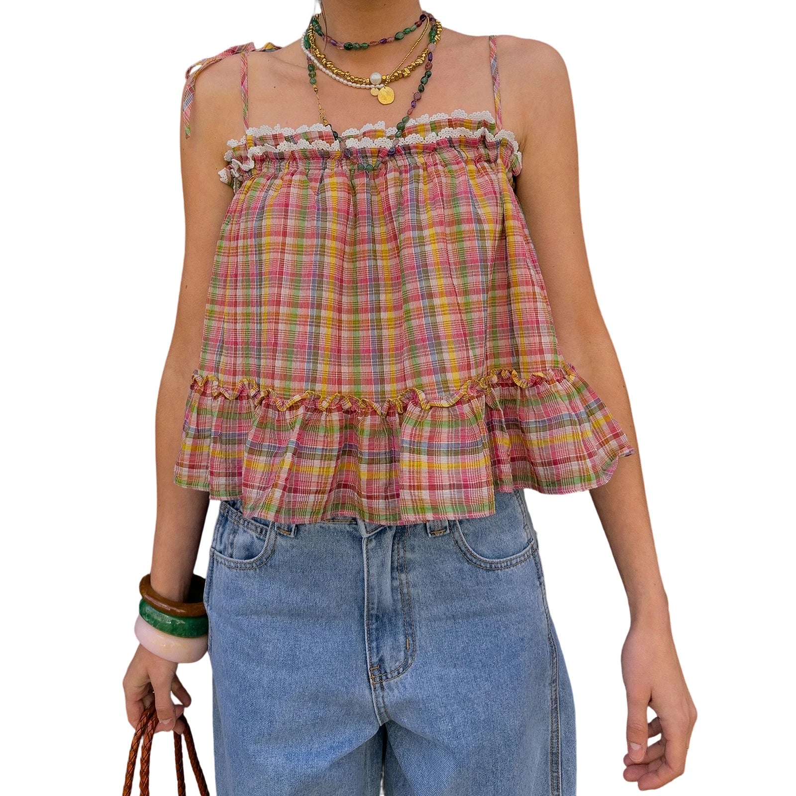 Cyflymder Women s Plaid Tank Tops Stylish Square Neck Sleeveless Spaghetti Strap Ruffled Hem Camisole for Summer Fashion