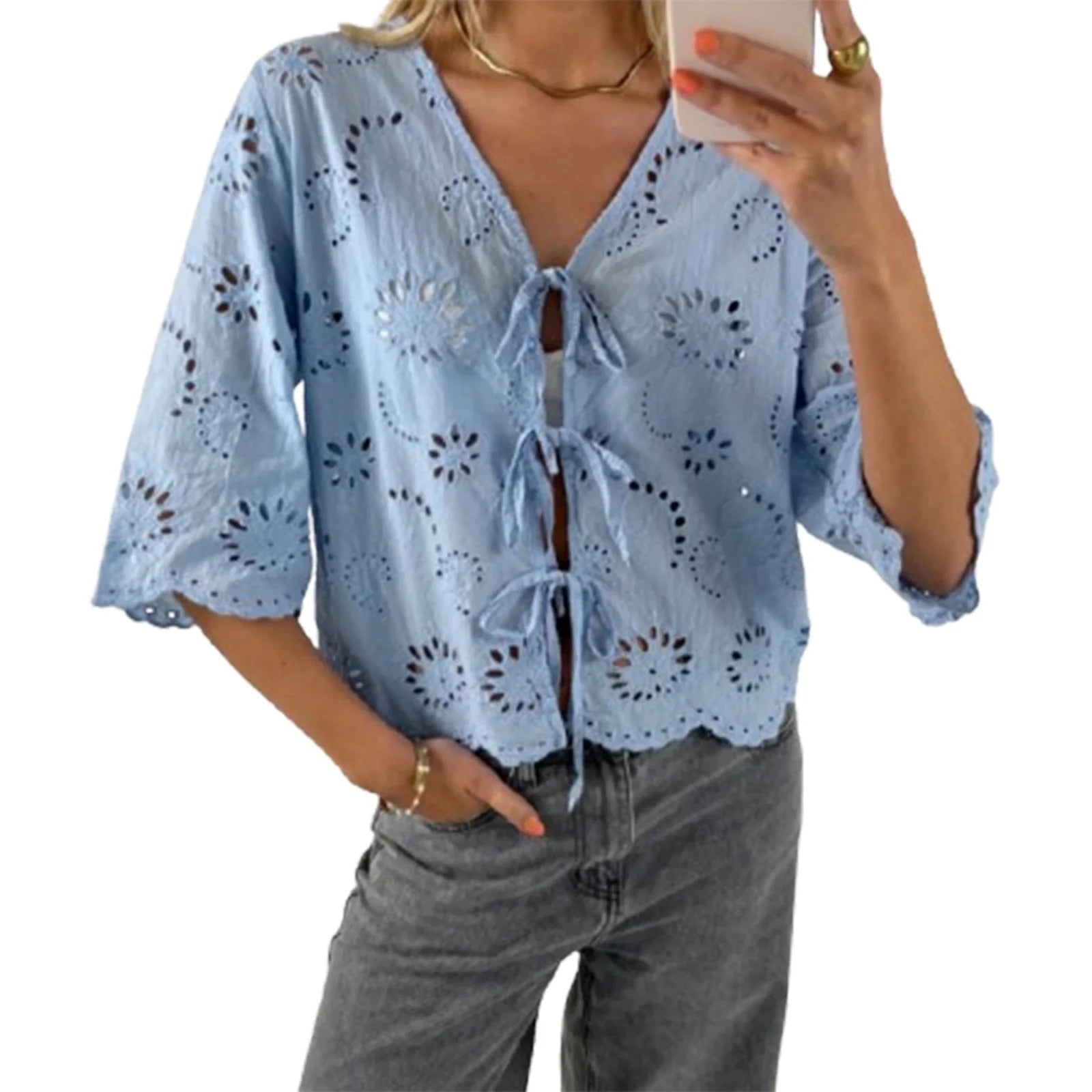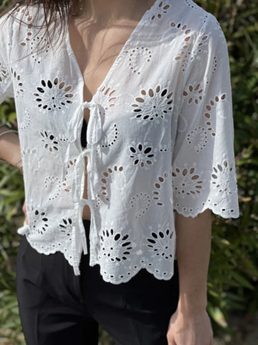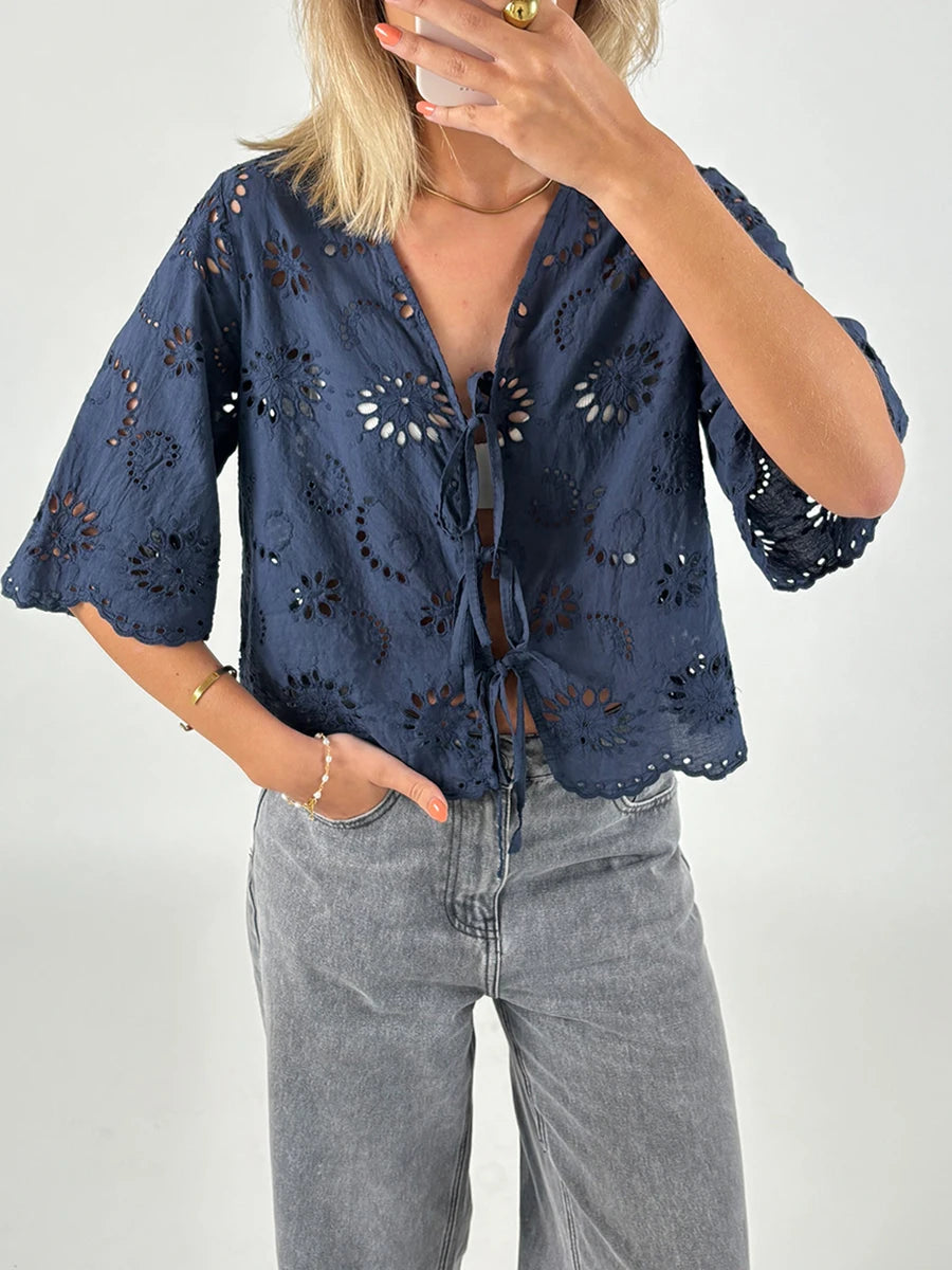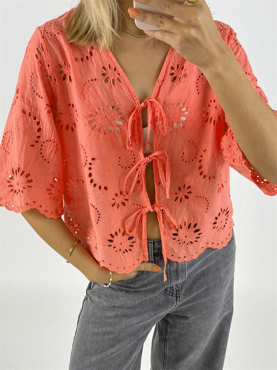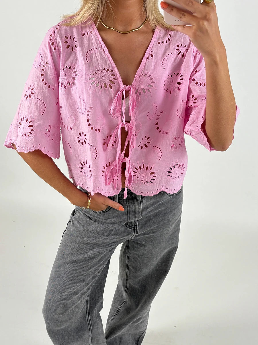 Cyflymder Women s Short Sleeve V-Neck Hollow Out Casual Blouse Tie Front Solid Color Loose Fit Summer Top Streetwear Fashion