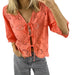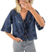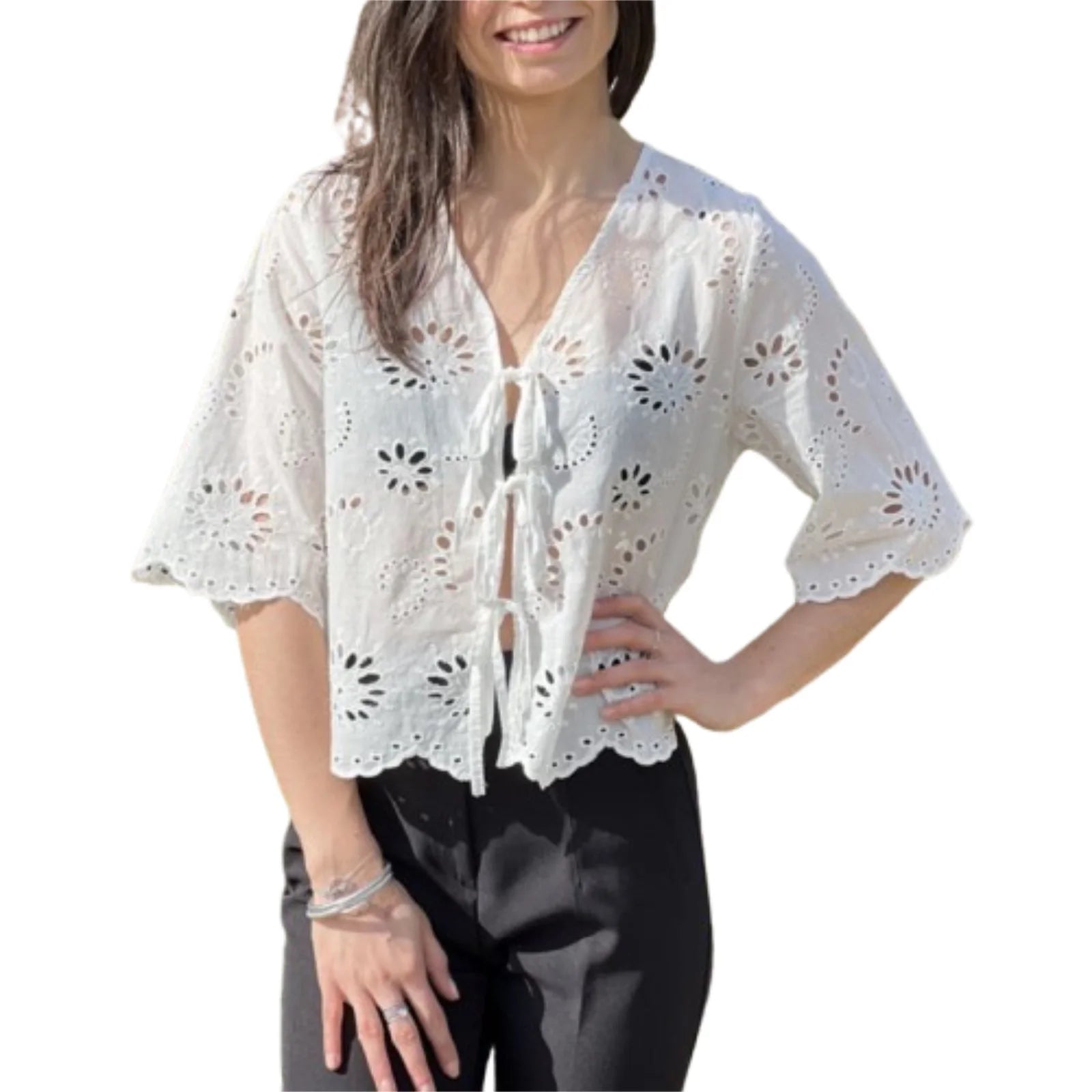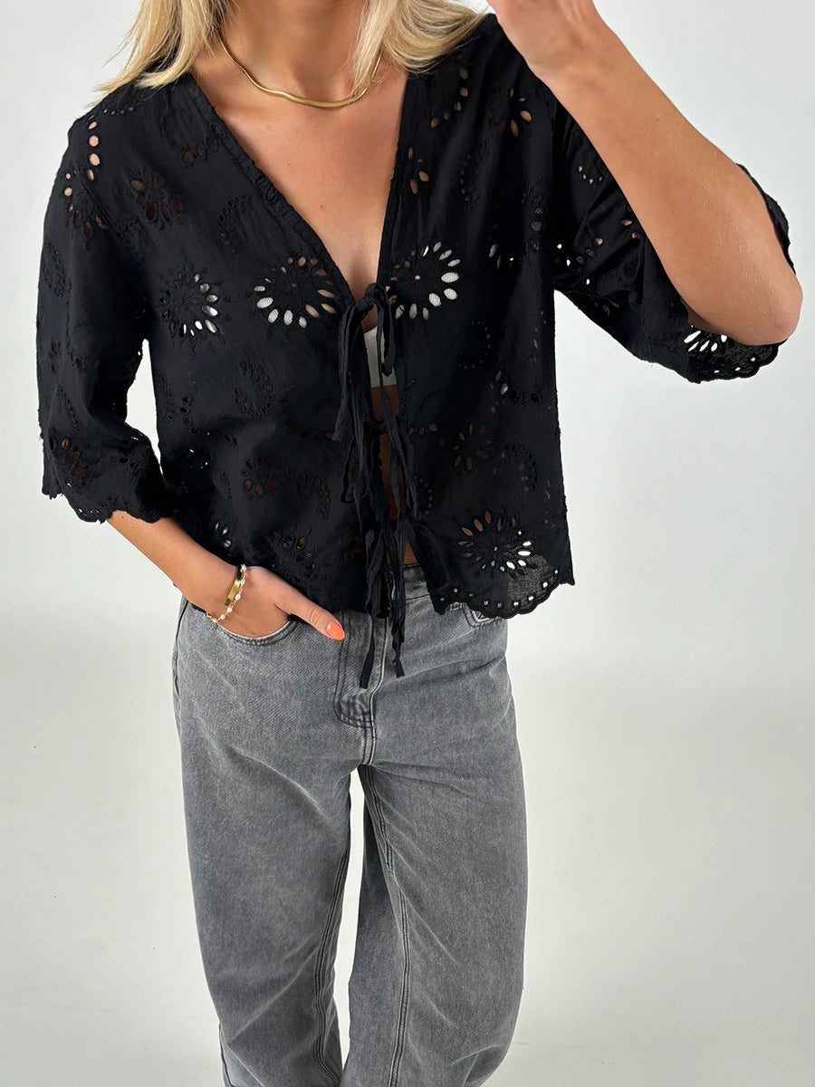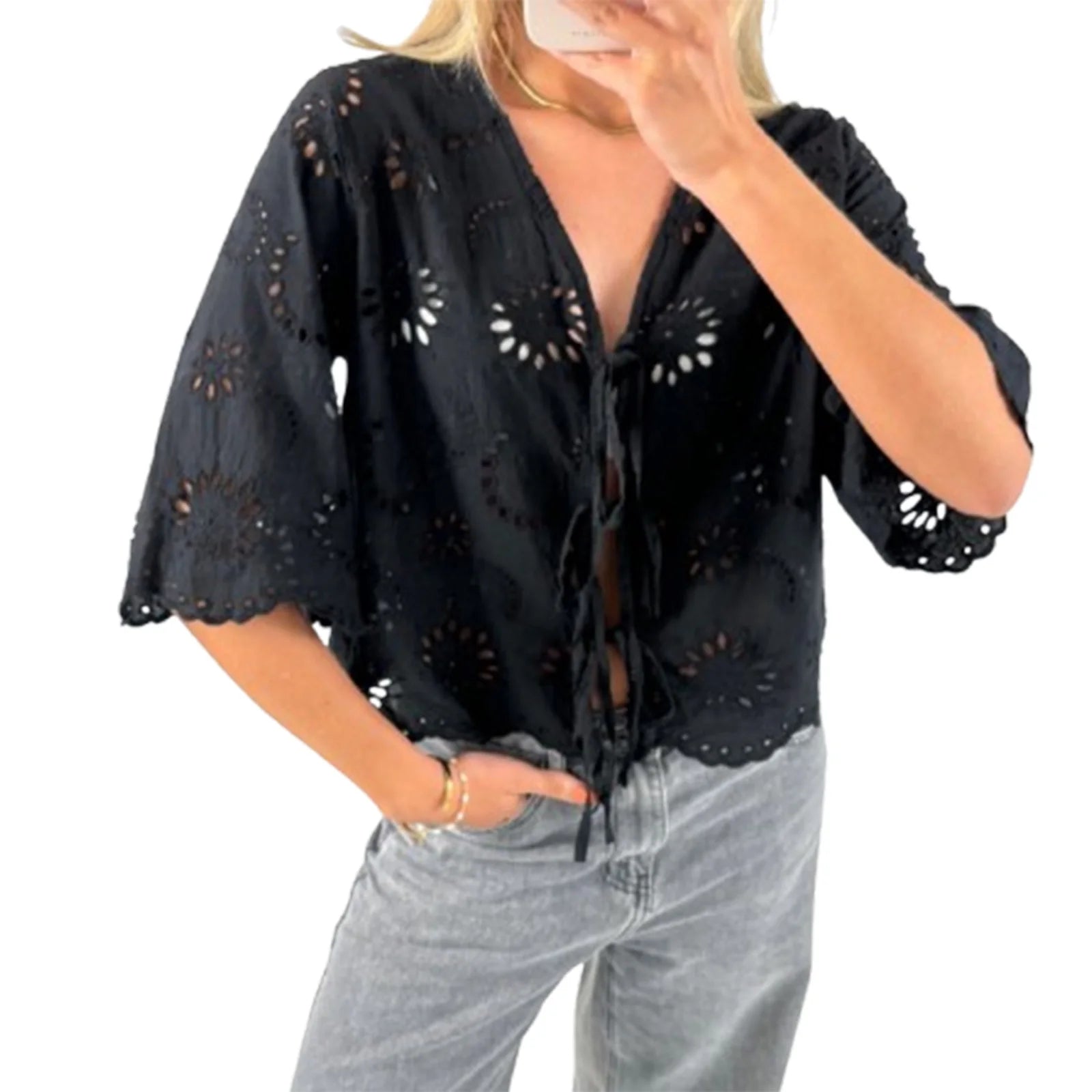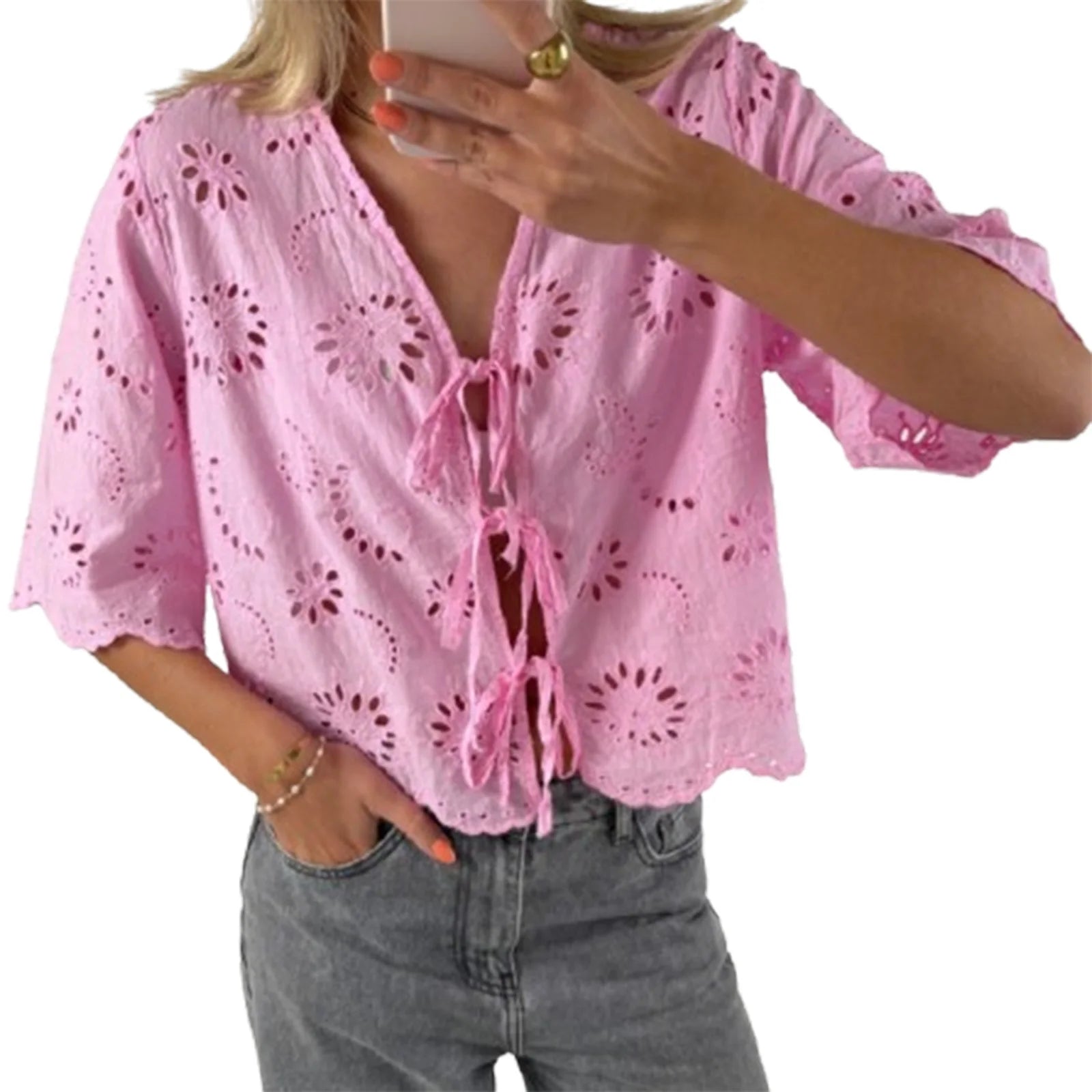 Cyflymder Women s Short Sleeve V-Neck Hollow Out Casual Blouse Tie Front Solid Color Loose Fit Summer Top Streetwear Fashion