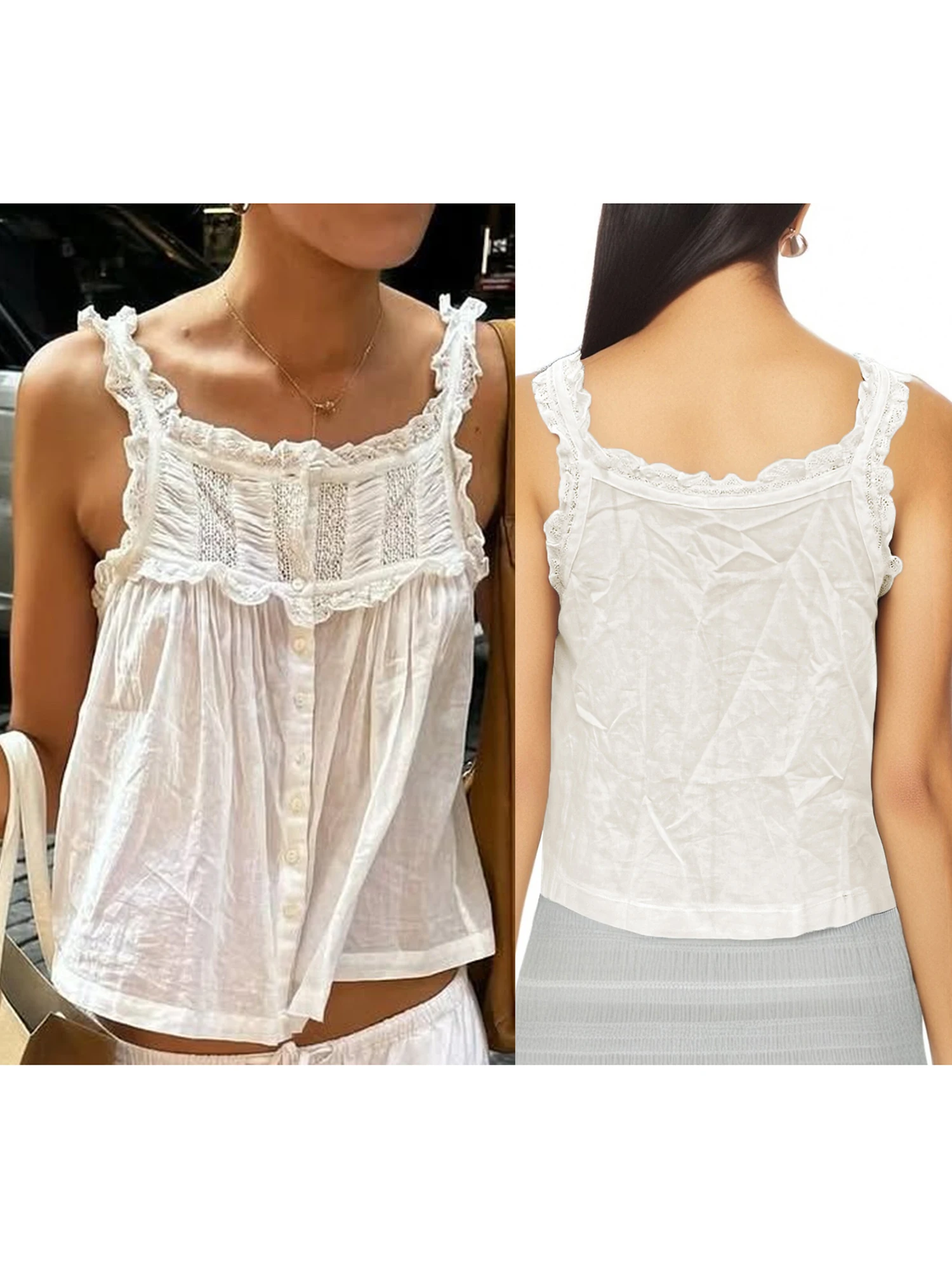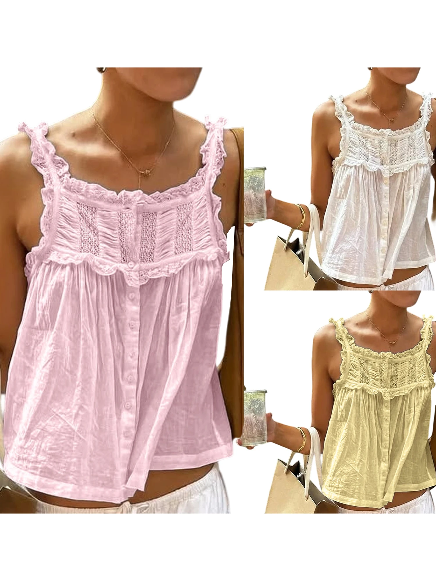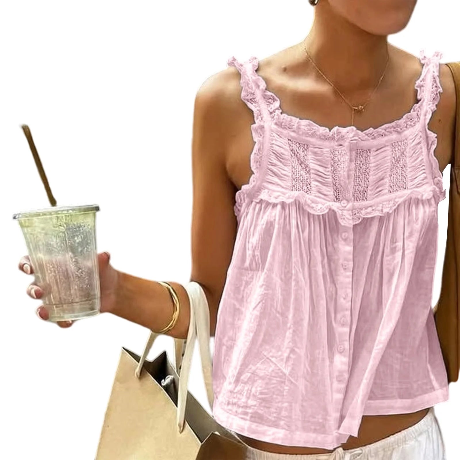 Cyflymder Women s Sleeveless Lace Patchwork Tank Top with Button Detail and Casual Aesthetic Streetwear Style for Summer Wear