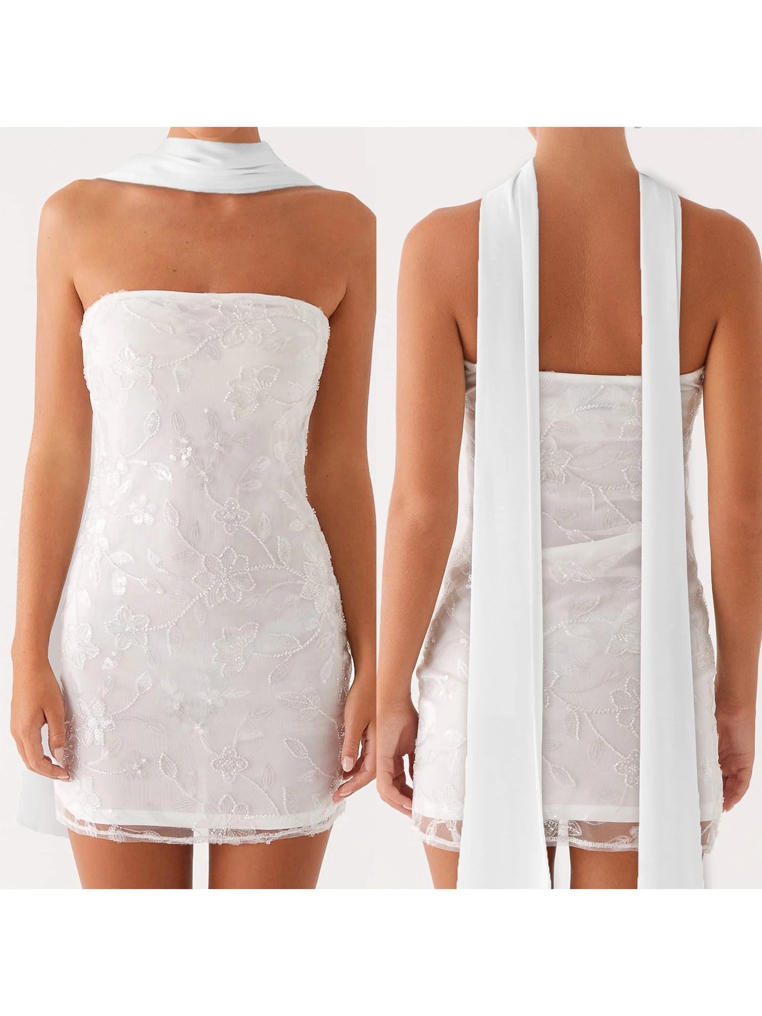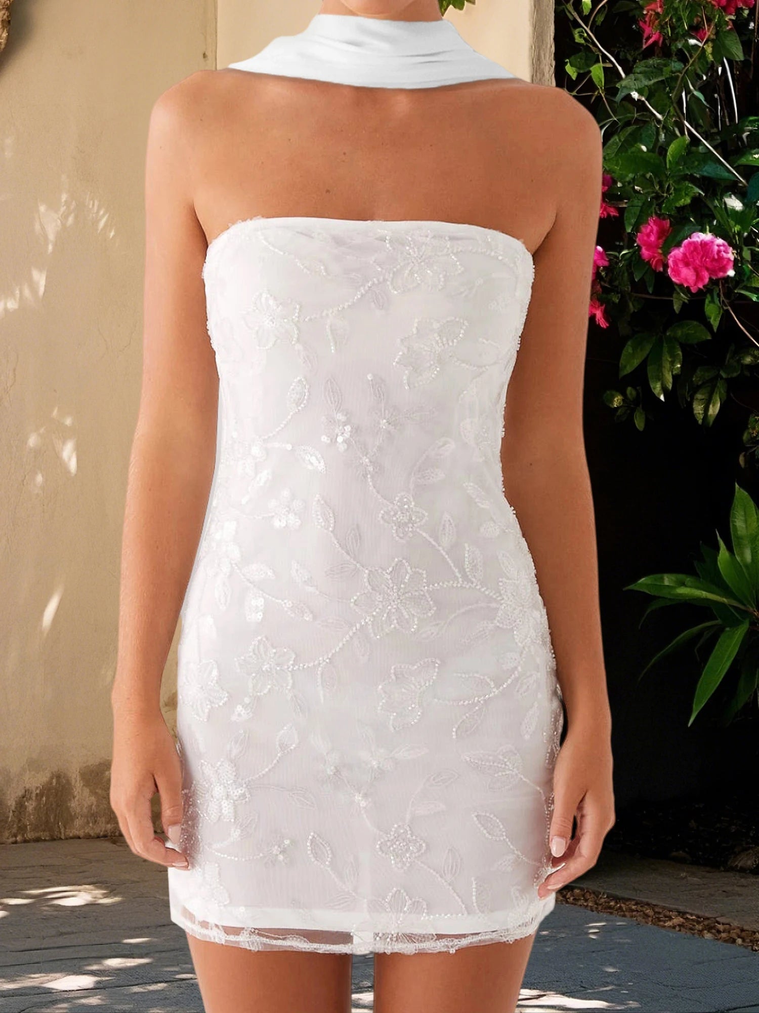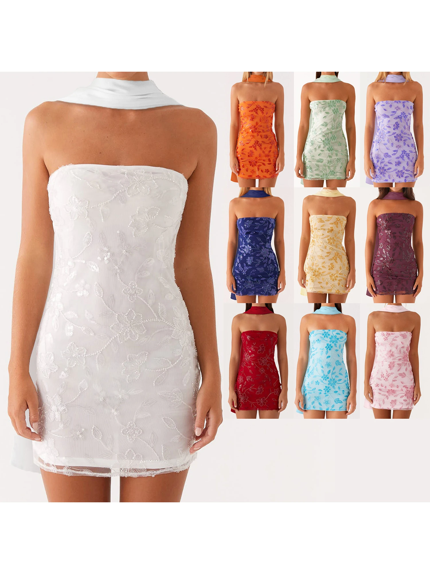 Cyflymder Women s Summer Floral Embroidered Bandeau Dress with Off Shoulder Design and Matching Scarf for a Stylish Look