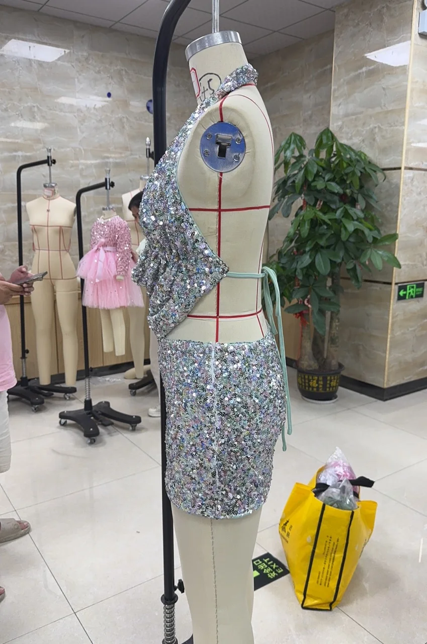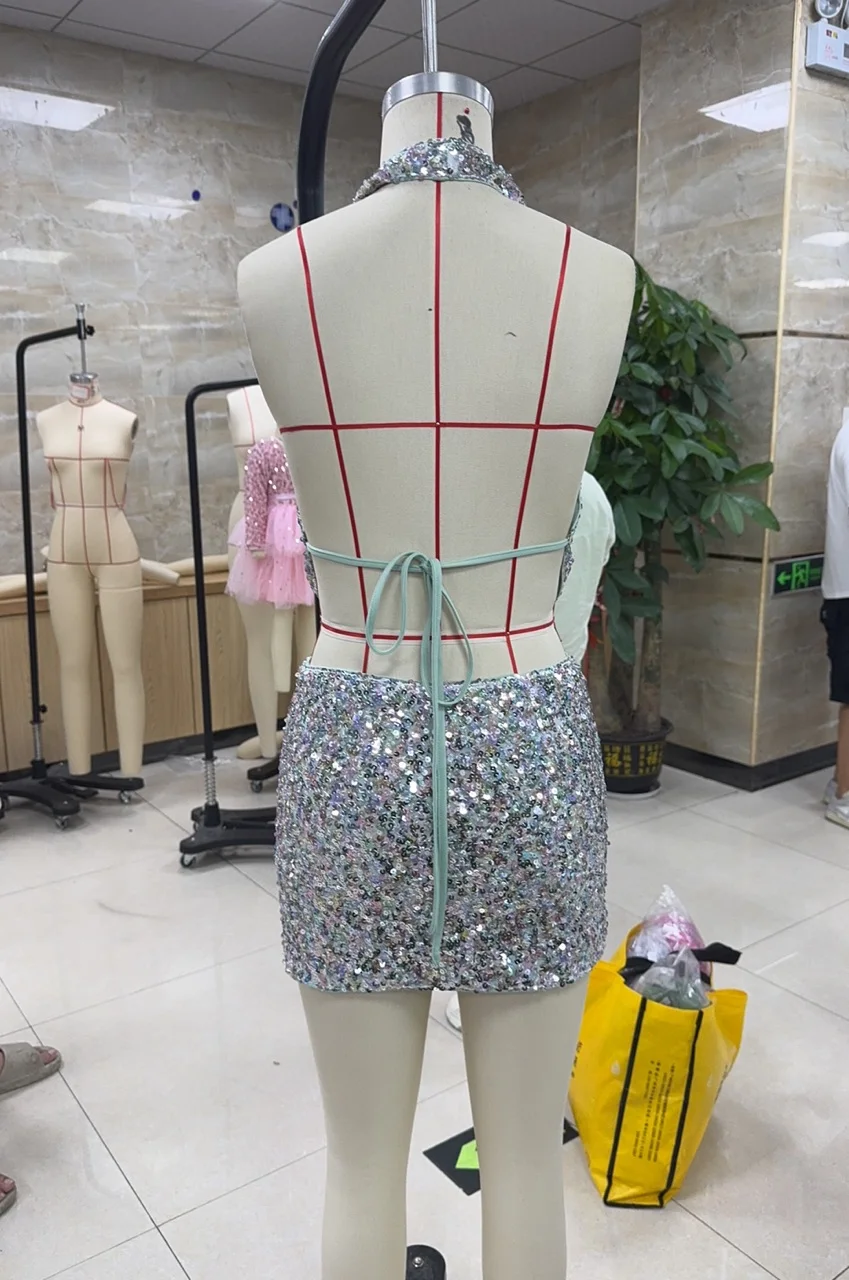 Cyflymder Women Sequin 2 Piece Outfit Sparkly Sexy Bodycon Sleeveless Halter Crop Top Split Mini Skirt Set Going Out Club Suit