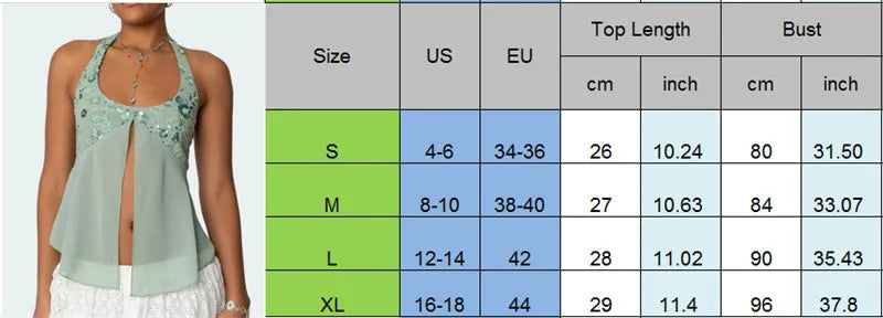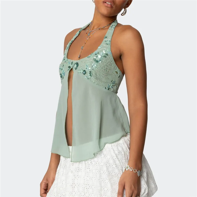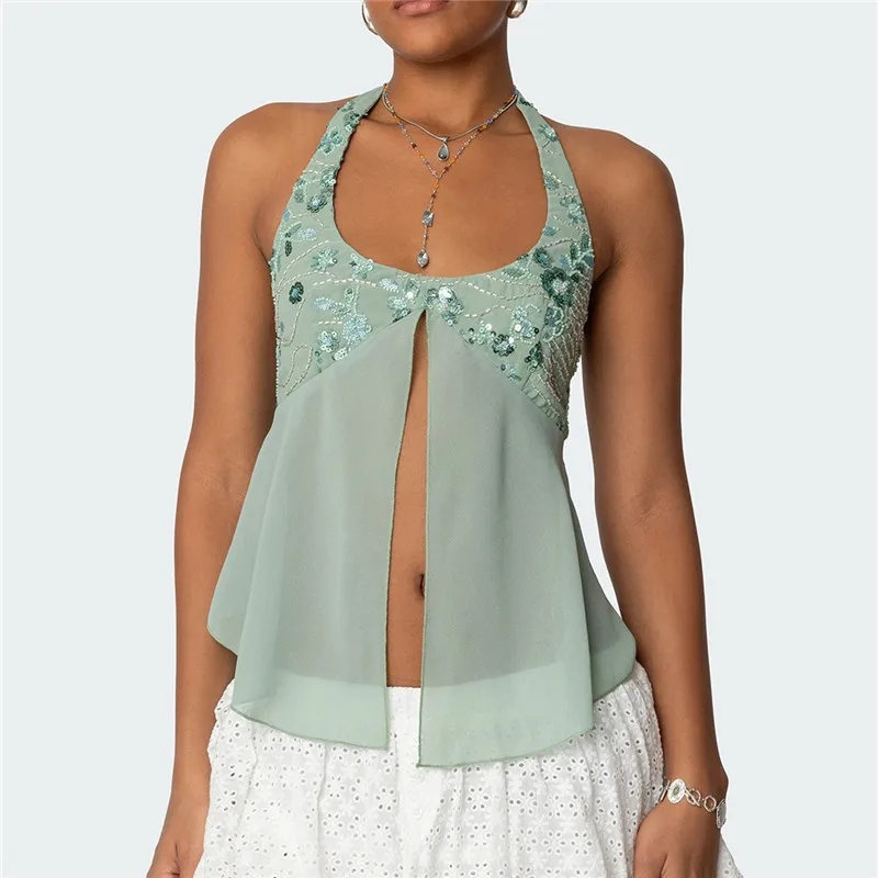 Cyflymder Women Sequins Patchwork Green Chiffon Vest Sexy Halter Backless Sleeveless Cropped Tops Summer Chic Lady High Street Wear