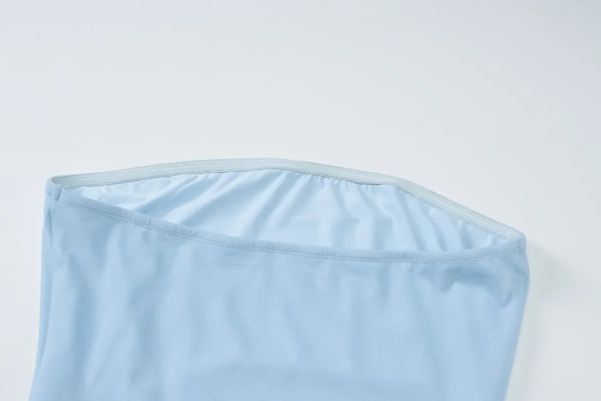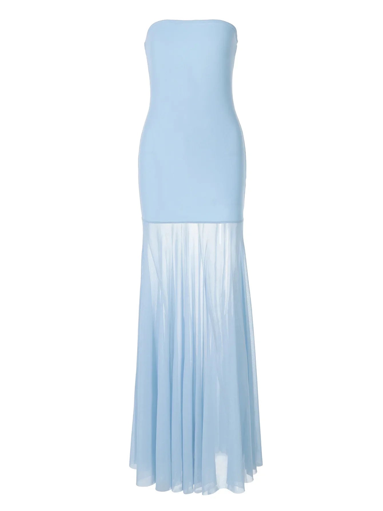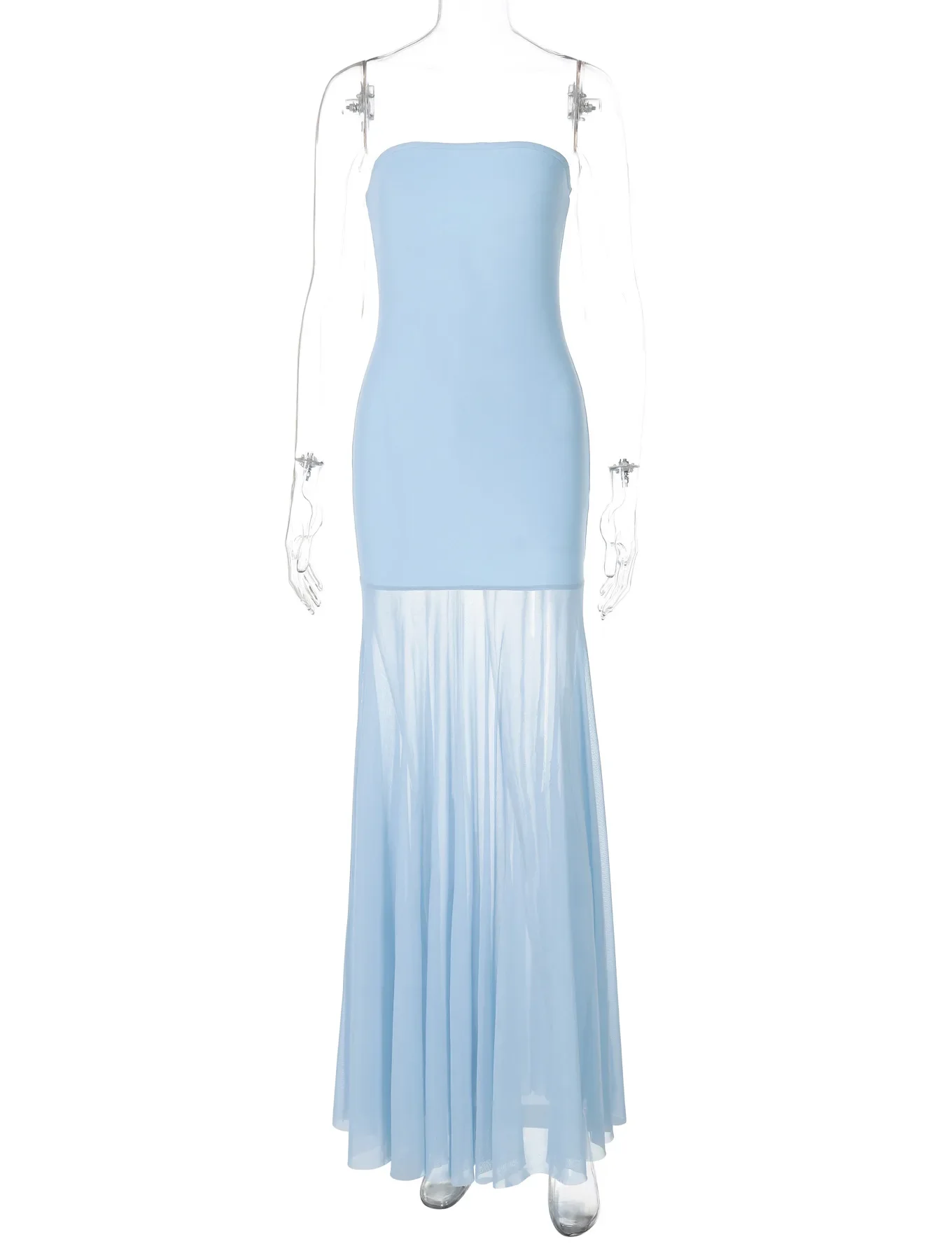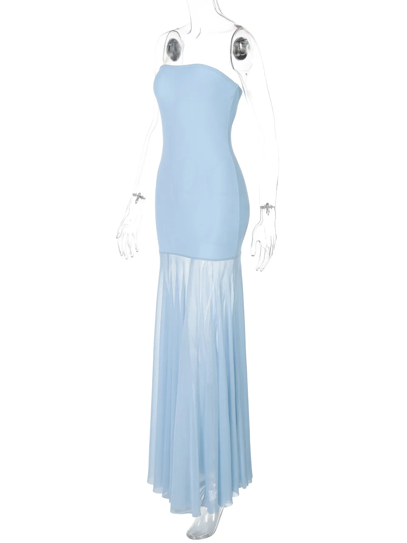 Cyflymder Women Sexy See Through Mesh Patchwork Mermaid Holiday Maxi Dress Strapless Backless Birthday Party Long Robe Vacation Outfits