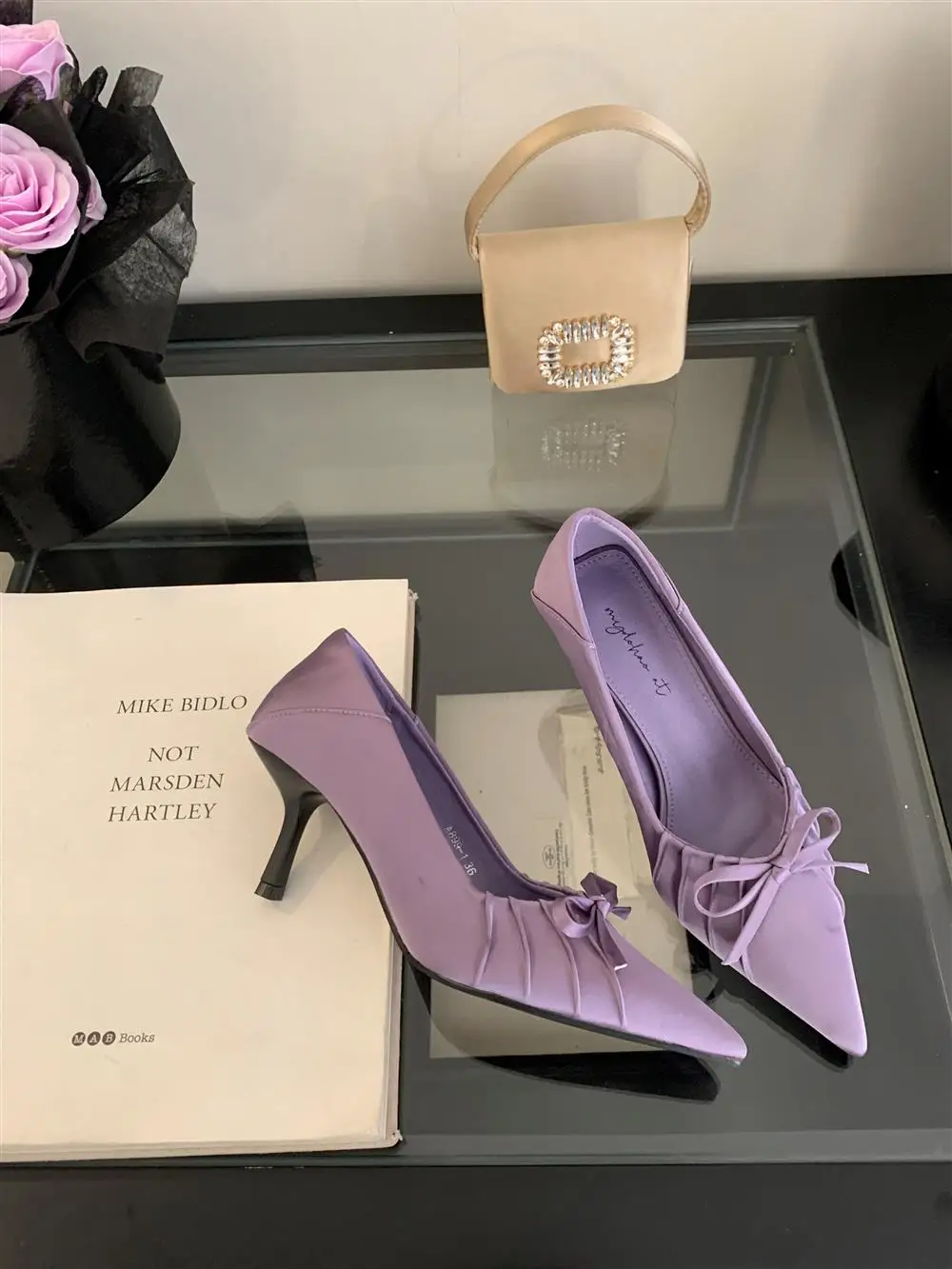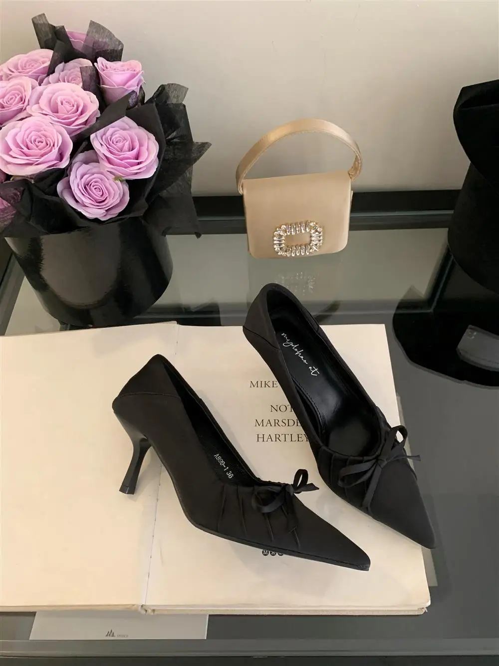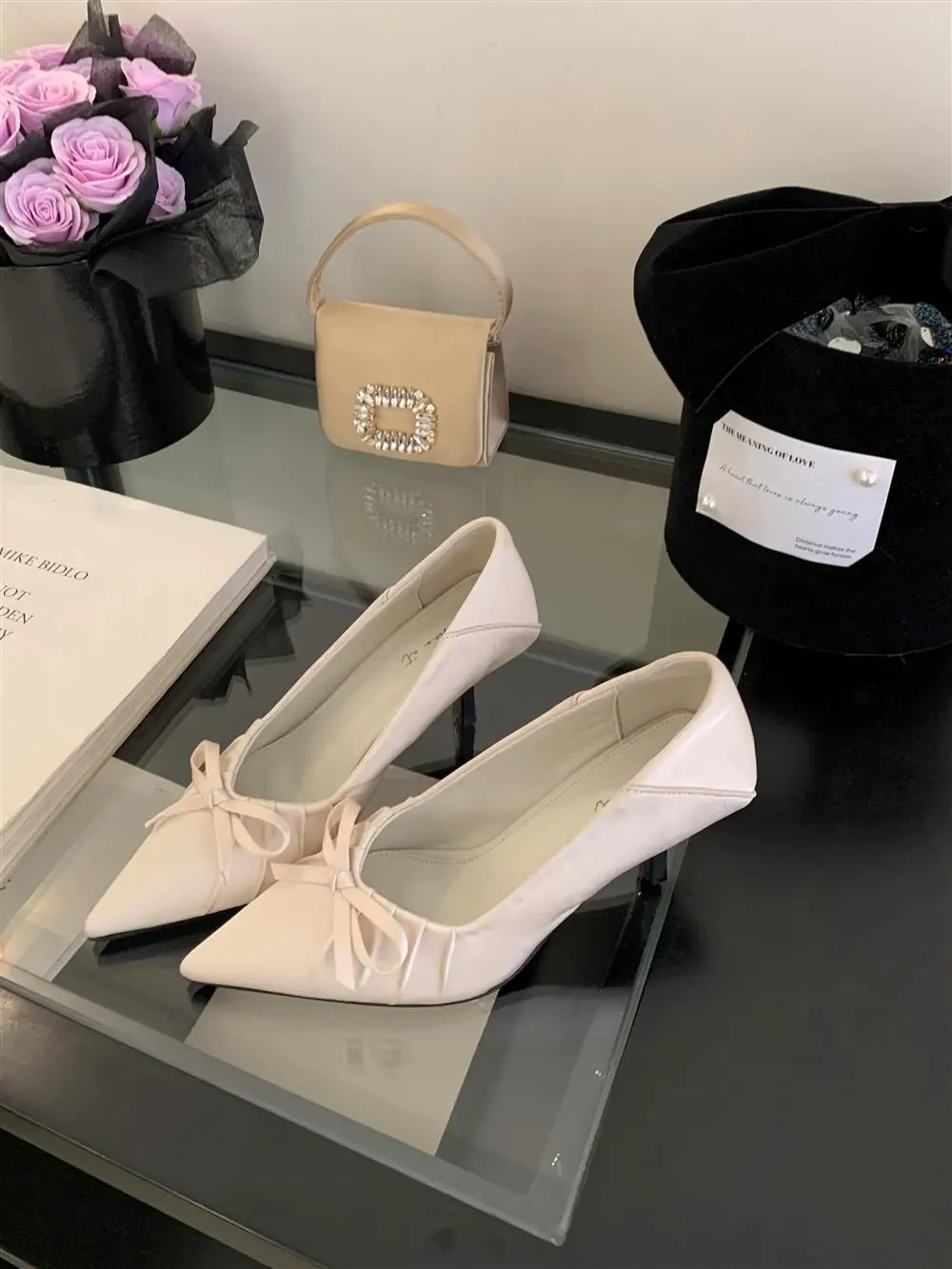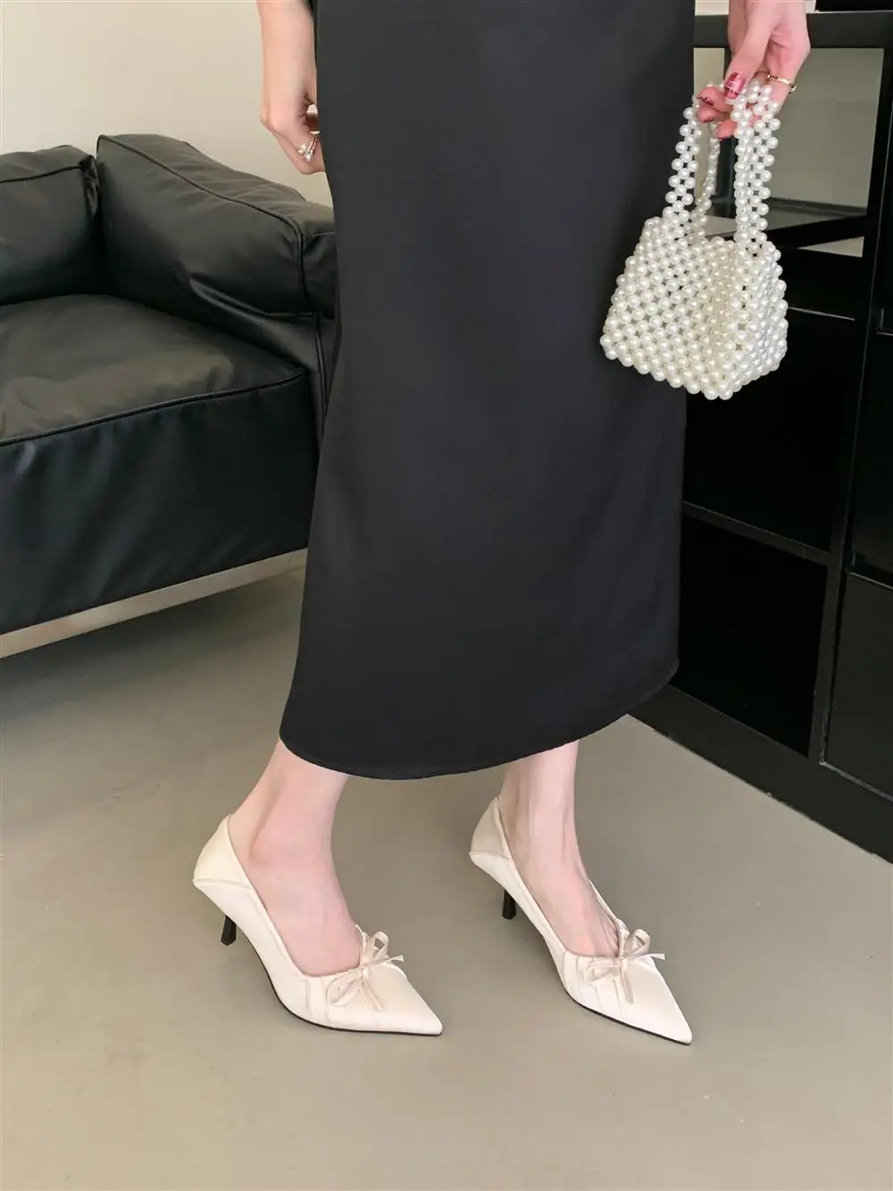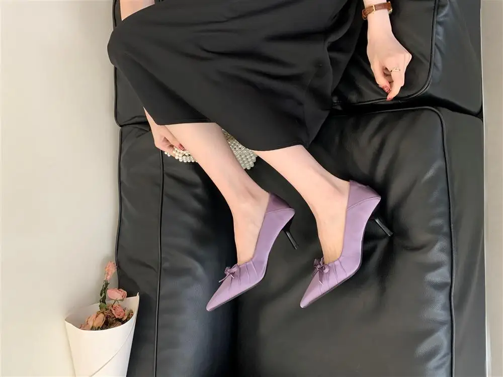 Cyflymder Women Shoes Orange Sandals Ladies High Heels Stiletto Pointed Pumps Shallow Mouth White African Sheepskin Fine Retro Satin Toe B