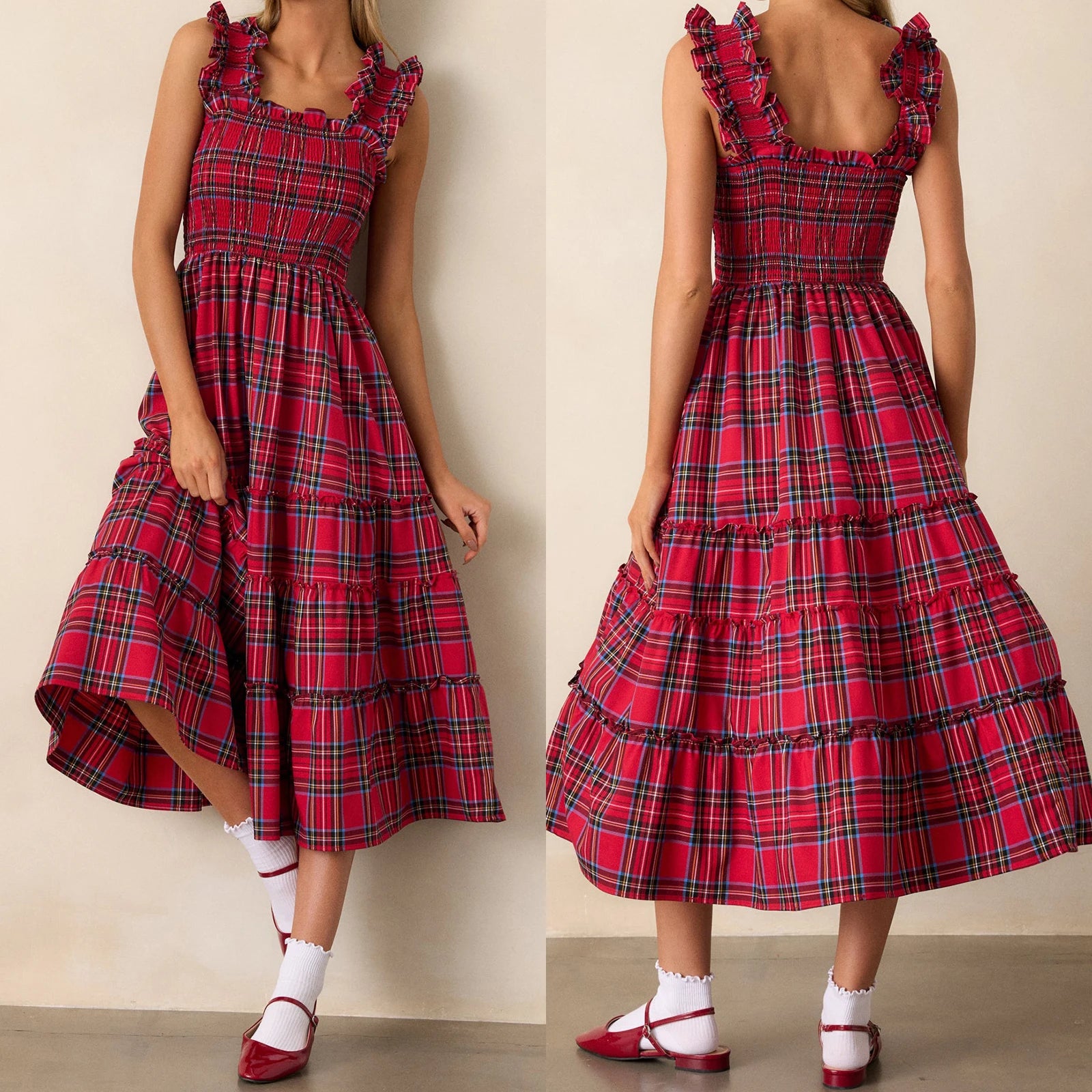 Cyflymder Women Sleeveless Dress Summer Patchwork Casual Plaid Print Ruffled A-Line Party Dress for Beach Club Streetwear