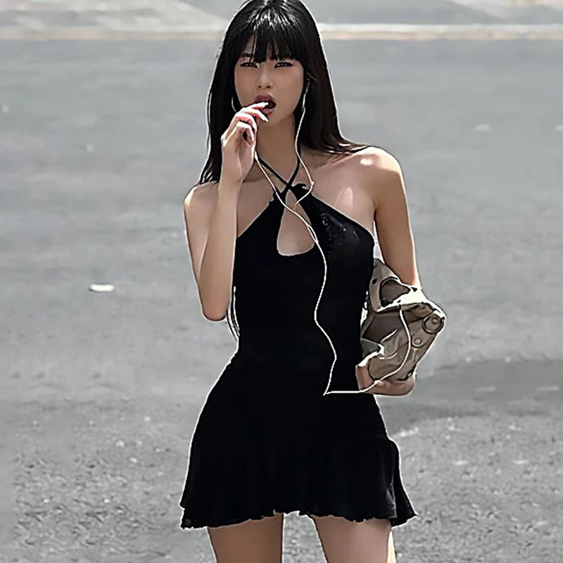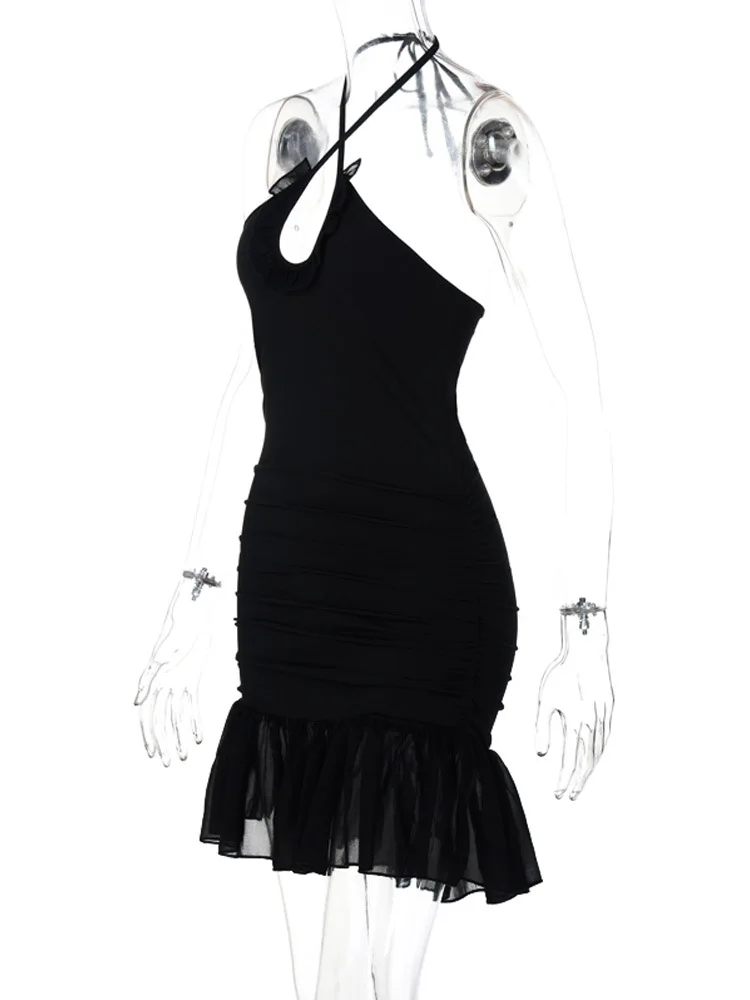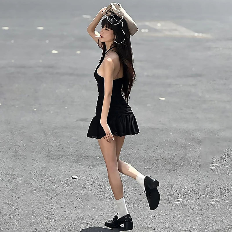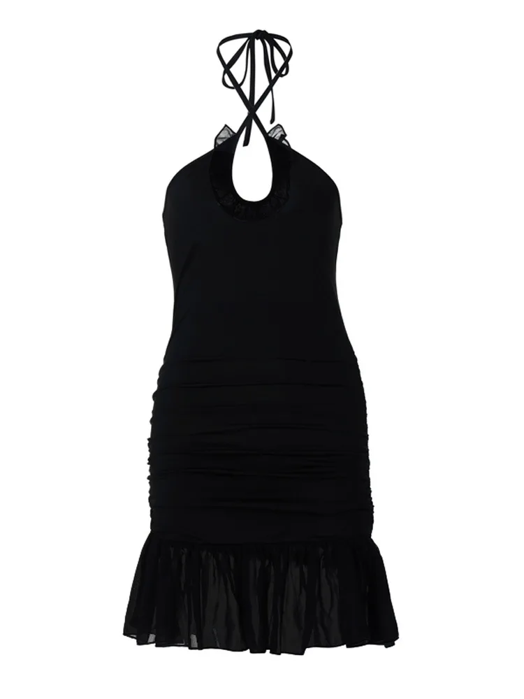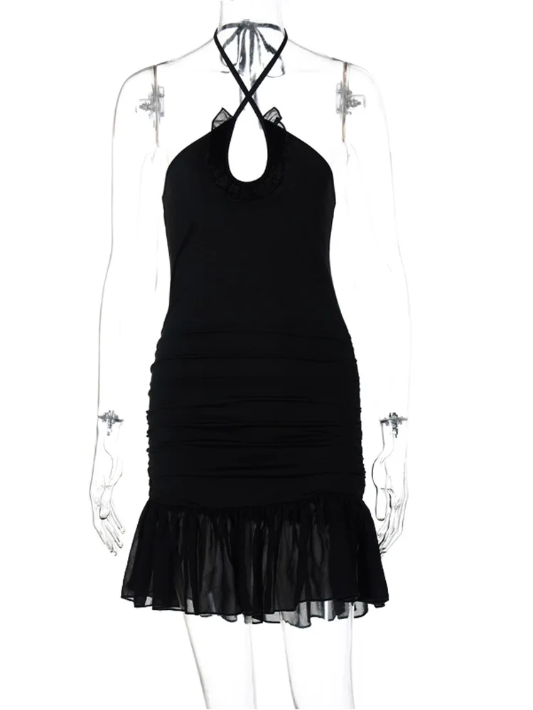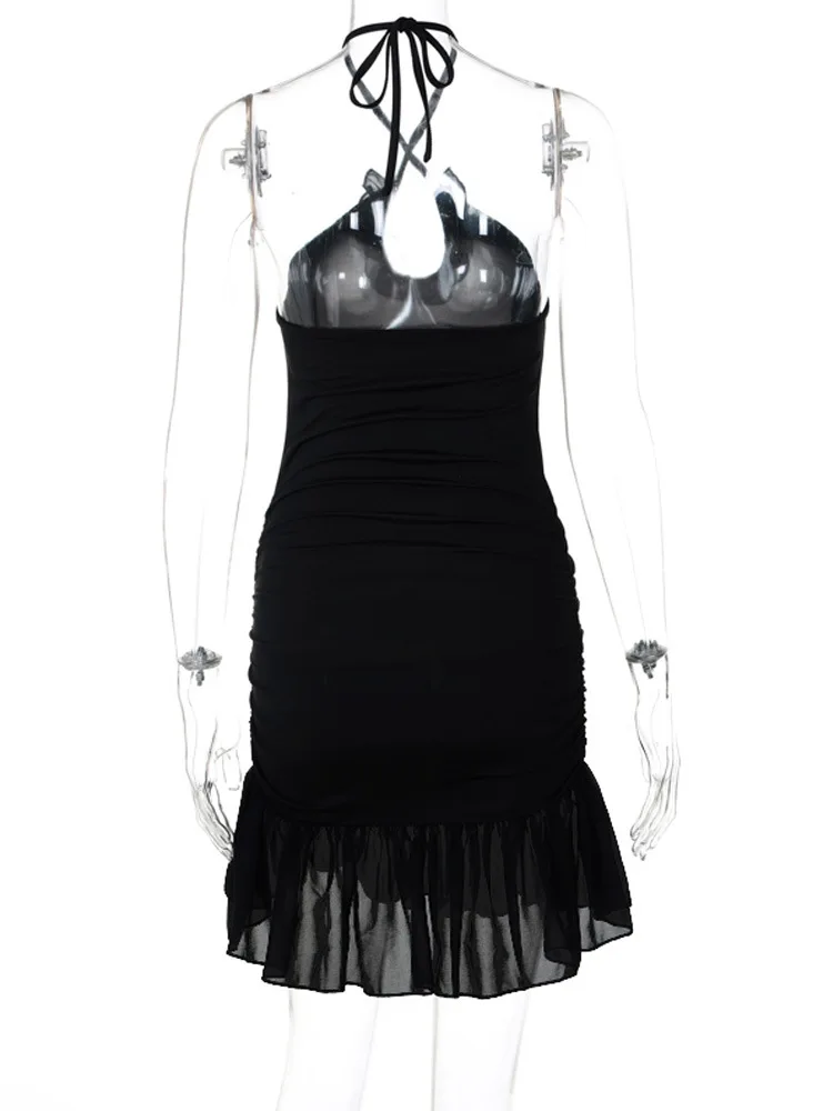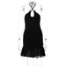 Cyflymder Women Sleeveless Halter Neck Dress Casual Summer Ruffled Backless Ruched Bodycon Party Dress for Beach Club Y2K Streetwear
