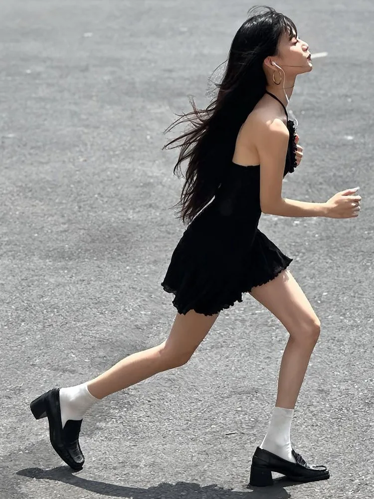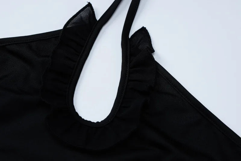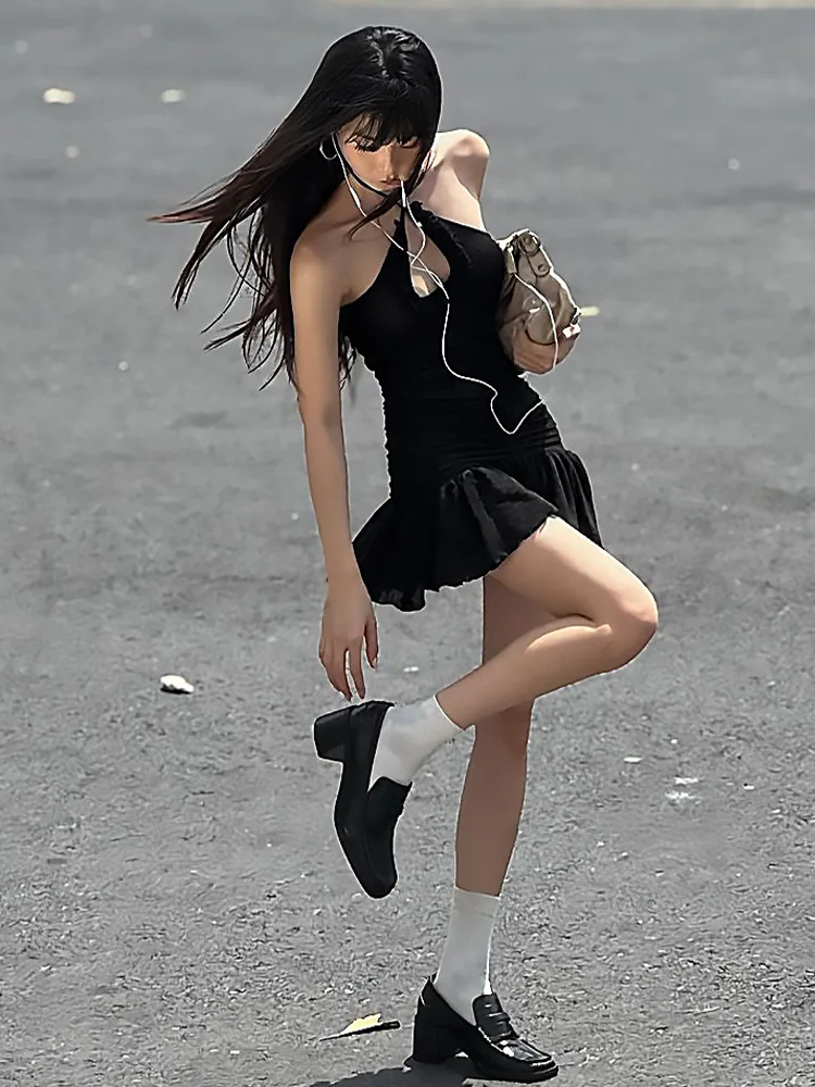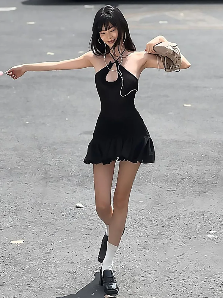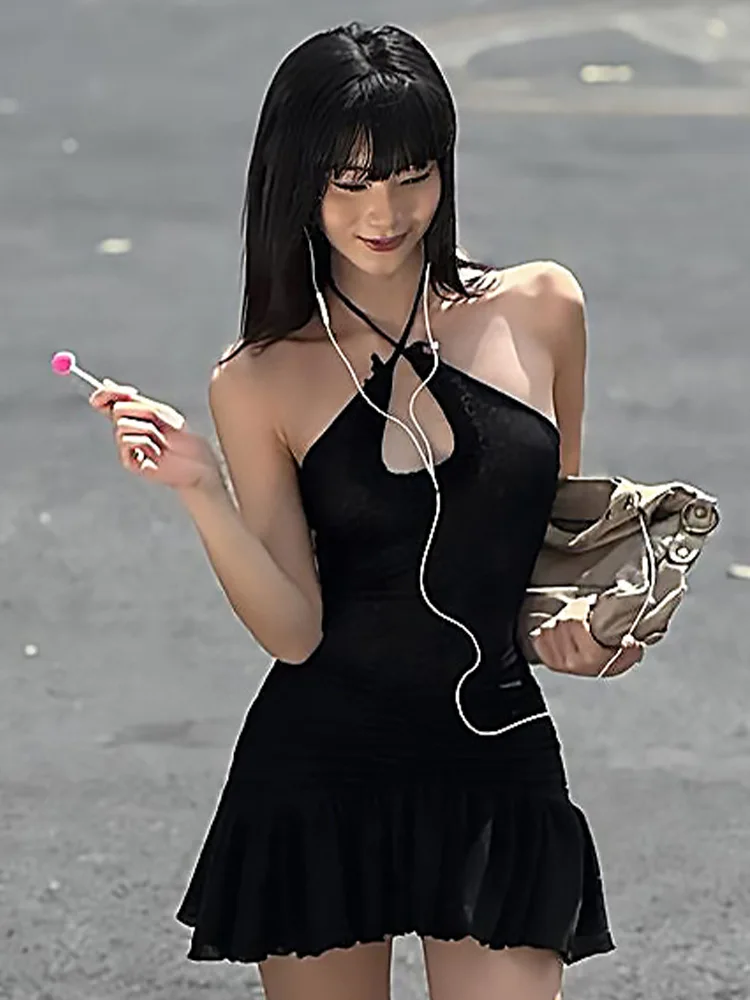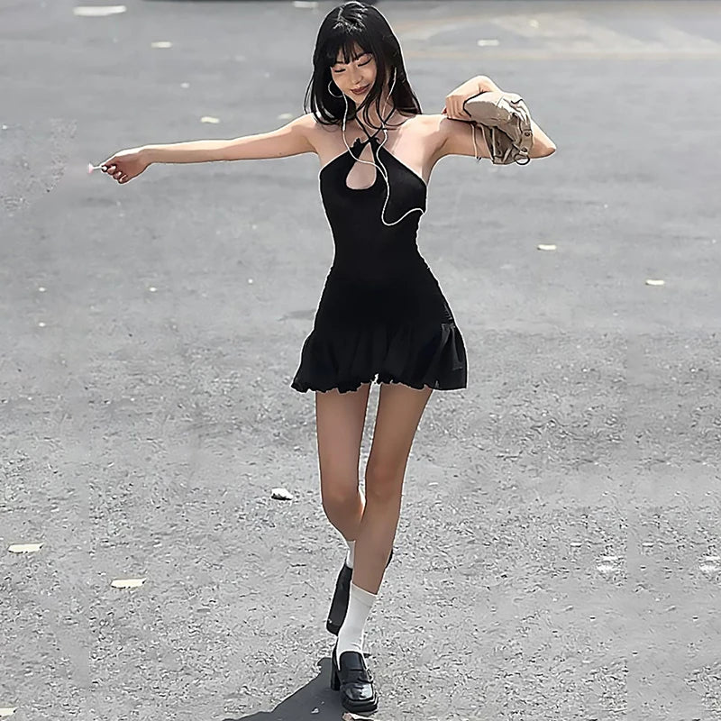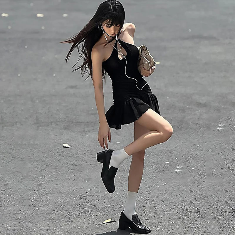 Cyflymder Women Sleeveless Halter Neck Dress Casual Summer Ruffled Backless Ruched Bodycon Party Dress for Beach Club Y2K Streetwear