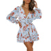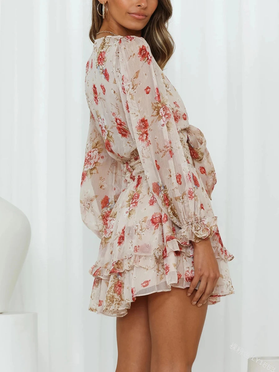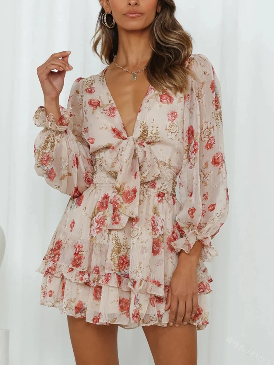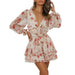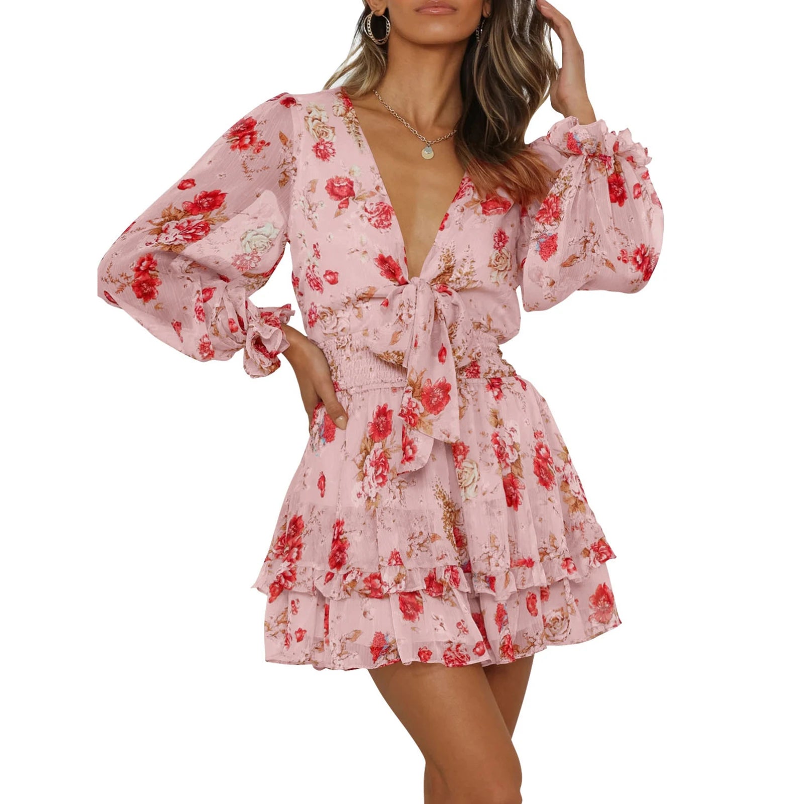 Cyflymder Women Spring Casual Mini Dress Floral Print Deep V-Neck Tie-Up Long Sleeve Sweet Dress Fashion Ruffles Dress
