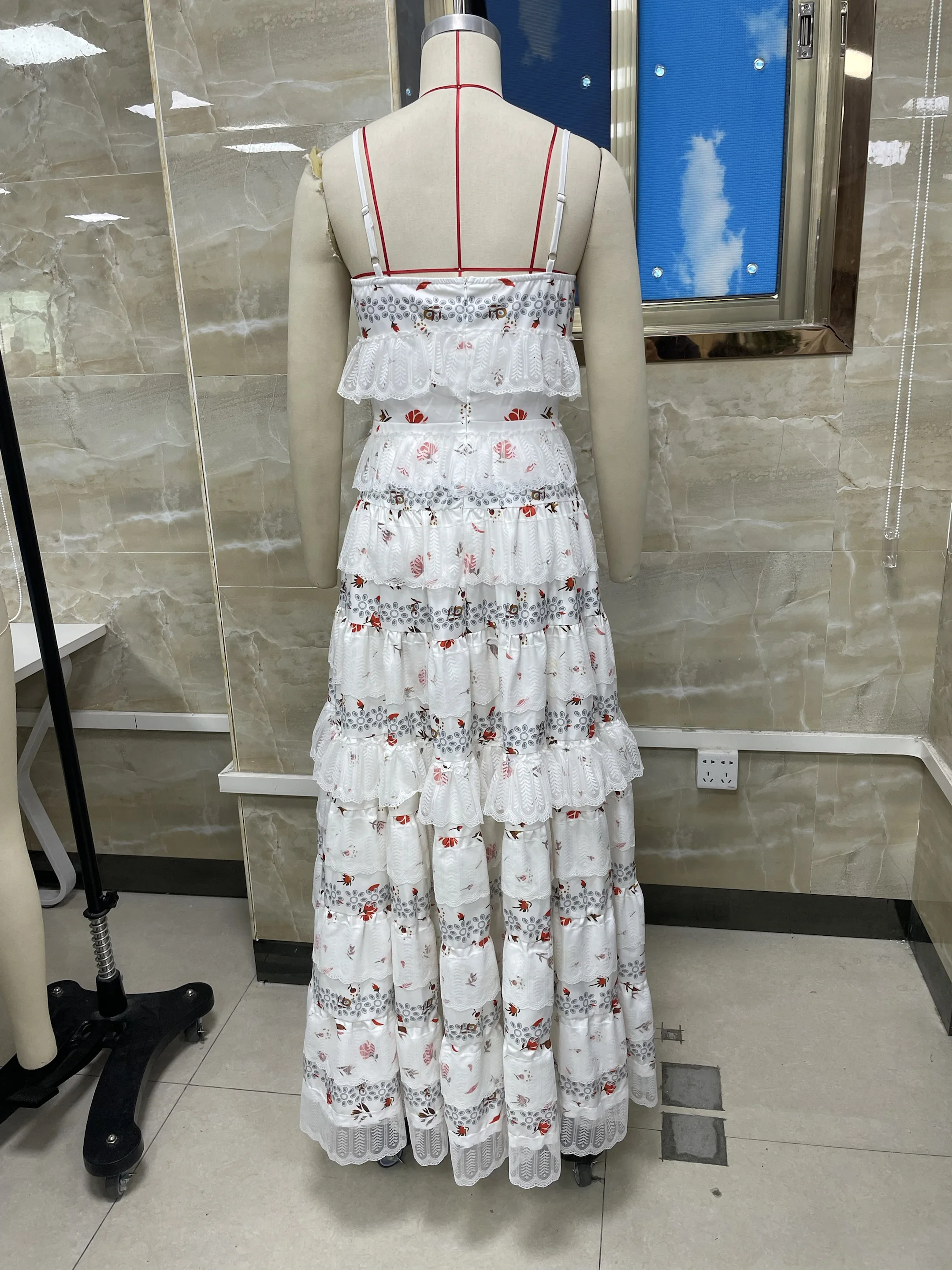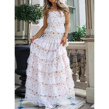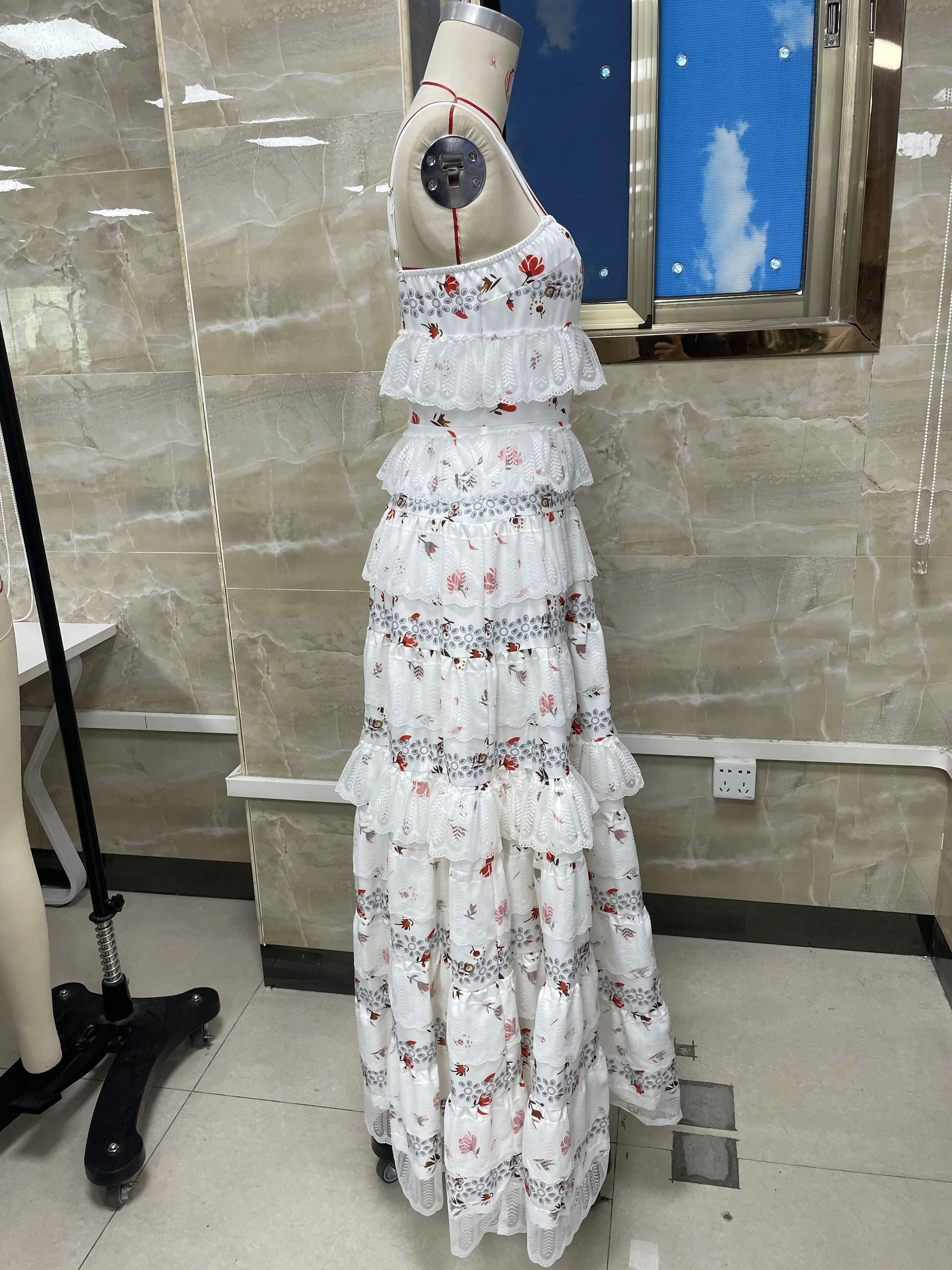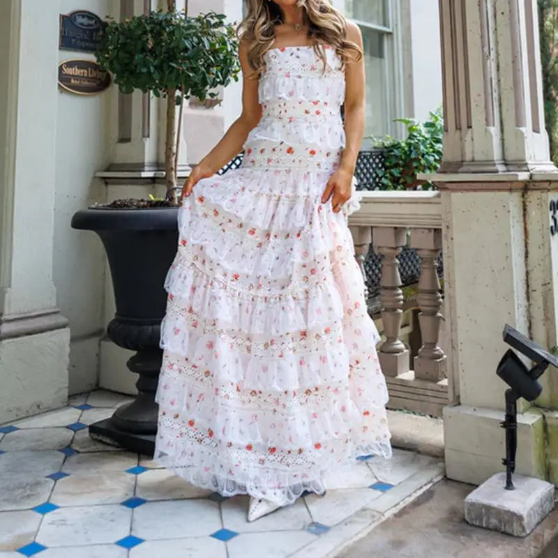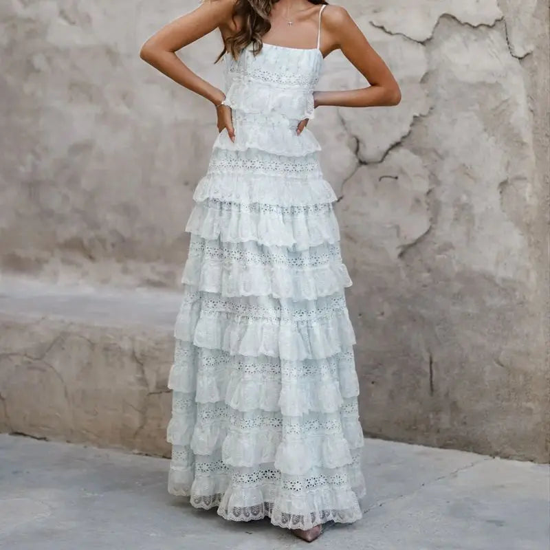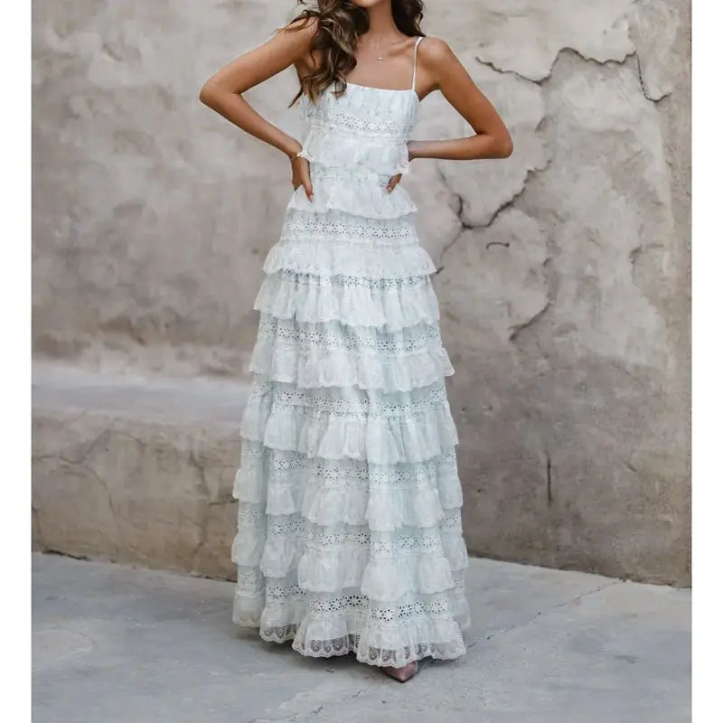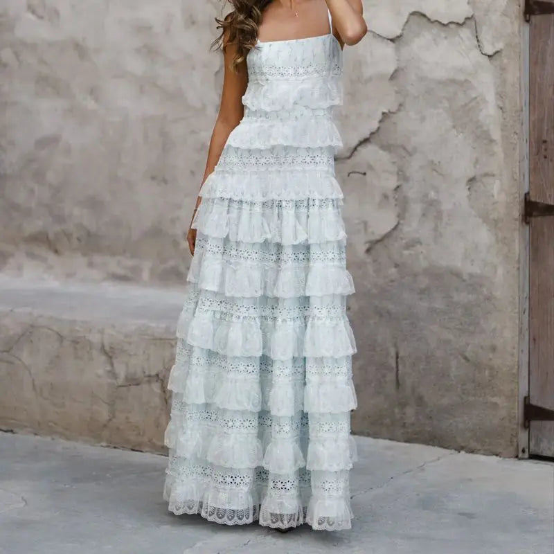 Cyflymder Women Summer Adjustable Thin Shoulder Straps Sleeveless Square Neck Lace Patchwork Patchwoek A-line Cami Long Dress