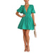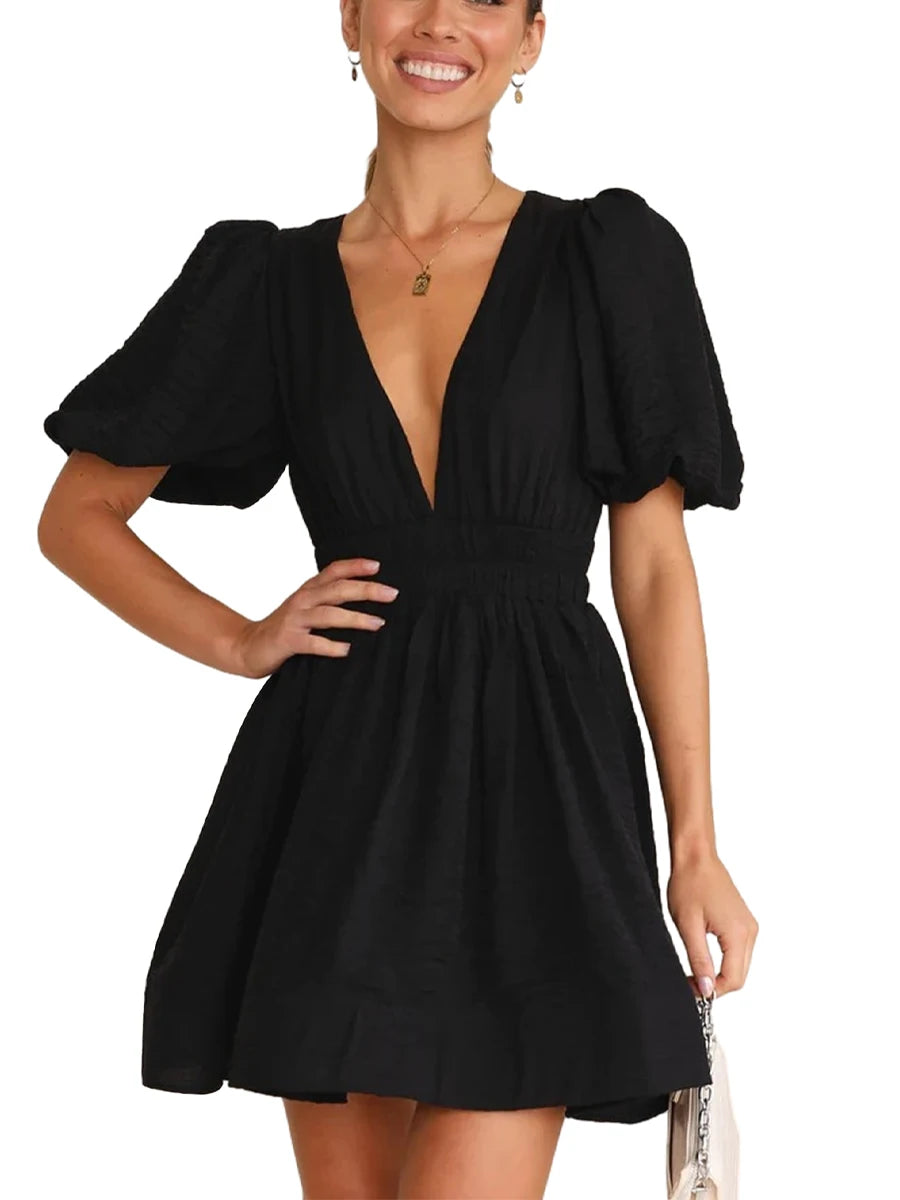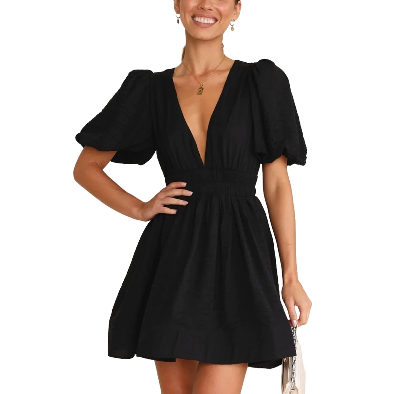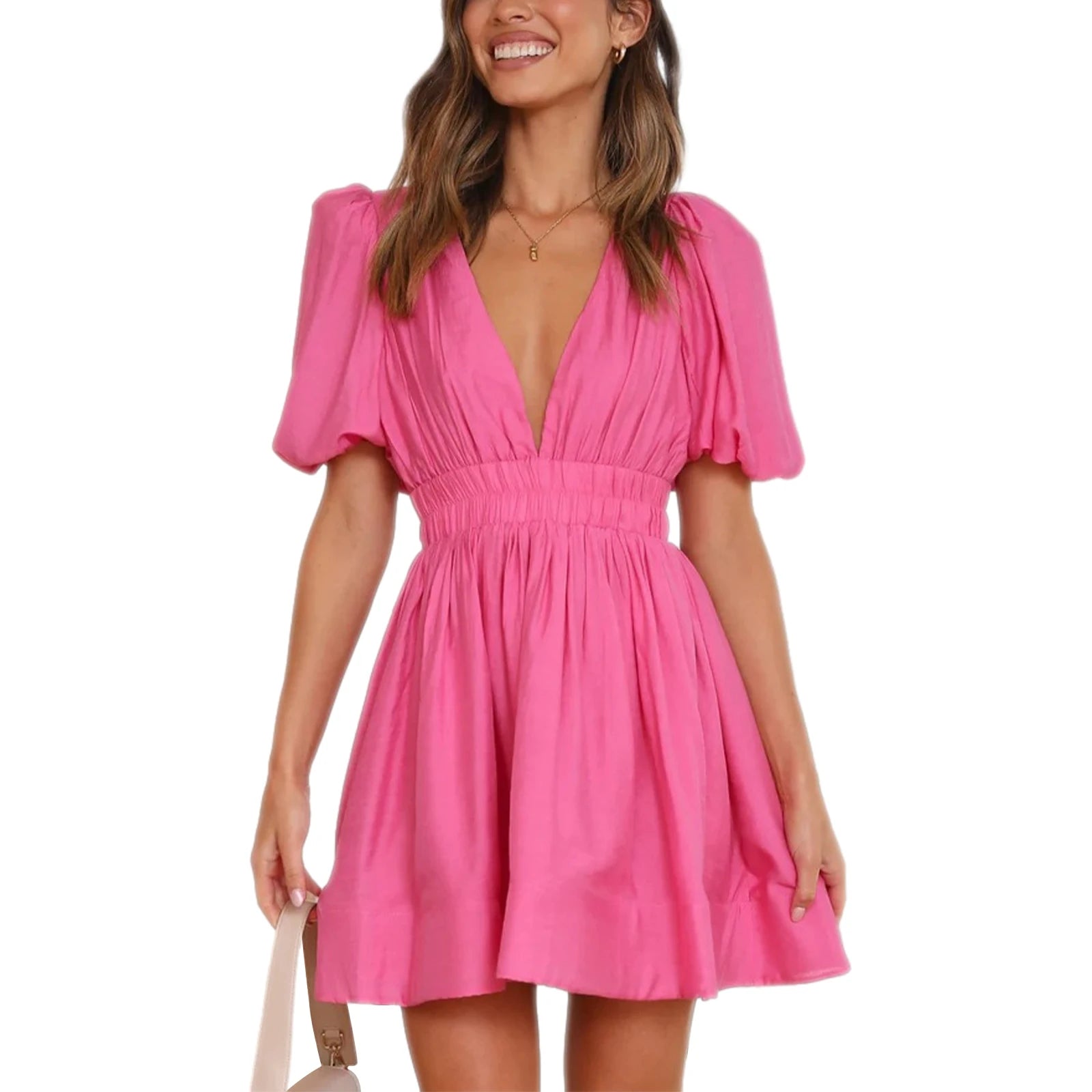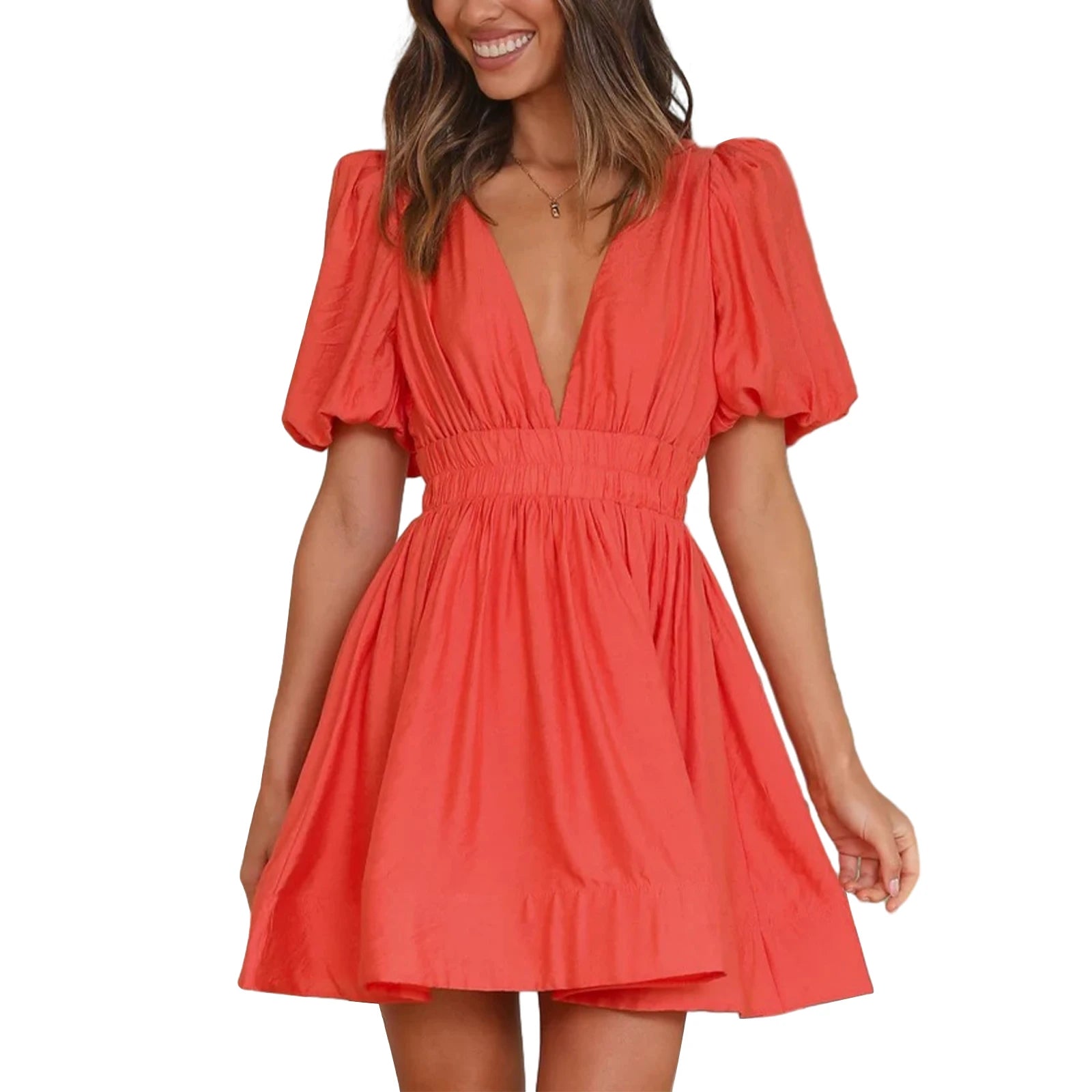 Cyflymder Women Summer Casual A-line Dress Solid Color Deep V-Neck Short Puff Sleeve Mini Dress Fashion Party Short Dress