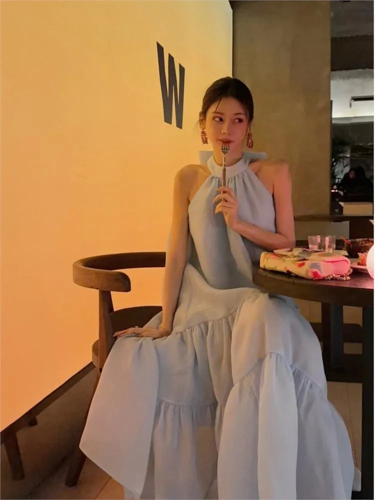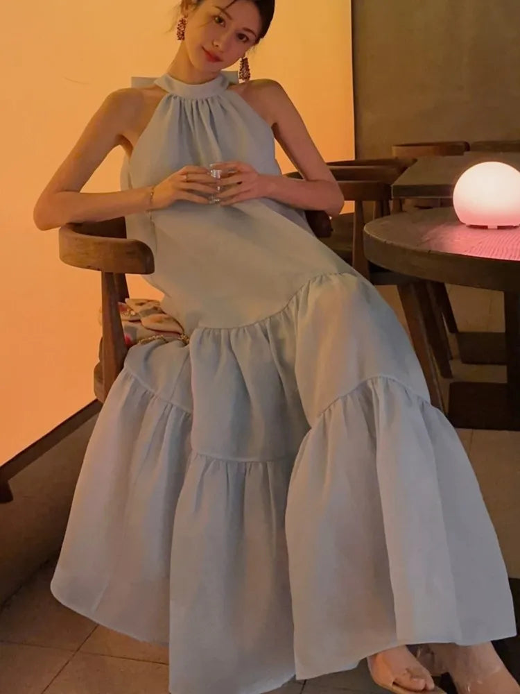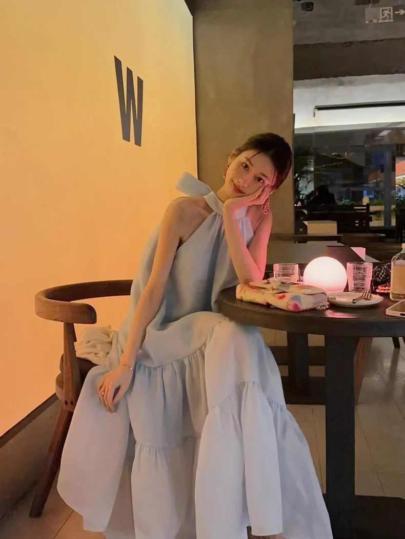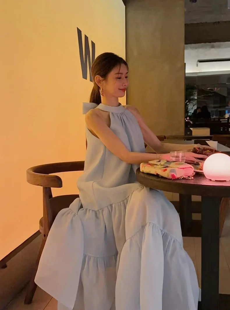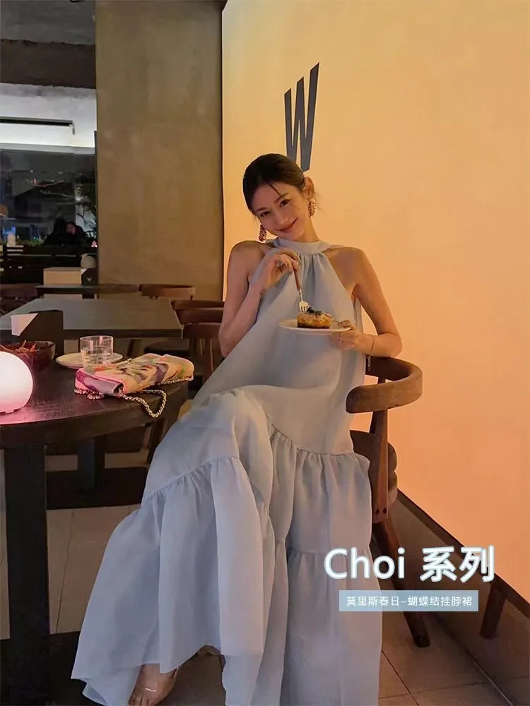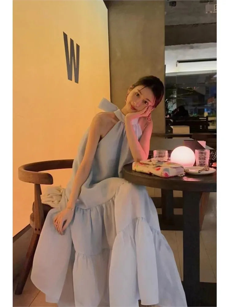Cyflymder Women Summer Halter Bow Blue Long Dress kawaii vestidos de fiesta prom deesses платье корейский стиль veatido elegante