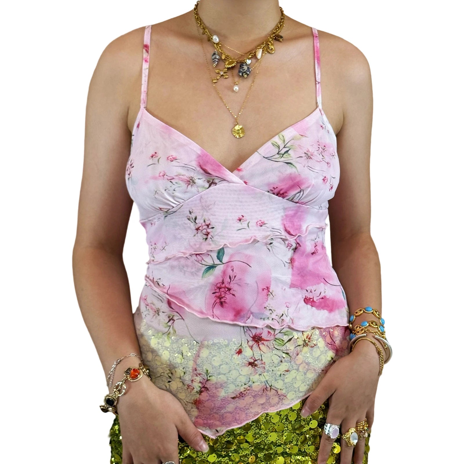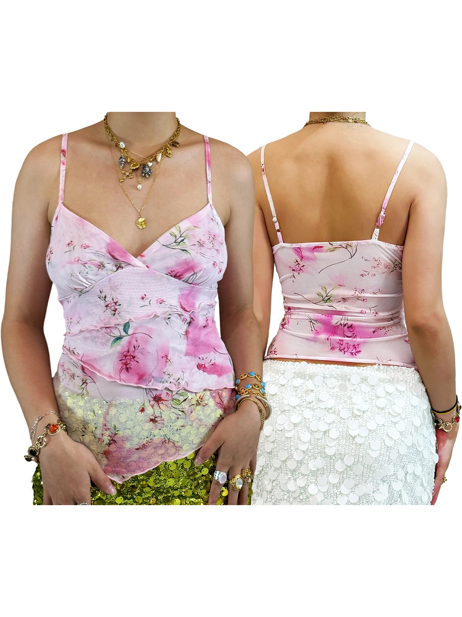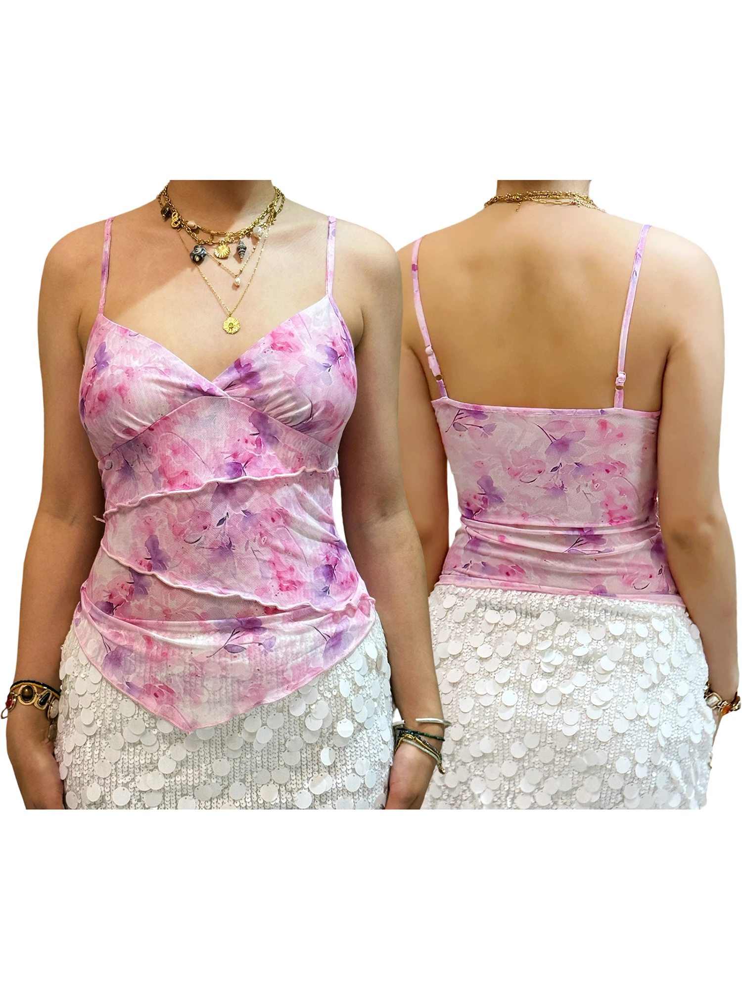Cyflymder Women Summer Irregular Camisole Casual Lettuce Trim Floral Print V-Neck Spaghetti Straps Tank Tops