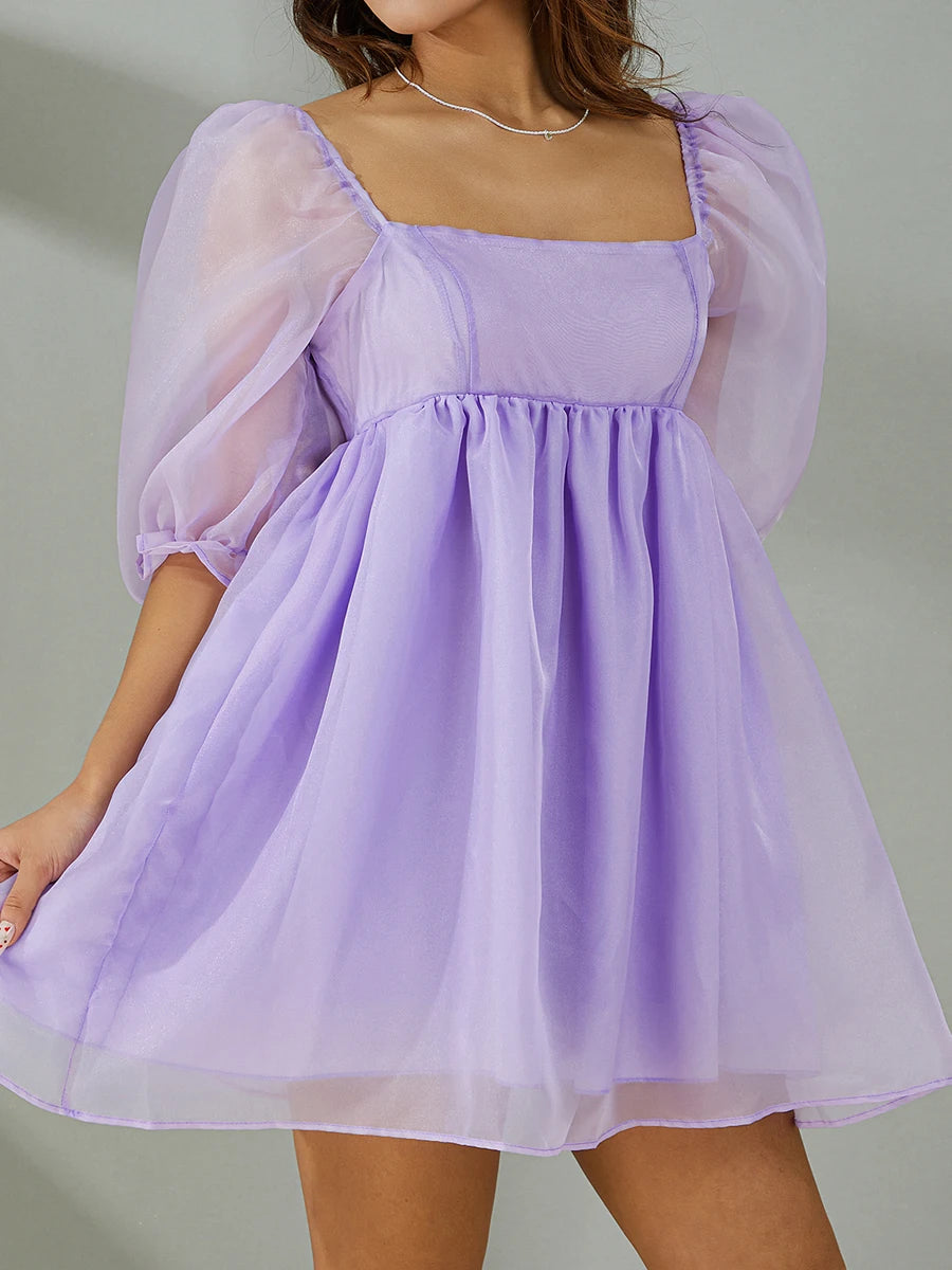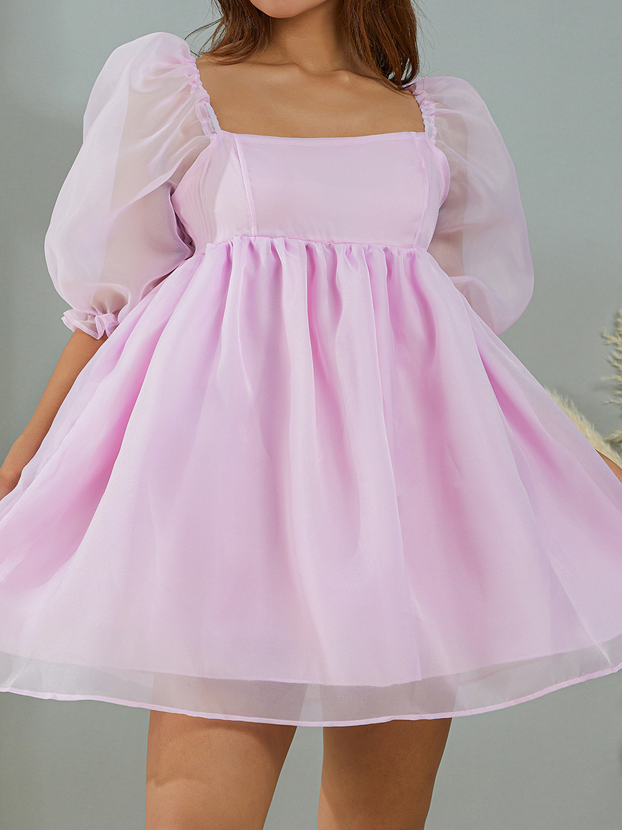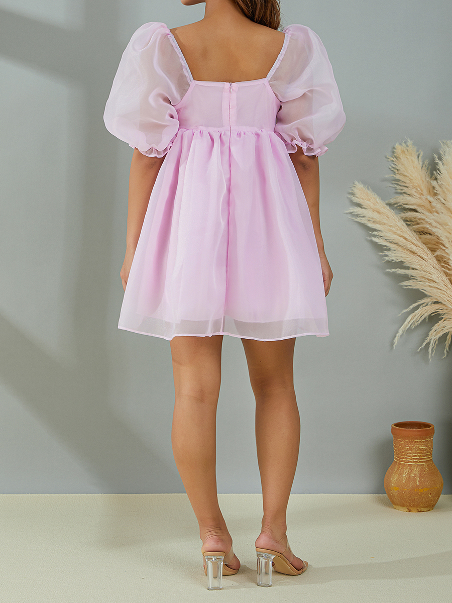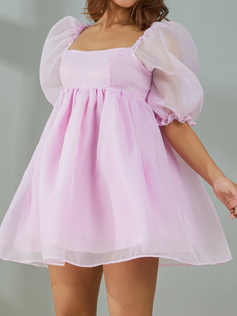Cyflymder Women Summer Party Puffy Dress Solid Color Square Neck Bubble Sleeve Short Dress for Ladies Pink/Purple/Yellow