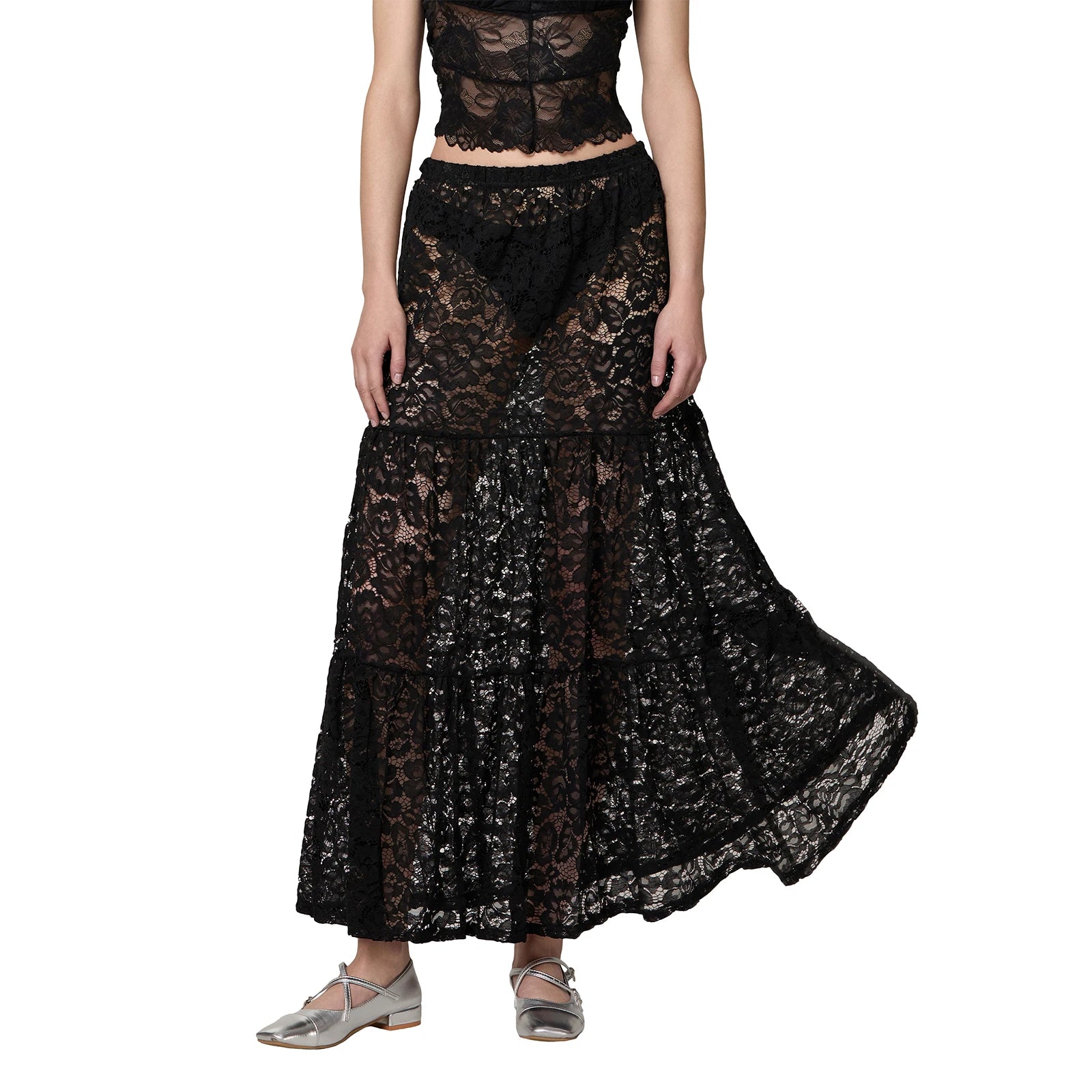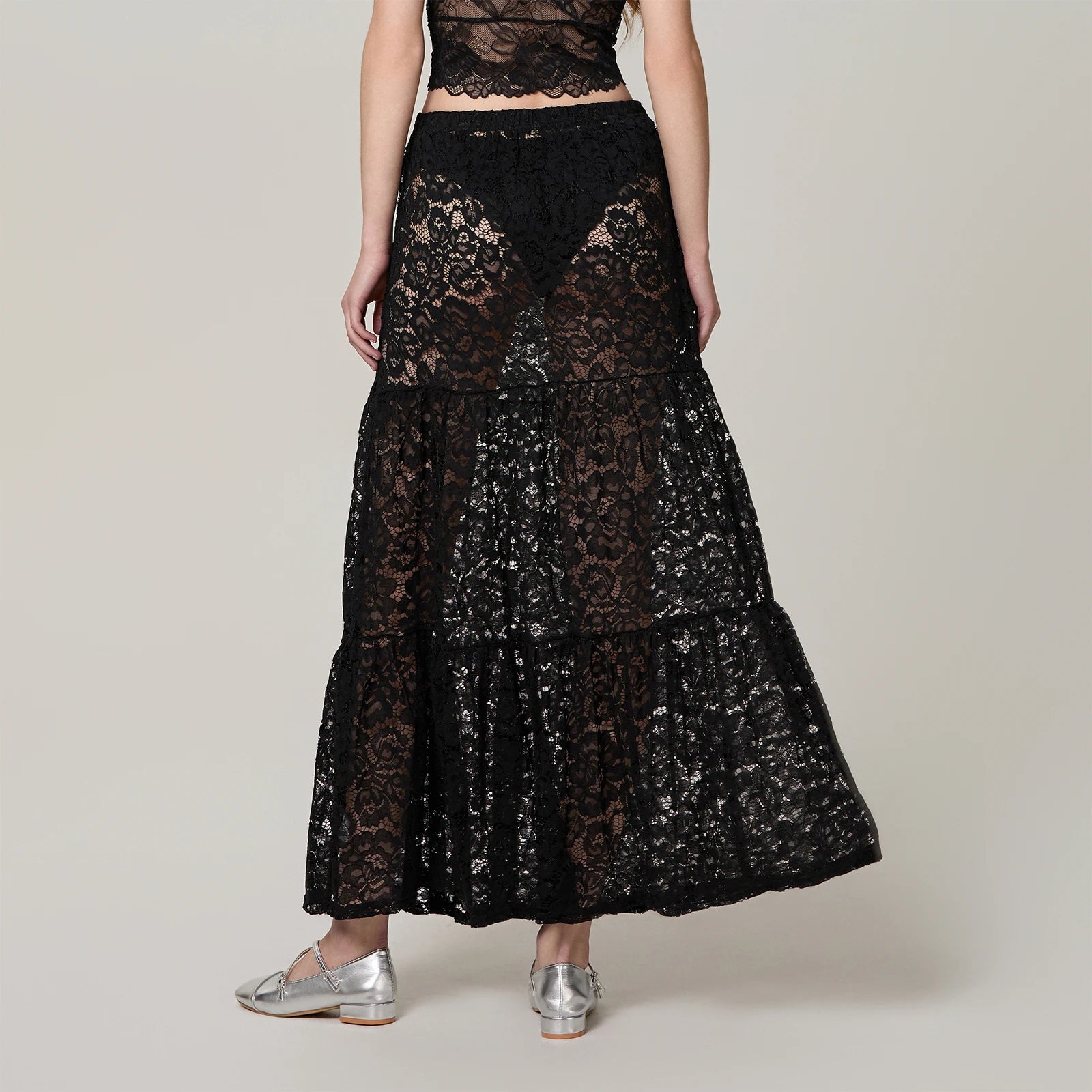 Cyflymder Women Summer Solid Color Long Skirt Casual See-Through Lace Elastic A-Line Skirt for Beach Vacation Club