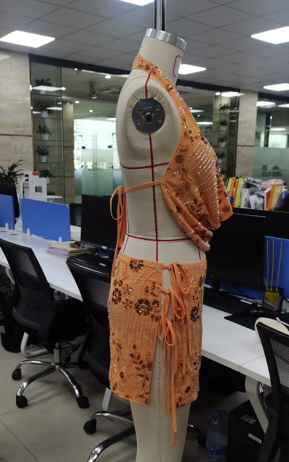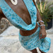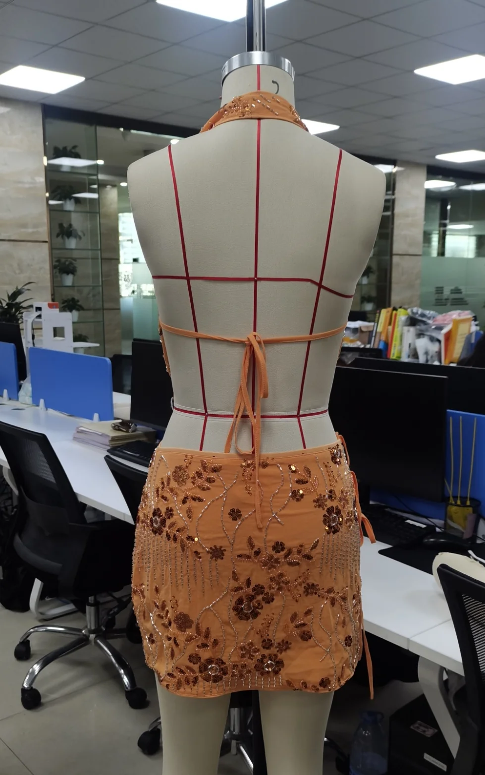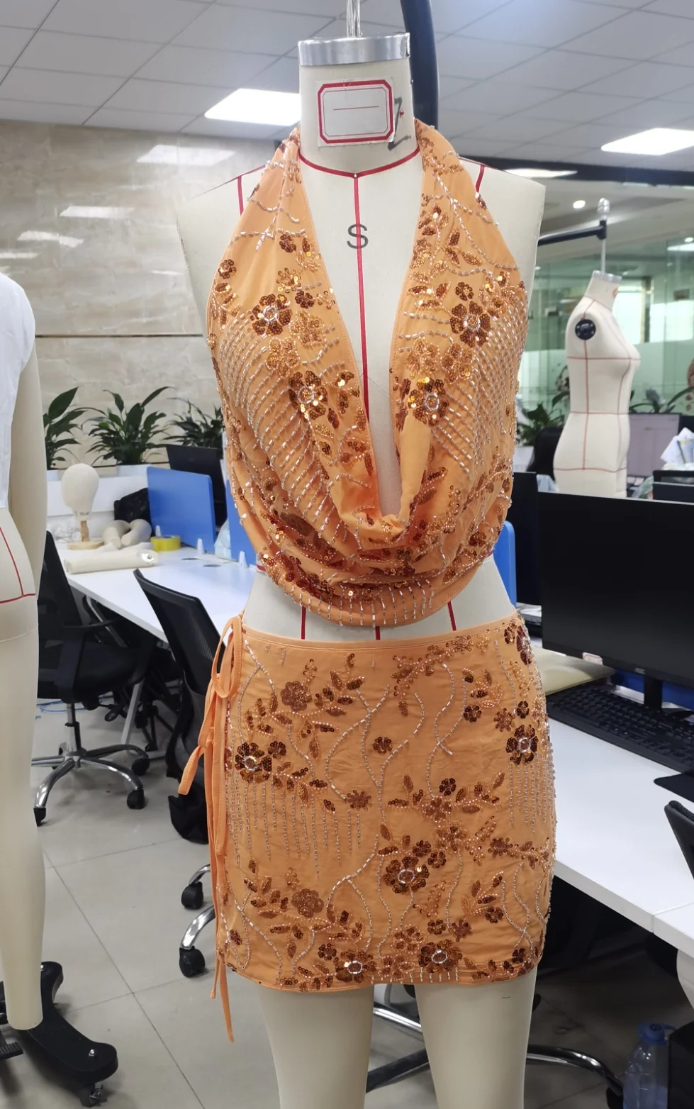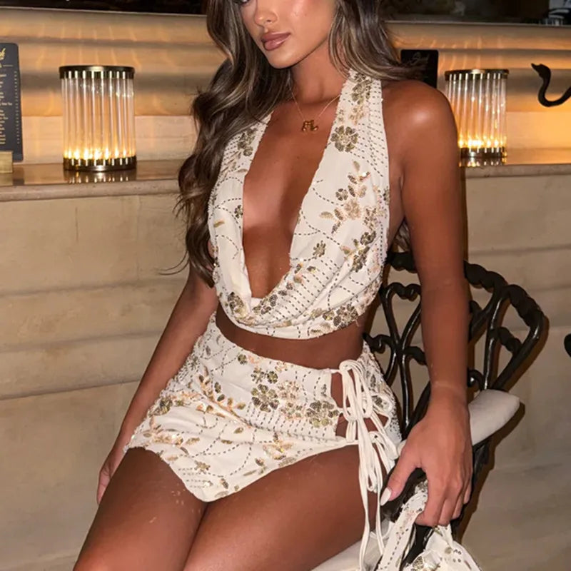 Cyflymder Women Two Piece Skirt Set Sequined Beaded Flower Halterneck Backless Vest with Tie-up Mini Skirt Summer Party Outfit