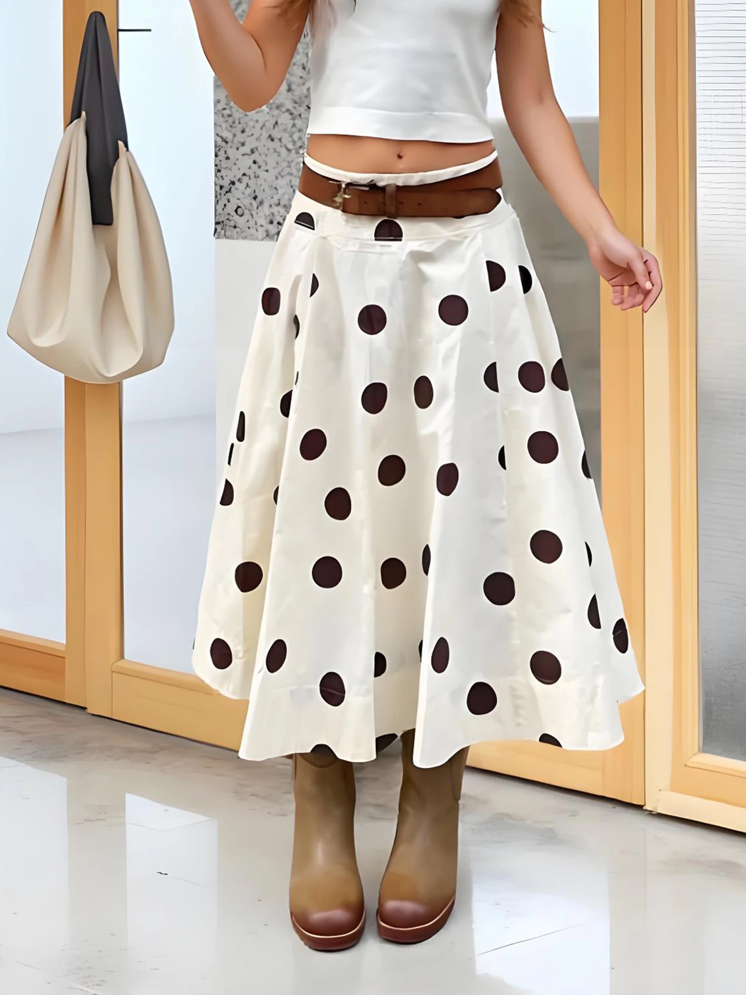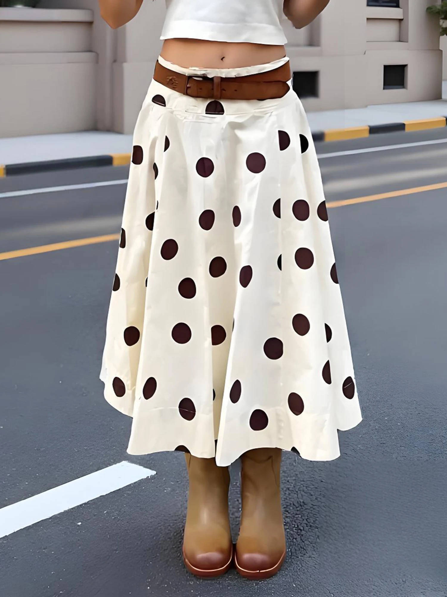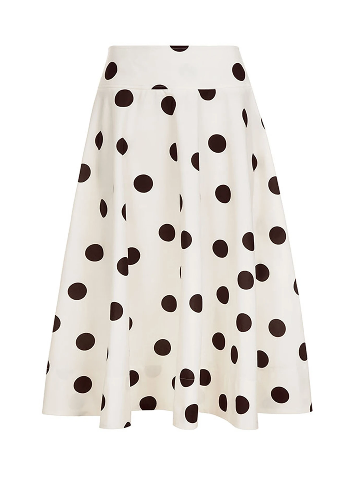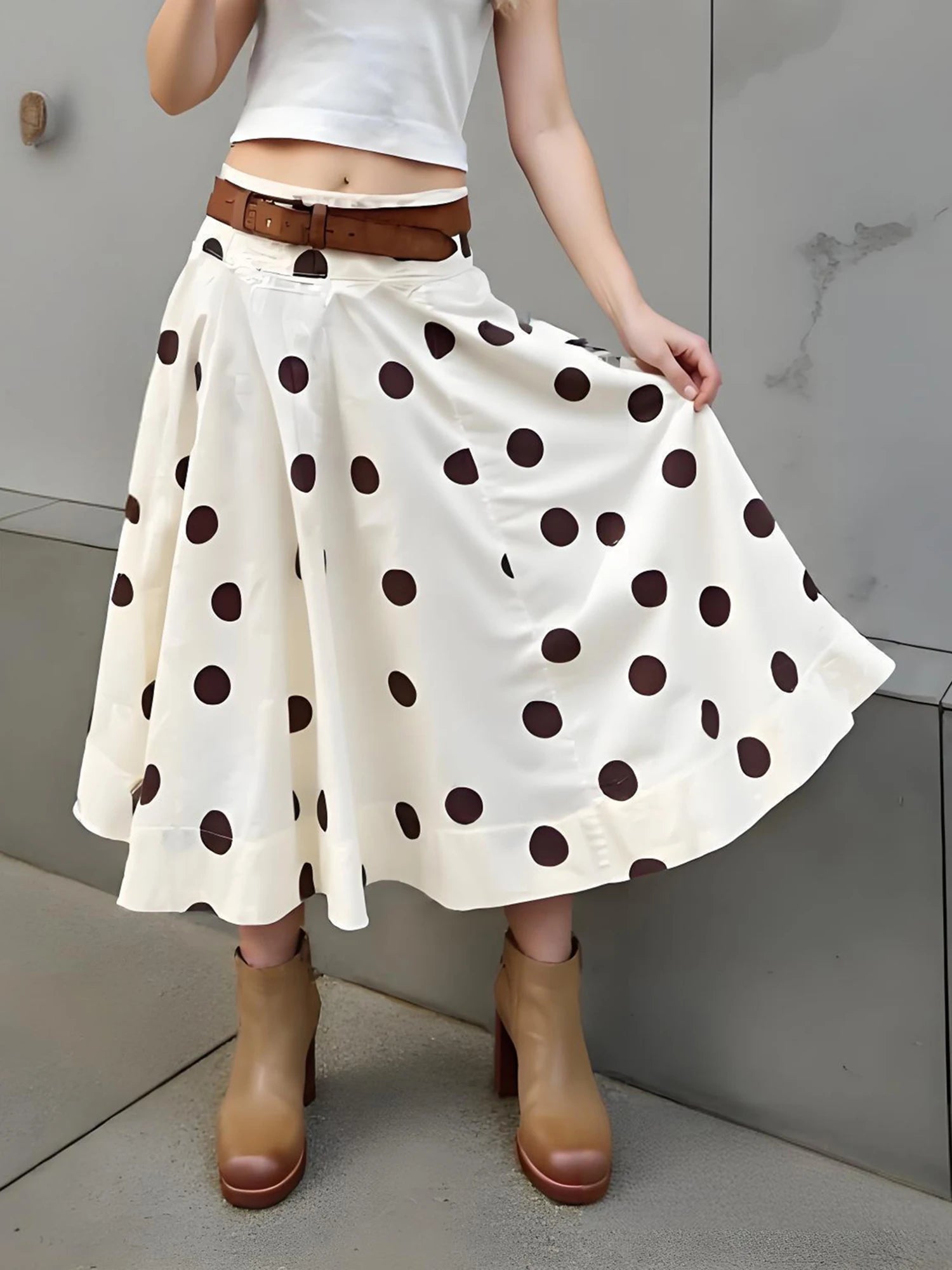 Cyflymder Women White A-Line Skirt Dots Print High Waist Midi Skirt Elegant Swing Skirts for Daily Leisure and Work