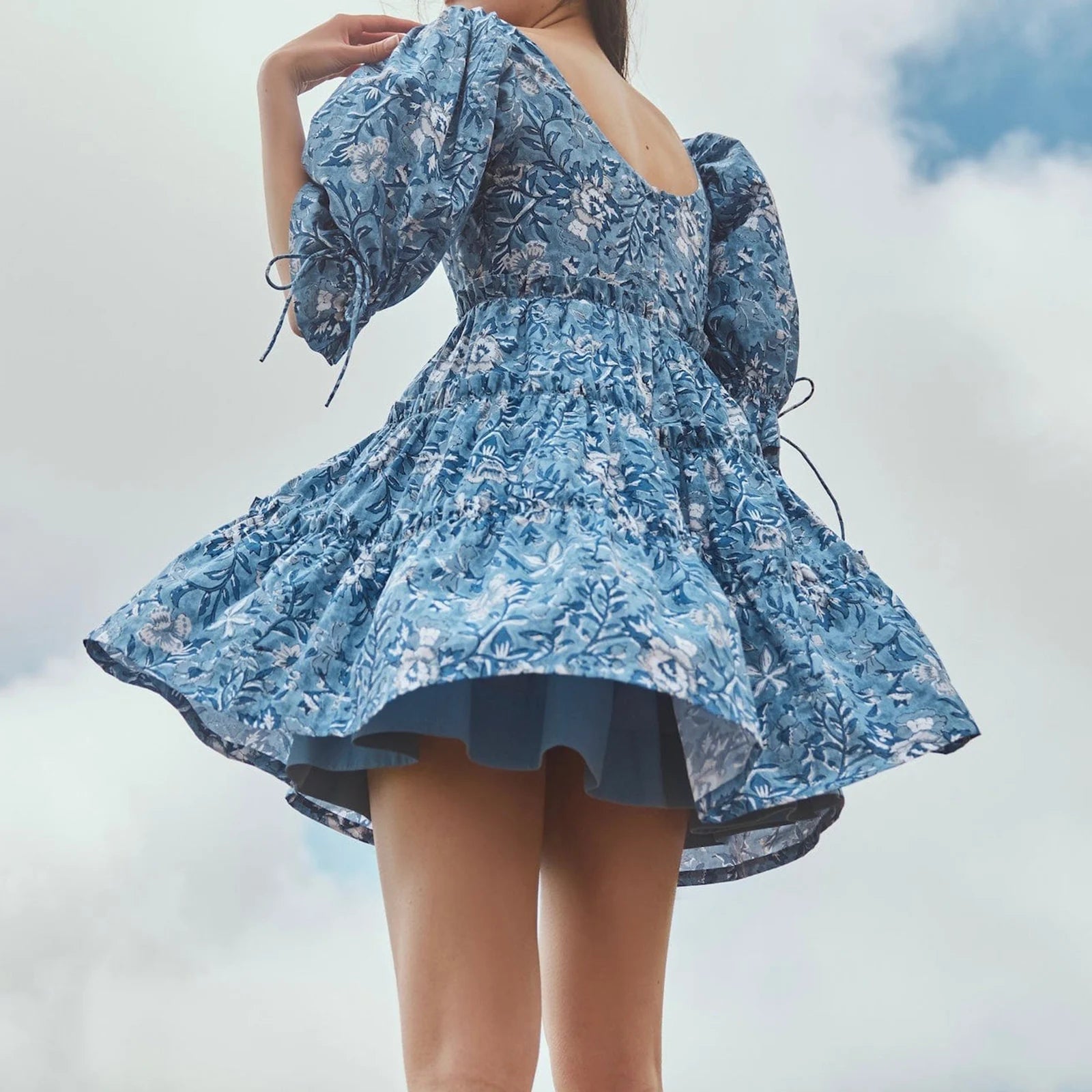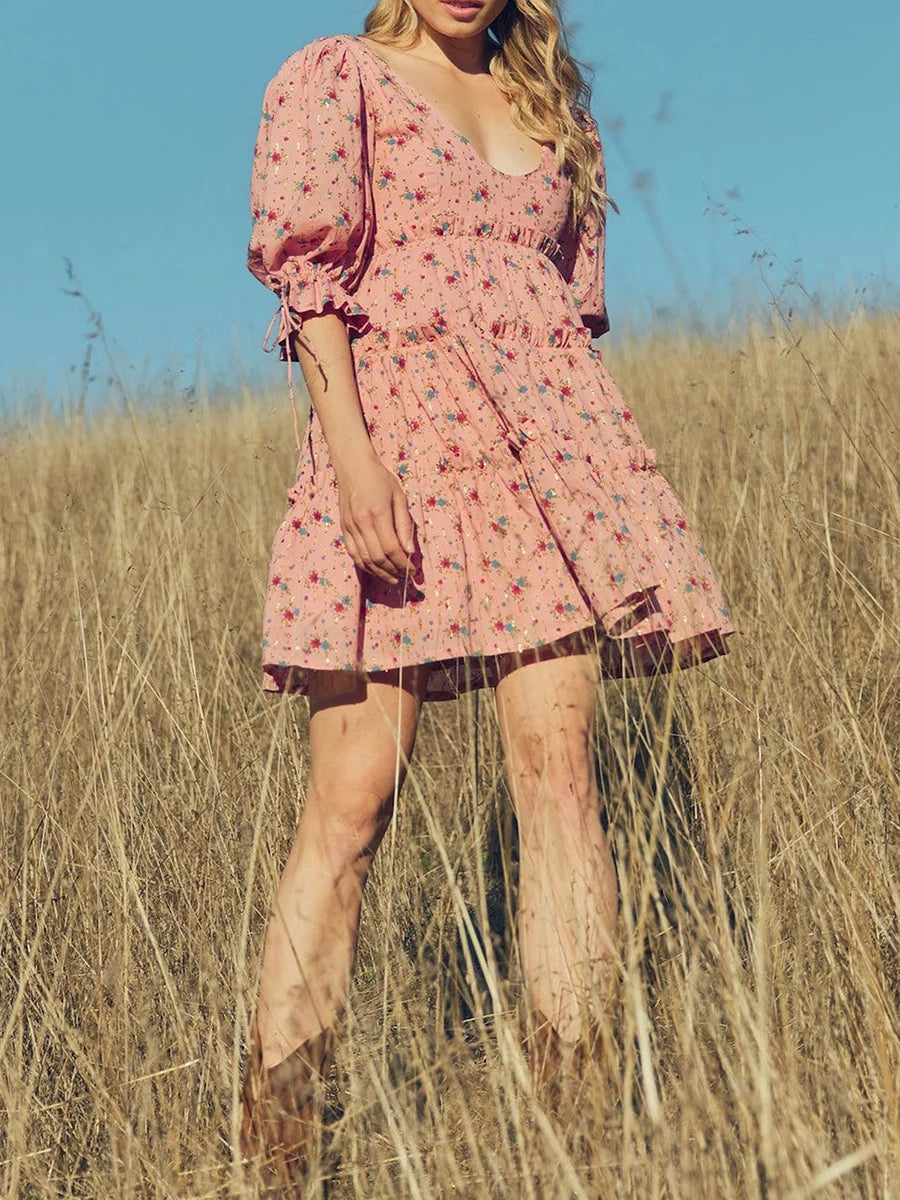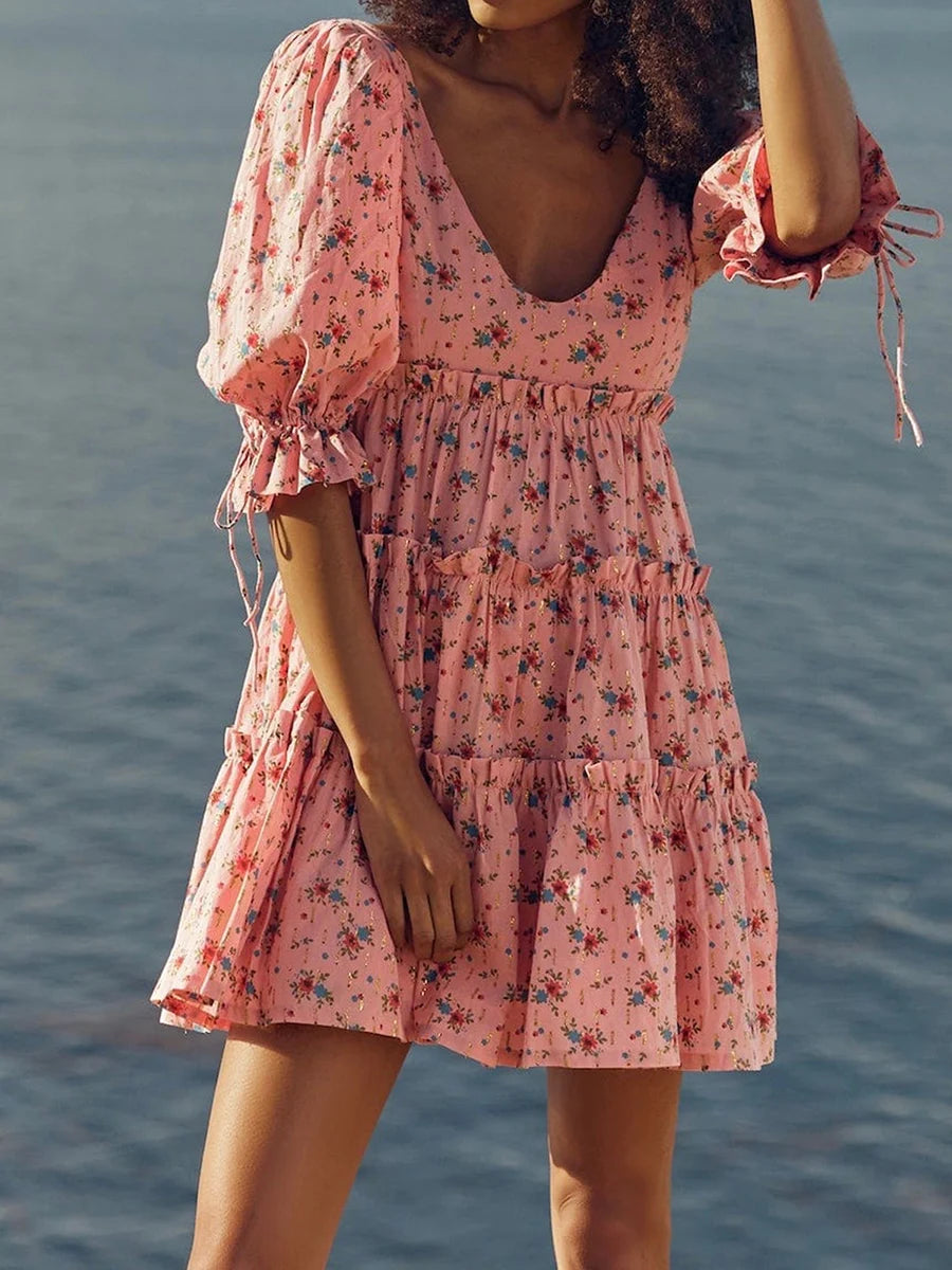 Cyflymder Womens Bohemian Puff Sleeve Dress Boho V-Neck Ruffle Layered Hem Mini Dress Floral Flowy Ruffle Tiered Short Dresses
