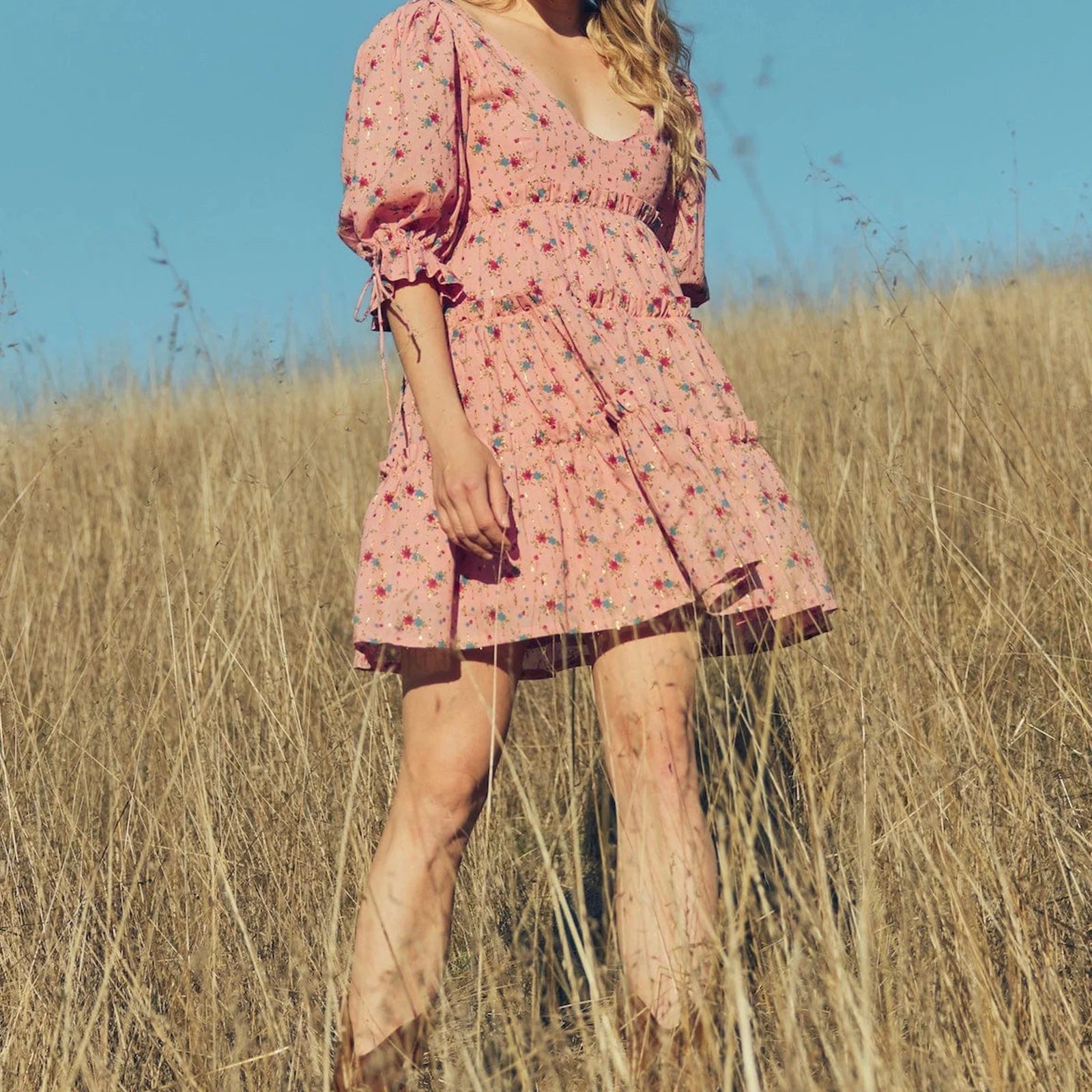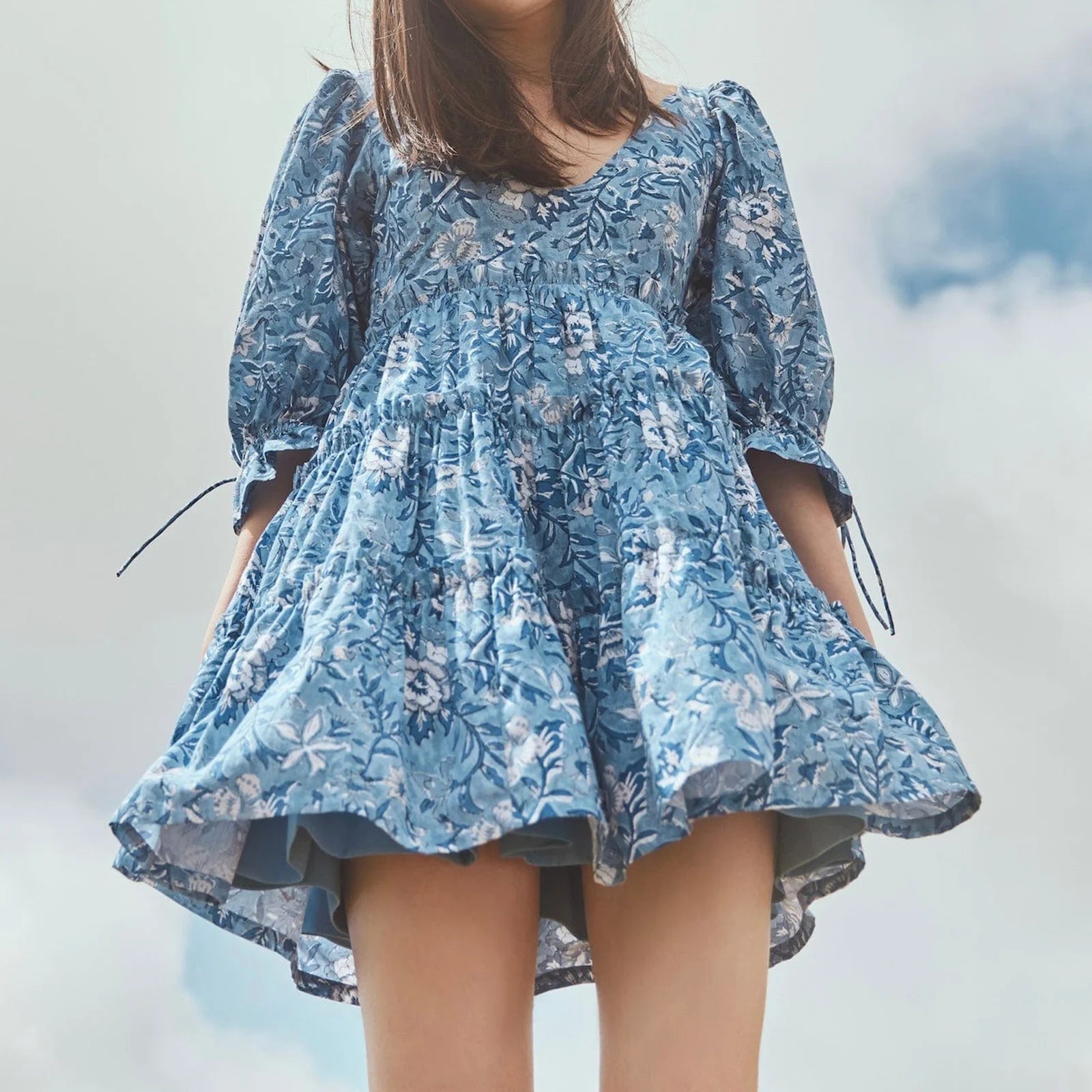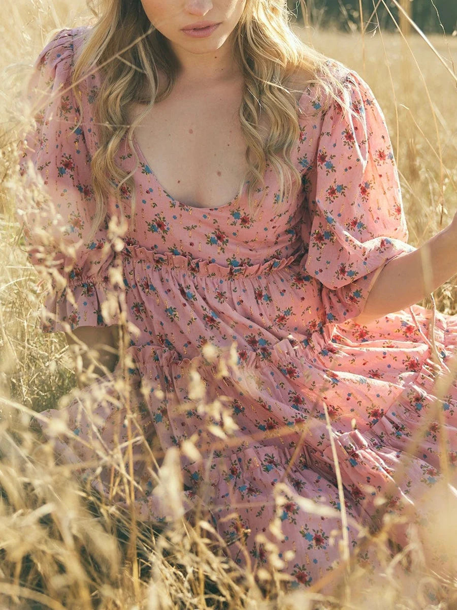 Cyflymder Womens Bohemian Puff Sleeve Dress Boho V-Neck Ruffle Layered Hem Mini Dress Floral Flowy Ruffle Tiered Short Dresses