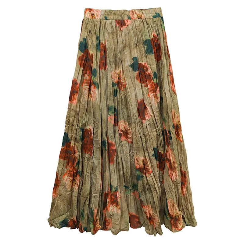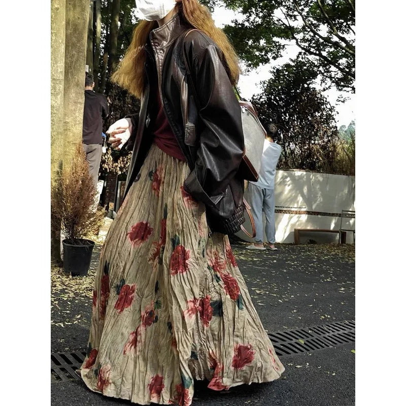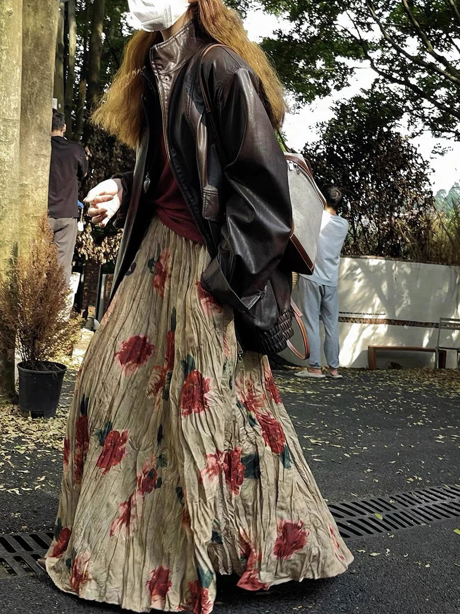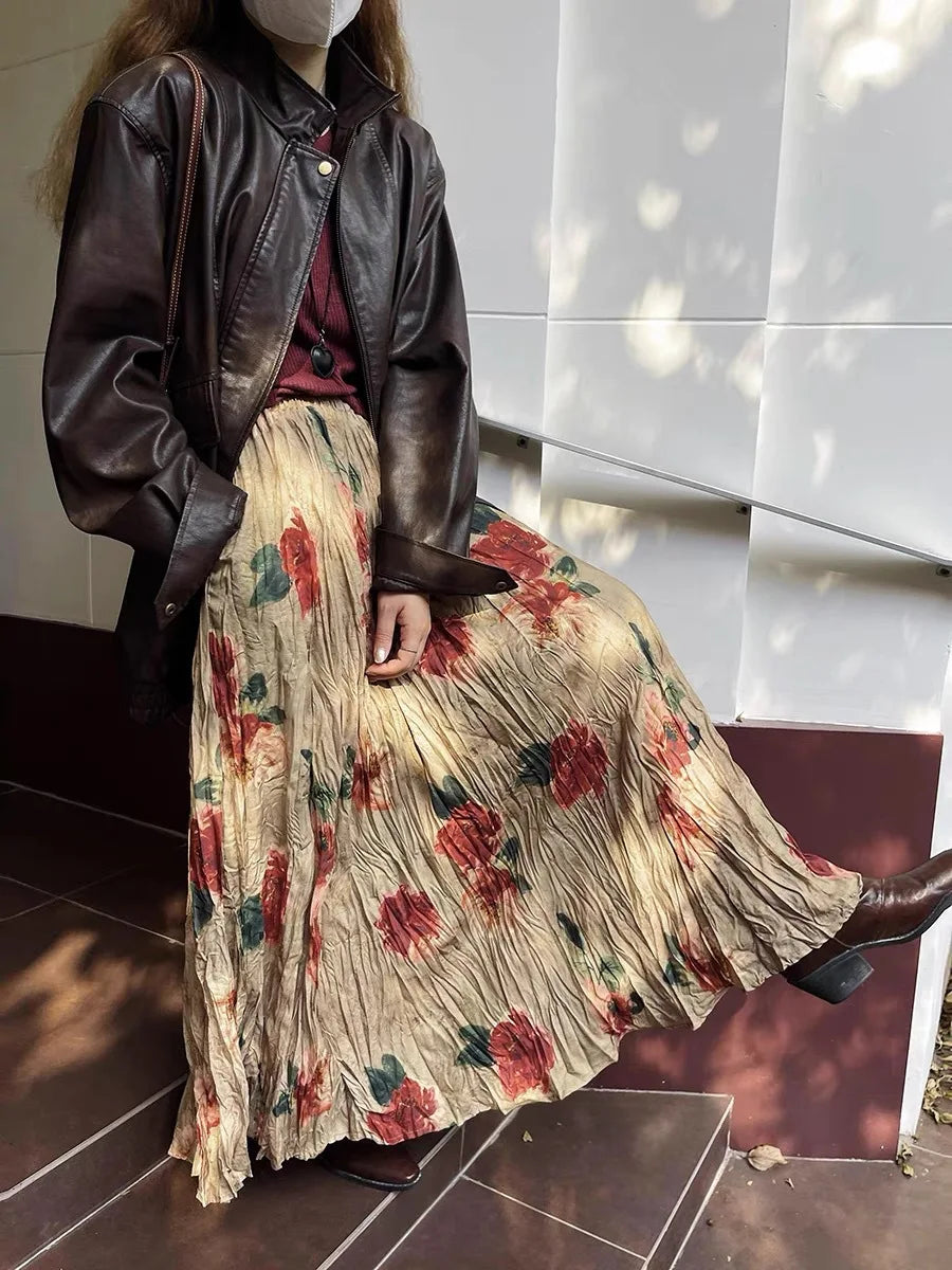 Cyflymder Women's Clothing High-end Retro Blurred Rose Full Skirt High Waist Draped Pleated A-line Pleated Skirt Printed Half Skirt