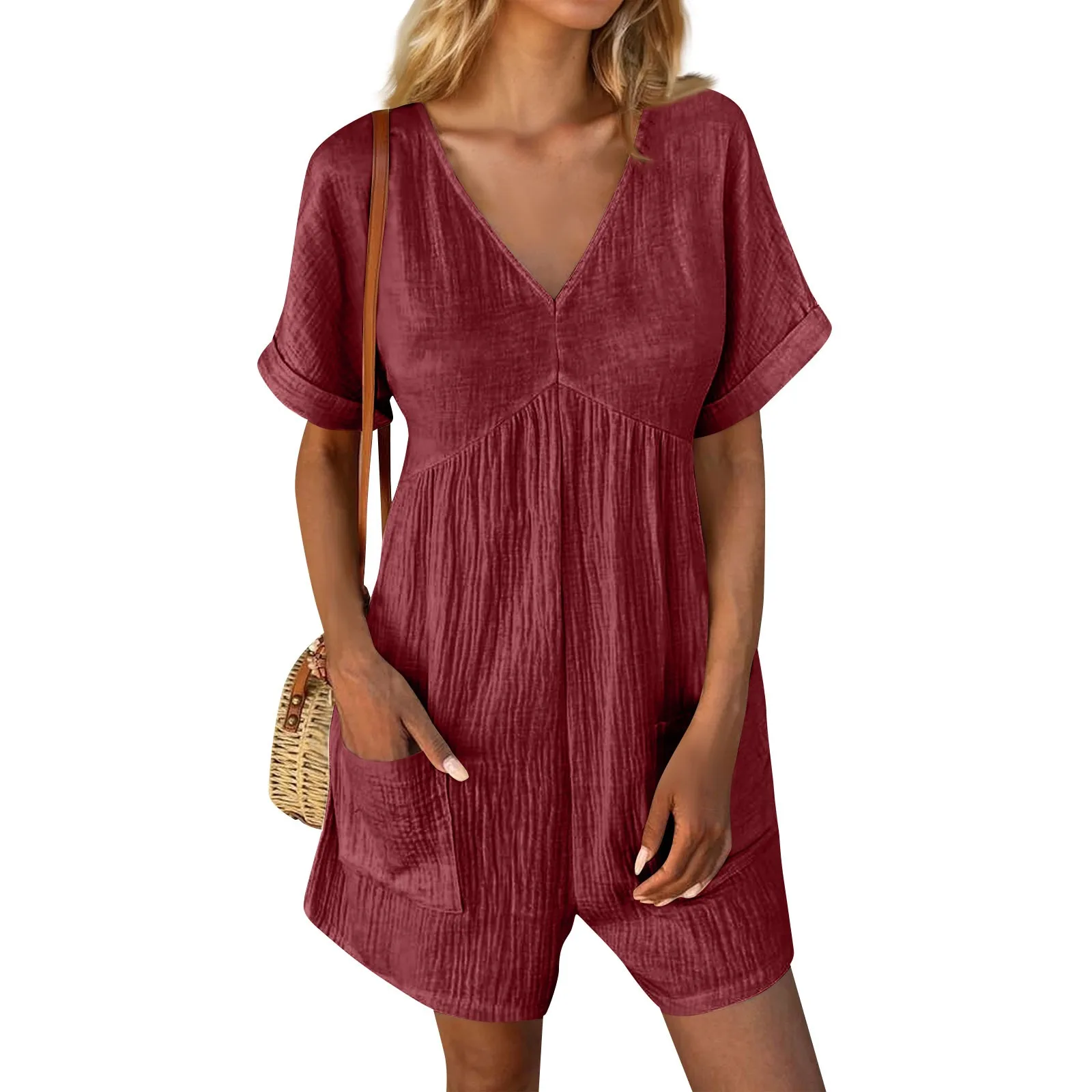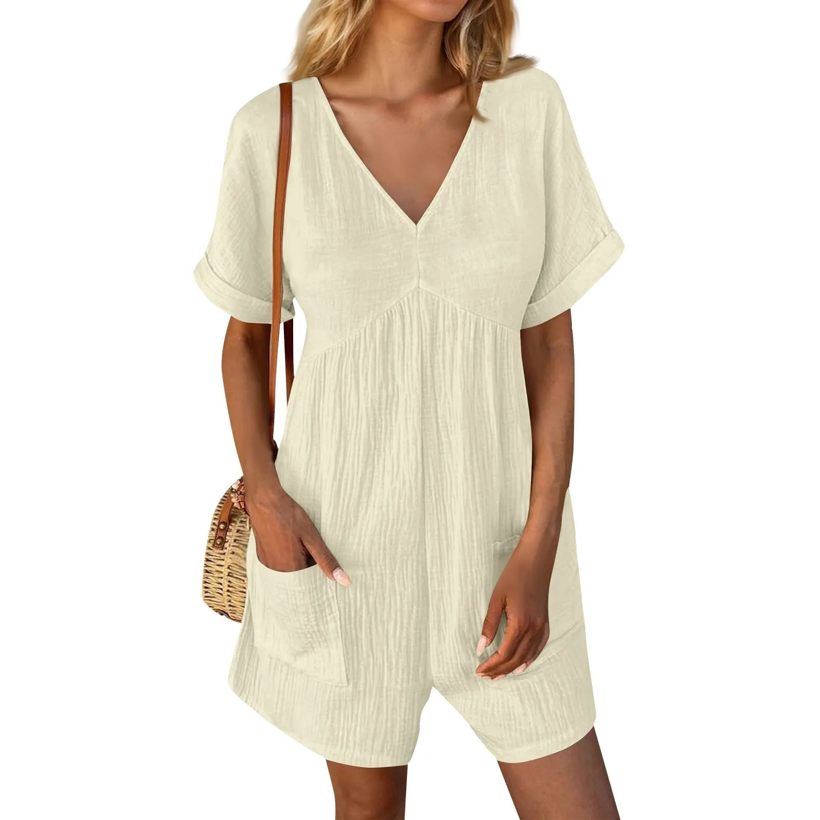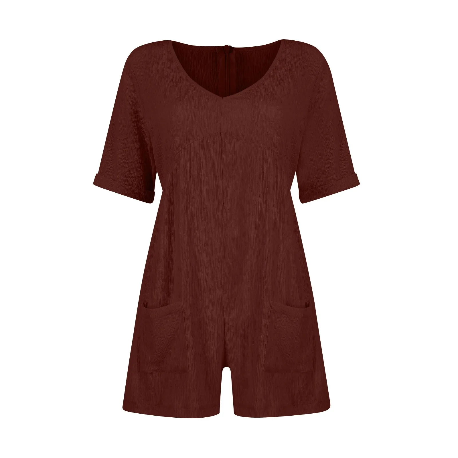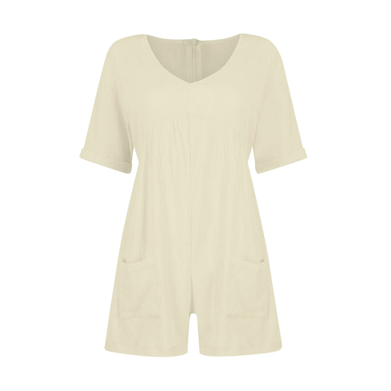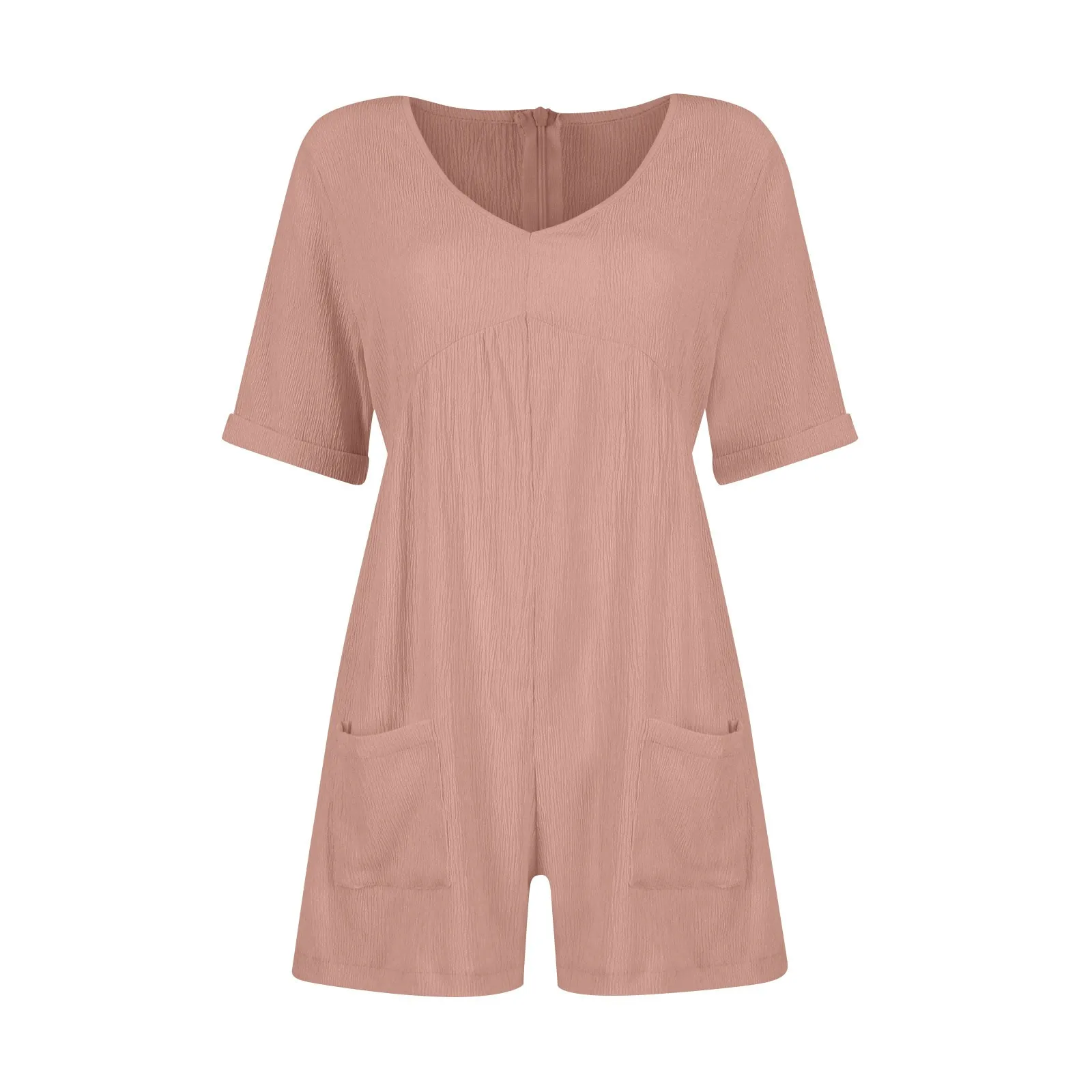 Cyflymder Women's Daily Date Fashion Solid Color Deep V-Neck Short Sleeve With Pockets Comfort Jumpsuit Streetwear Commuting Skinny Romper