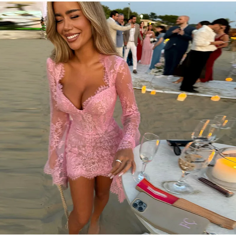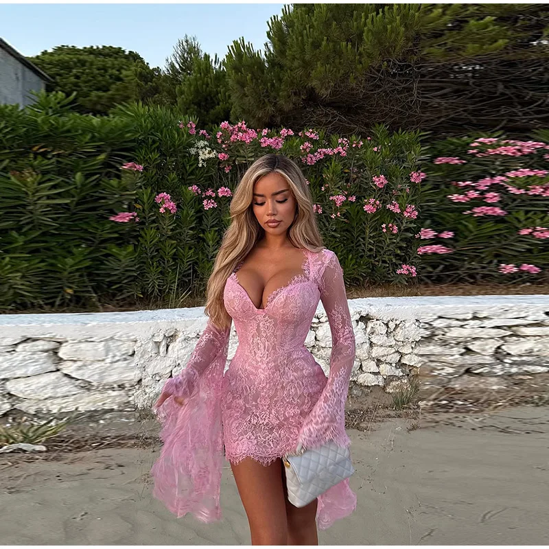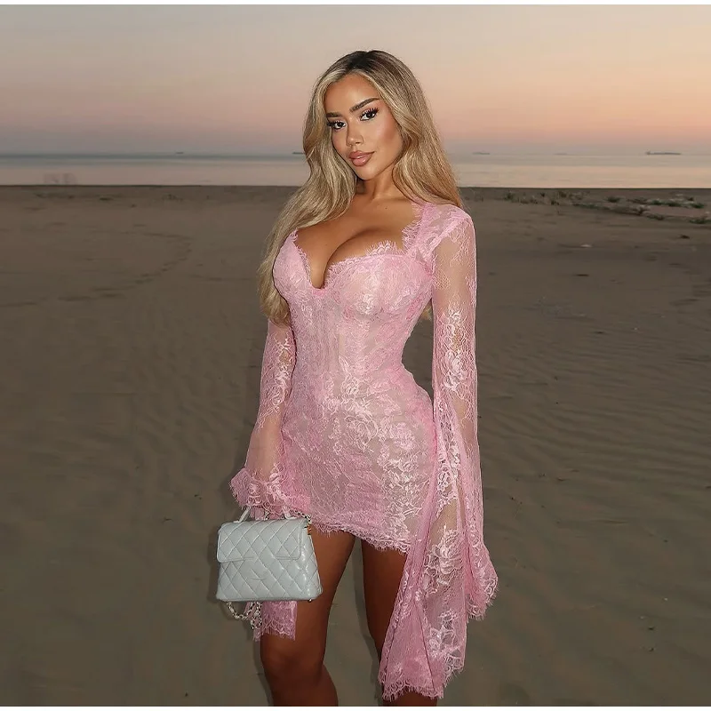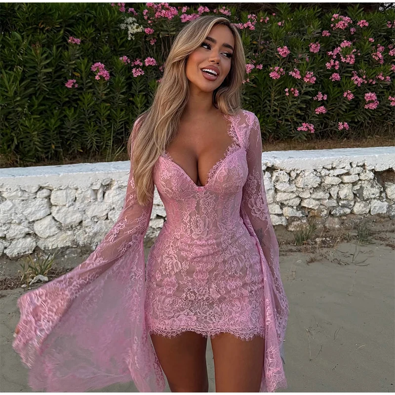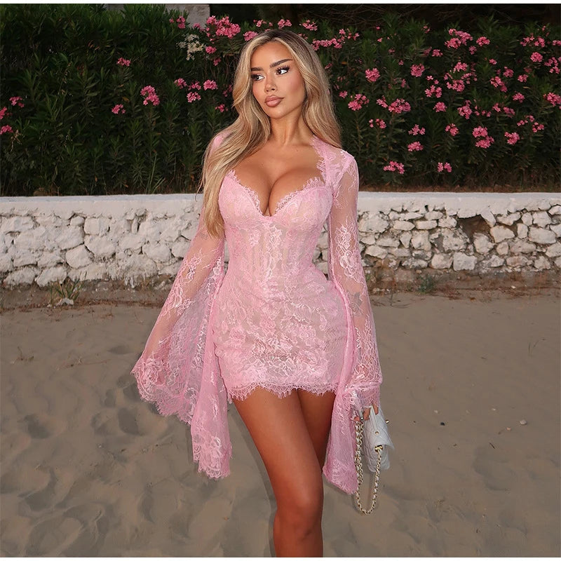 Cyflymder Women's Dress Sexy Lace See Through V- Neck Knitted Flare Sleeve Mini Dresses 2025 Summer Evening Party Lady Vestidos