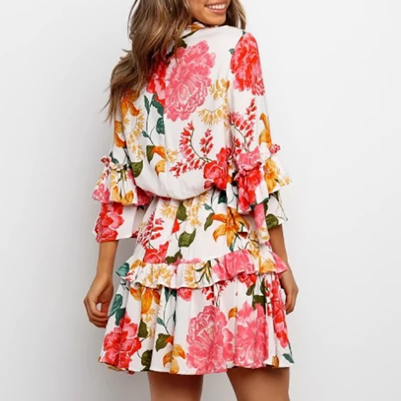 Cyflymder Women's Elegant Bohemian Short Dress Spring Summer Floral Print Lace Up Mini Dress Casual Ruffle O Neck Pullover Dress Vestidos