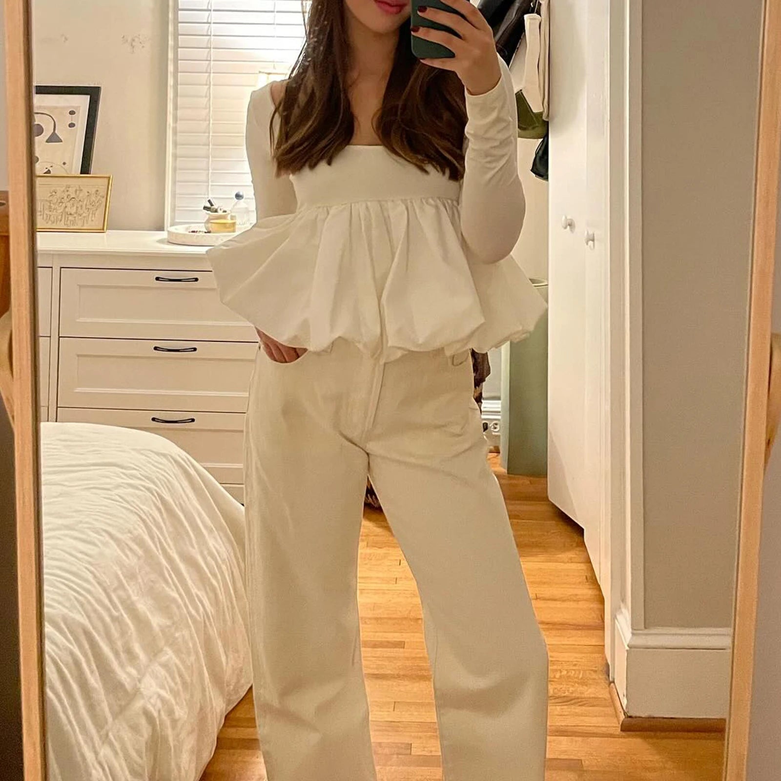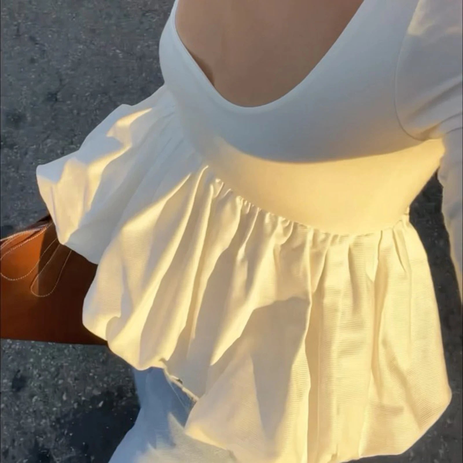 Cyflymder Women's Elegant Bubble Bud Shirts Tops Backless Frill Hem Square Neck Long Sleeve Crop Tops for Daily Work Office Fashion Tees