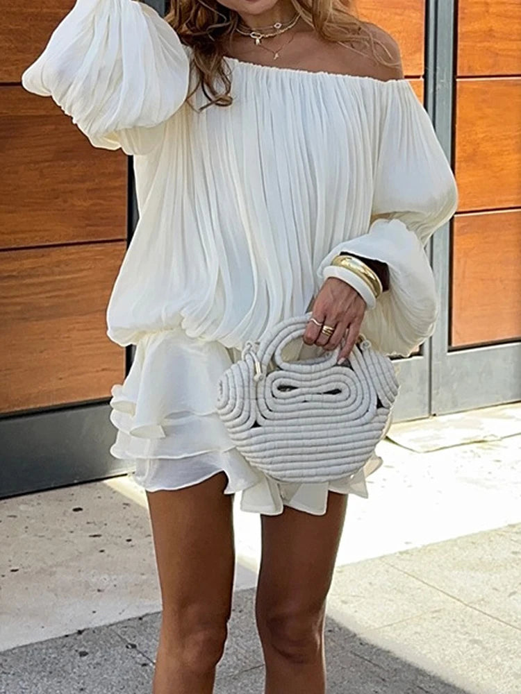 Cyflymder Women's Elegant Off Shoulder Long Sleeve Dress Fashion Temperament Hight Waist Short Dress Casual Draped Solid Ruffle Mini Dress