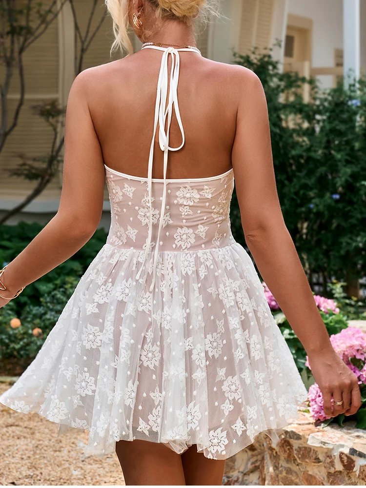 Cyflymder Women's Halter Backless Lace Mesh Mini Dress Zipper A-line Double Layer Fashion Streetwear Party Short Dresses White