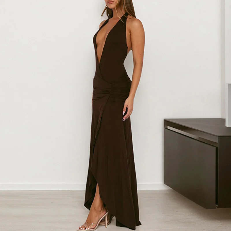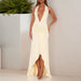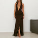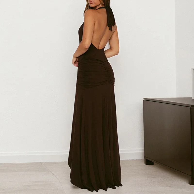 Cyflymder Women's Halter Pleated Long Dress New Summer Hollow Out Sleeveless Slim Fit Party Dress Elegant Solid Color Wrap Hip Dress