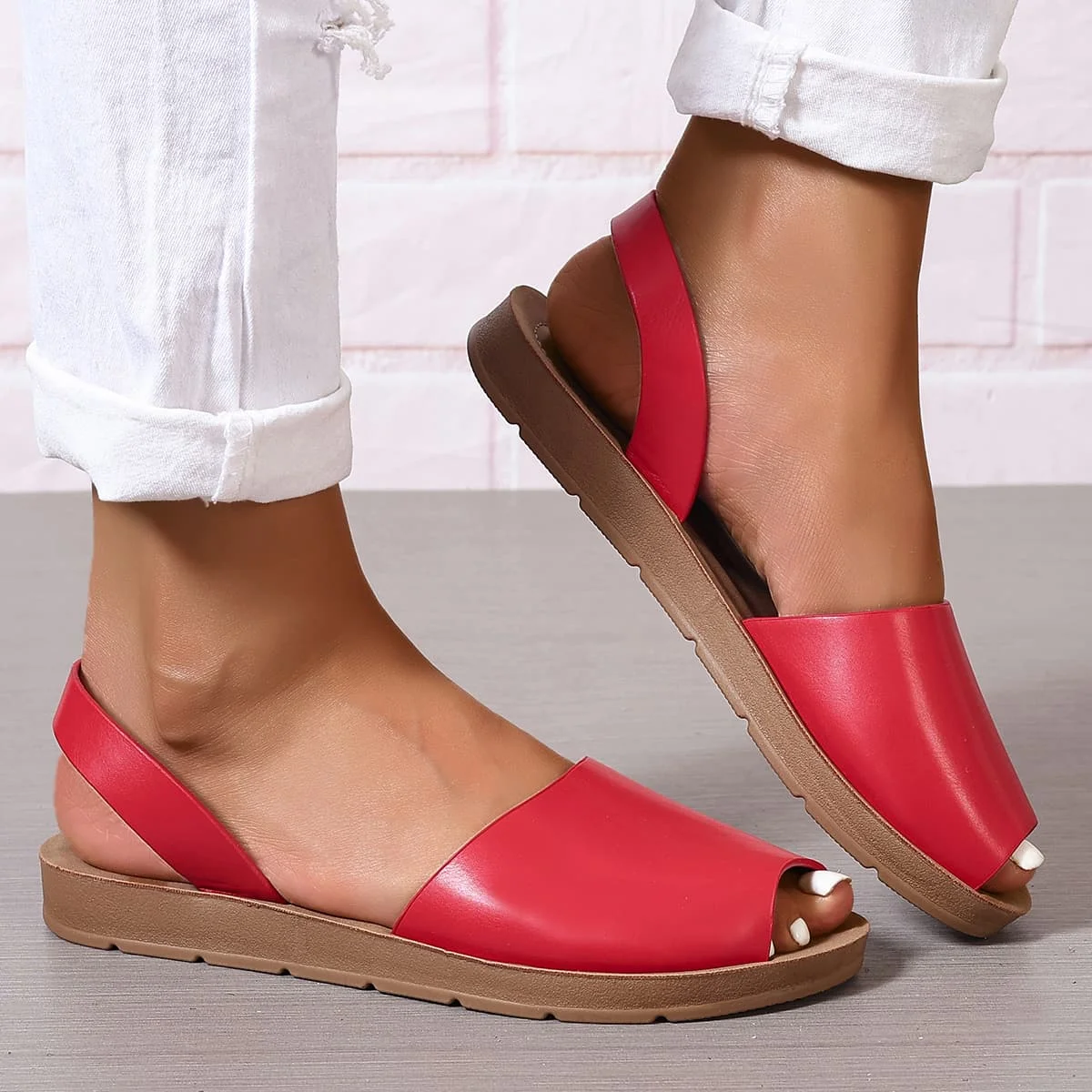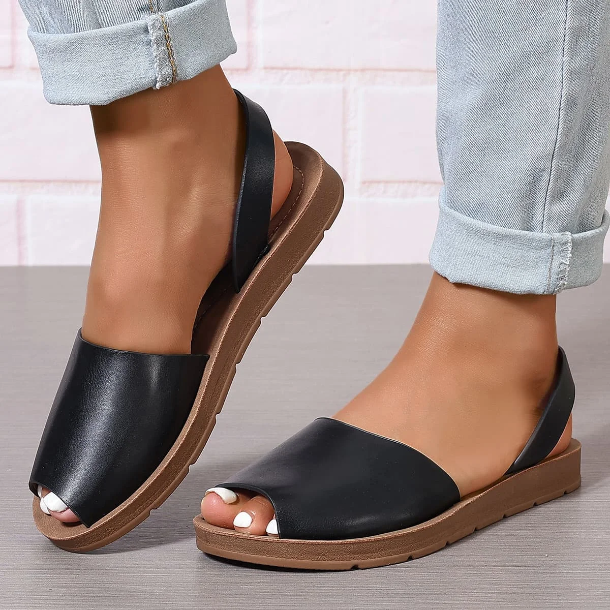 Cyflymder Women's Peep Toes Back Strap Sandals Woman 2.5 cm Flat Shoes Summer Ladies Barefoot Slip on Sandal White Black 42 43