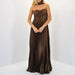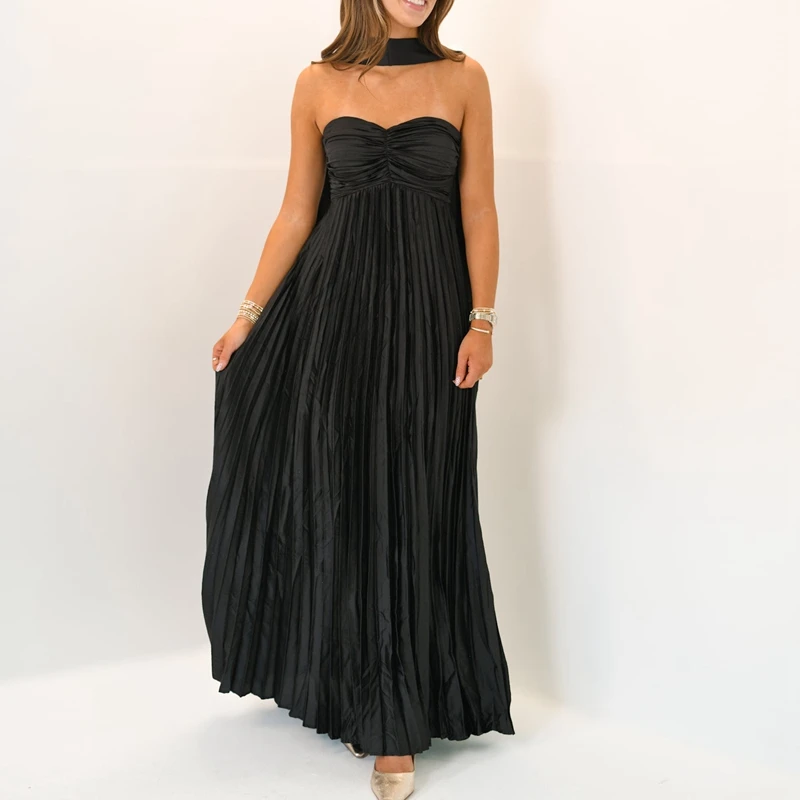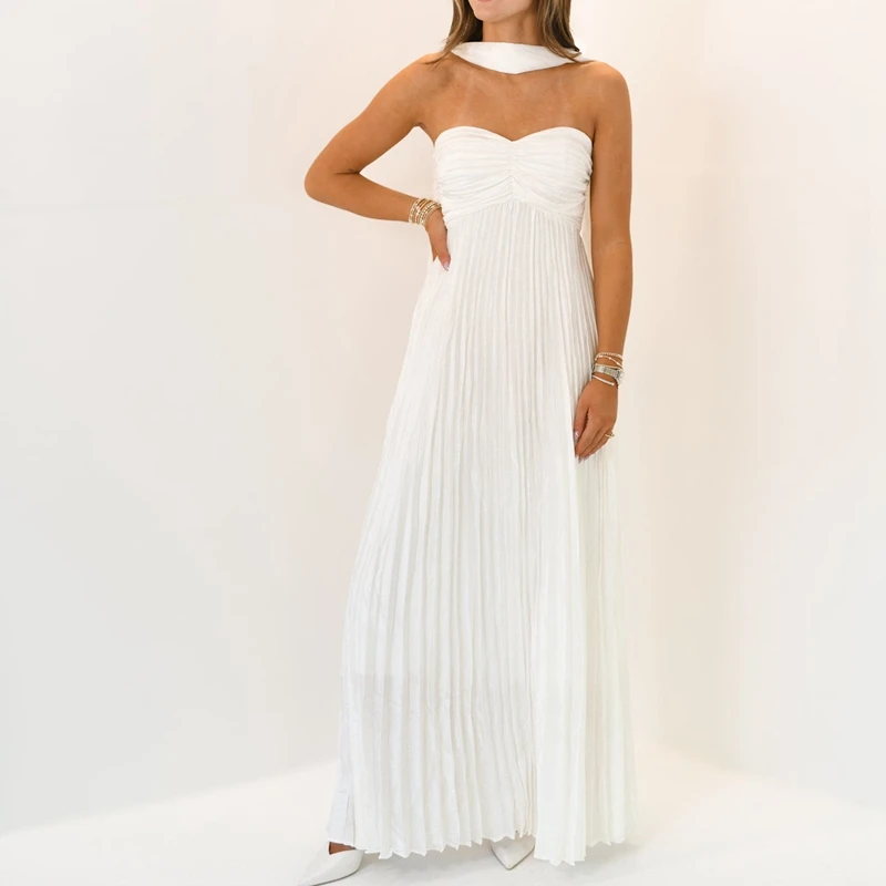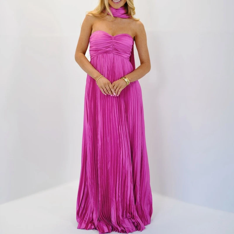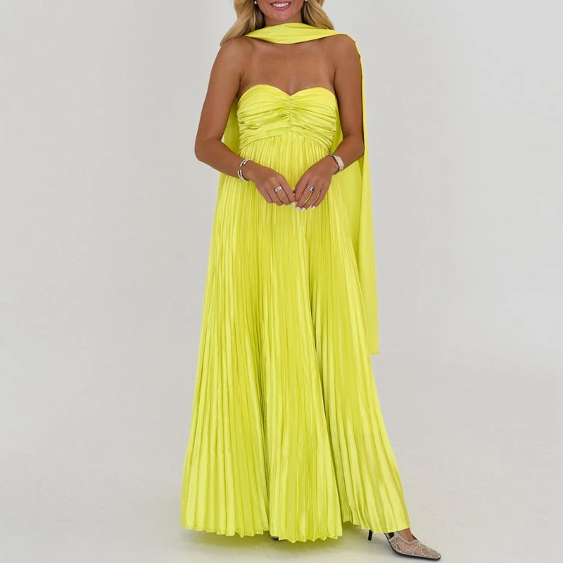 Cyflymder Womens Pleated Strapless Tube Maxi Dress with Scarf Maternity Silk Satin Formal Cocktail Flowy Long Dresses Elegant