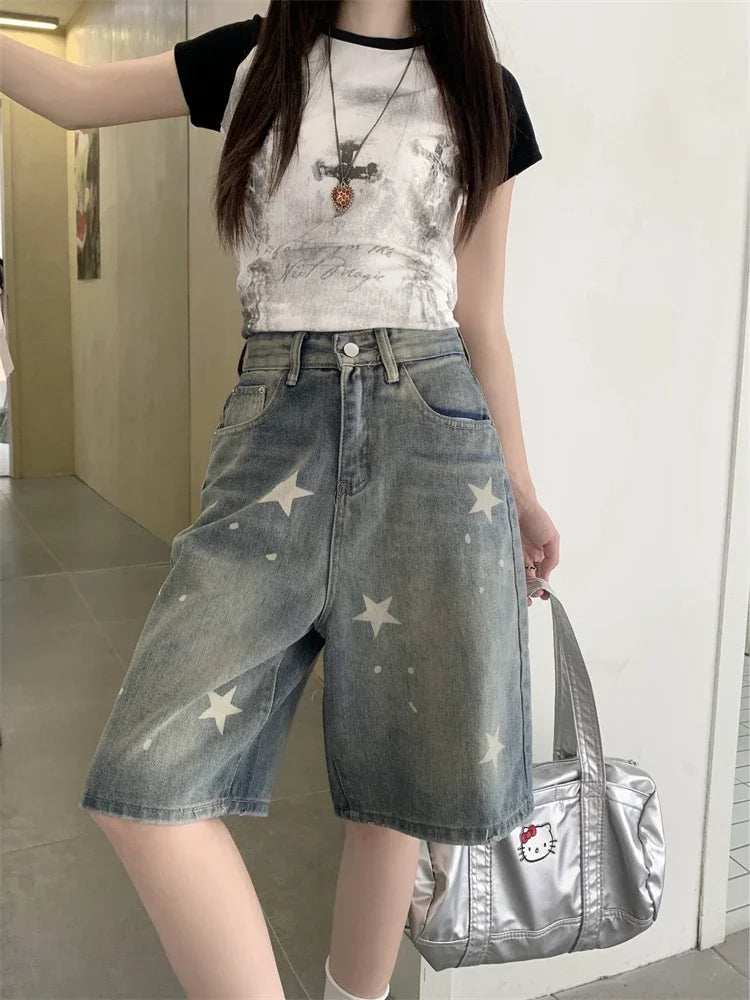 Cyflymder Women's Retro Style Star Print Denim Shorts Summer Quarter Bottoms Wide Leg Capris Female High Waist Straight Kenn-length Jeans