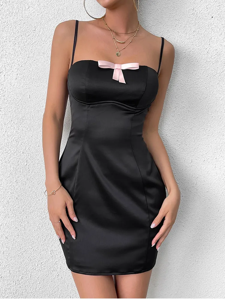 Cyflymder Women's Spaghetti Strap Bow Satin Mini Dress Sleeveless Backless Sexy Party Club Short Dresses Black Summer