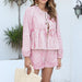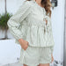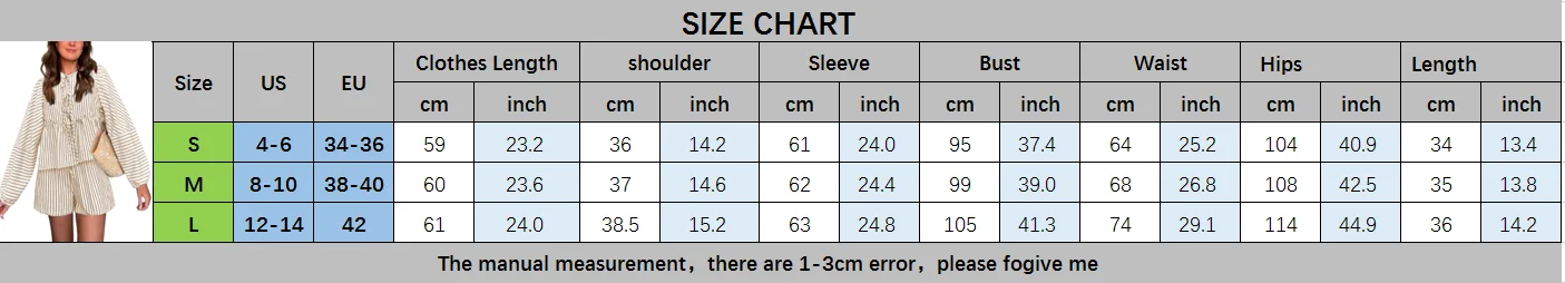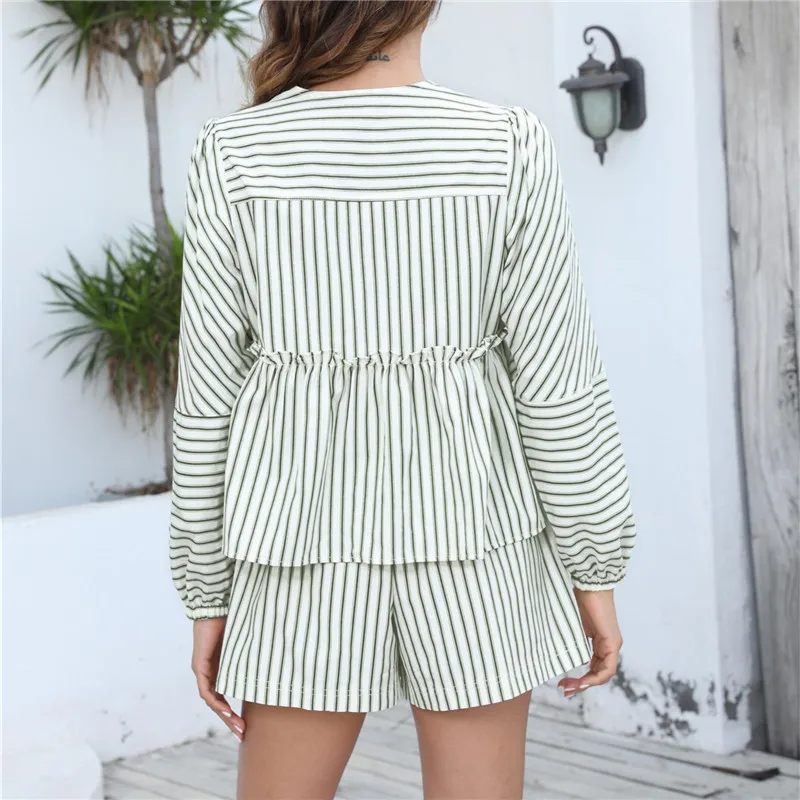 Cyflymder Women's Striped Outfit Set Tiered Long Sleeve Tie-Up Shirt and Elastic Waist Shorts Casual 2 Piece Set for Fall